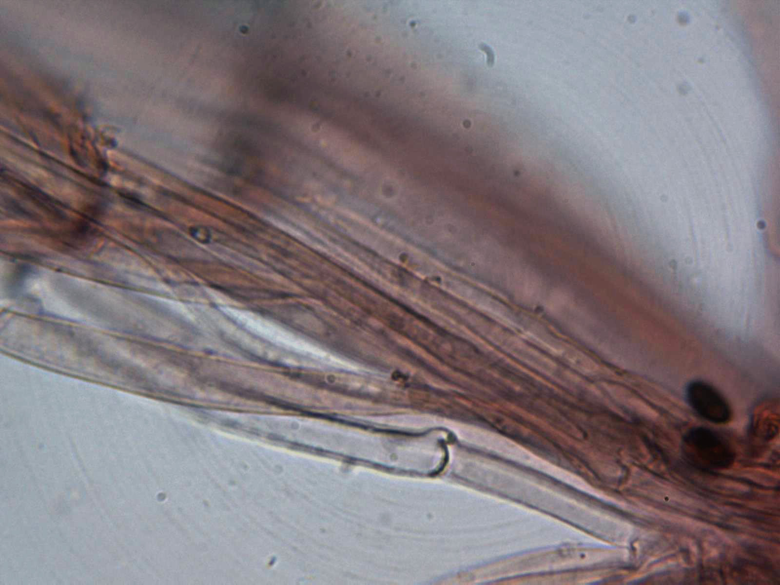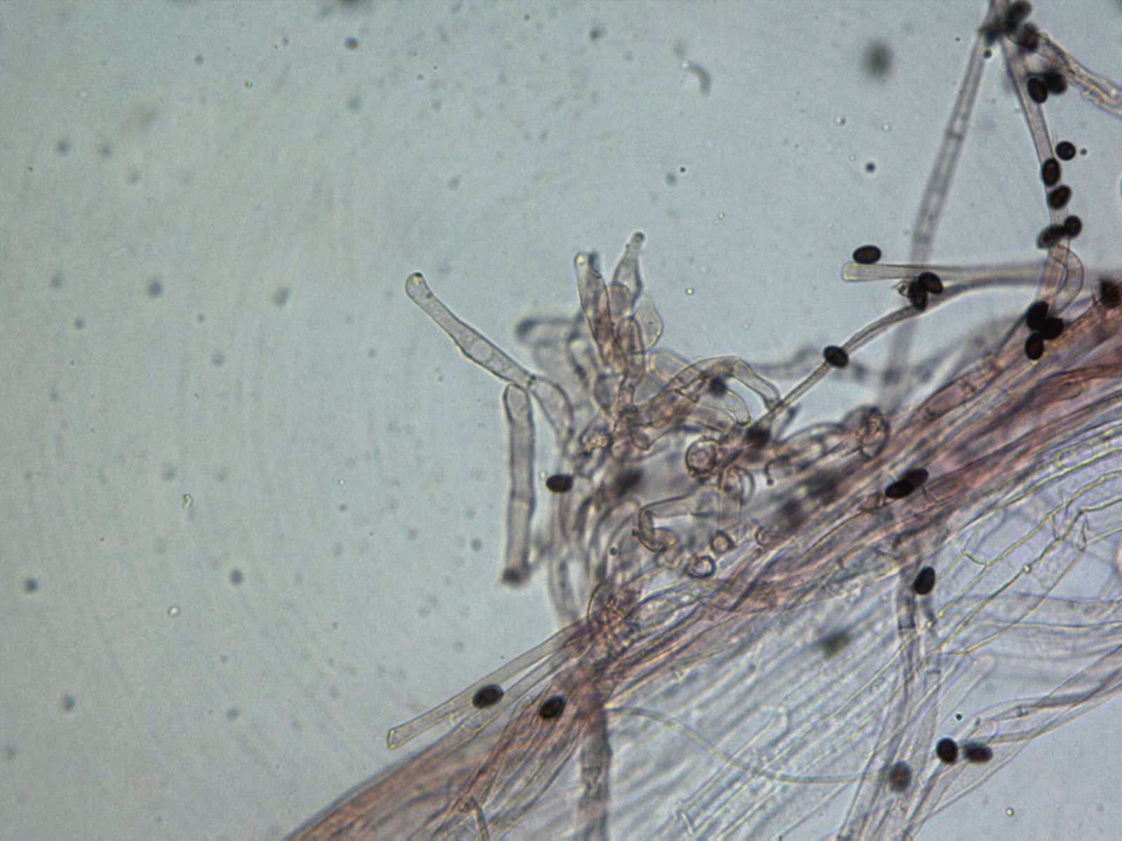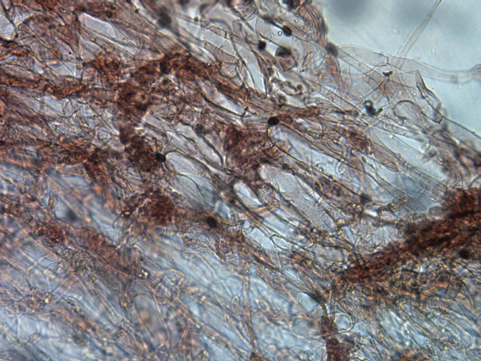 Por debajo de la suprapellis pude observar unas hifas anchas dispuestas paralelamente y algunas provistas de pequeñas fíbulas.