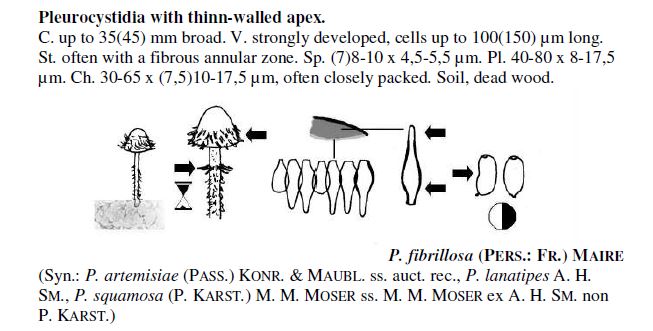 Muchas gracias a los cuatro. para Koldobika si bien hay algunos autores que tienden a sinonimizar la Psathyrella fibrillosa con la Psathyrella friesii, en las claves aparecen como dos especies distintas, dejo un pantallazo de cada una de ellas, en mi estudio me pareció que mi propuesta encajaba mejor con la Psathyrella fibrillosa, las paredes de los cistidios me parecen un poco gruesas, aunque en estos momentos ya no lo tengo tan claro