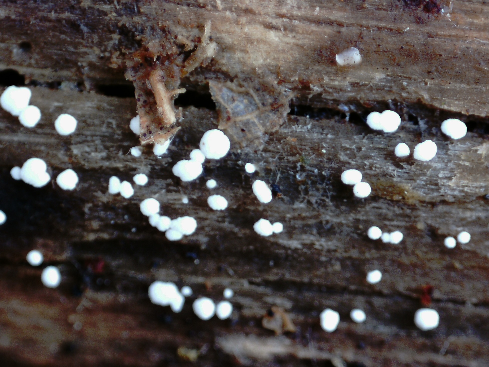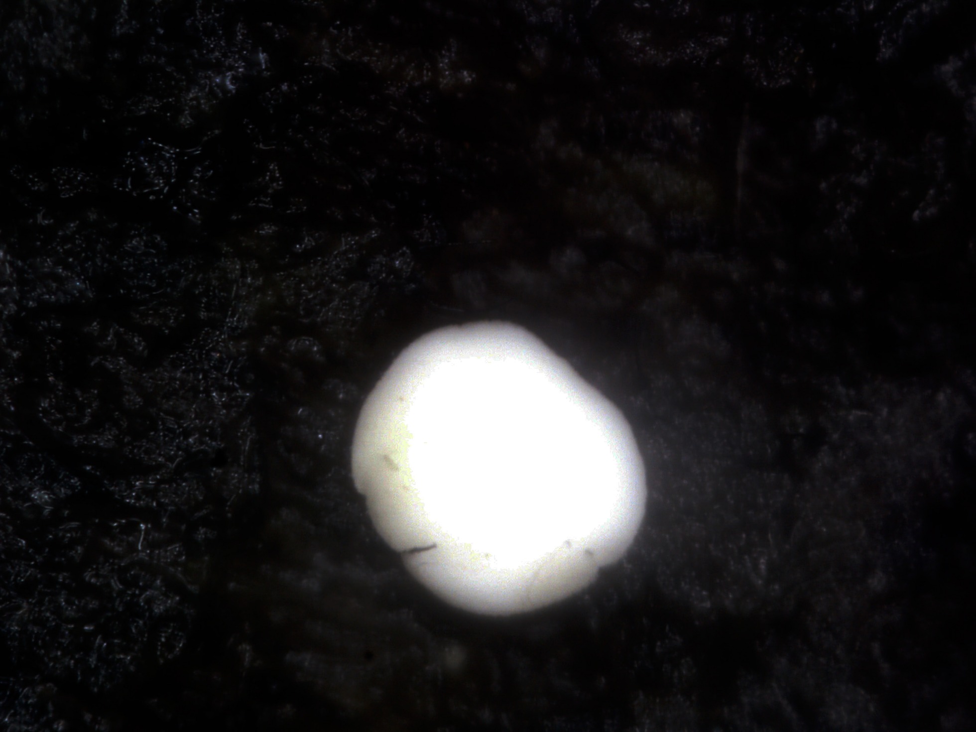 Imagen a 20 aumentos de la misma, de muy diminuto tamaño, los de la imagen de entre 0,21 a 0,52 mm., globosos, de color blanco que destaca perfectamente sobre la base, superficie tímidamente granulosa y de consistencia blanda y frágil.