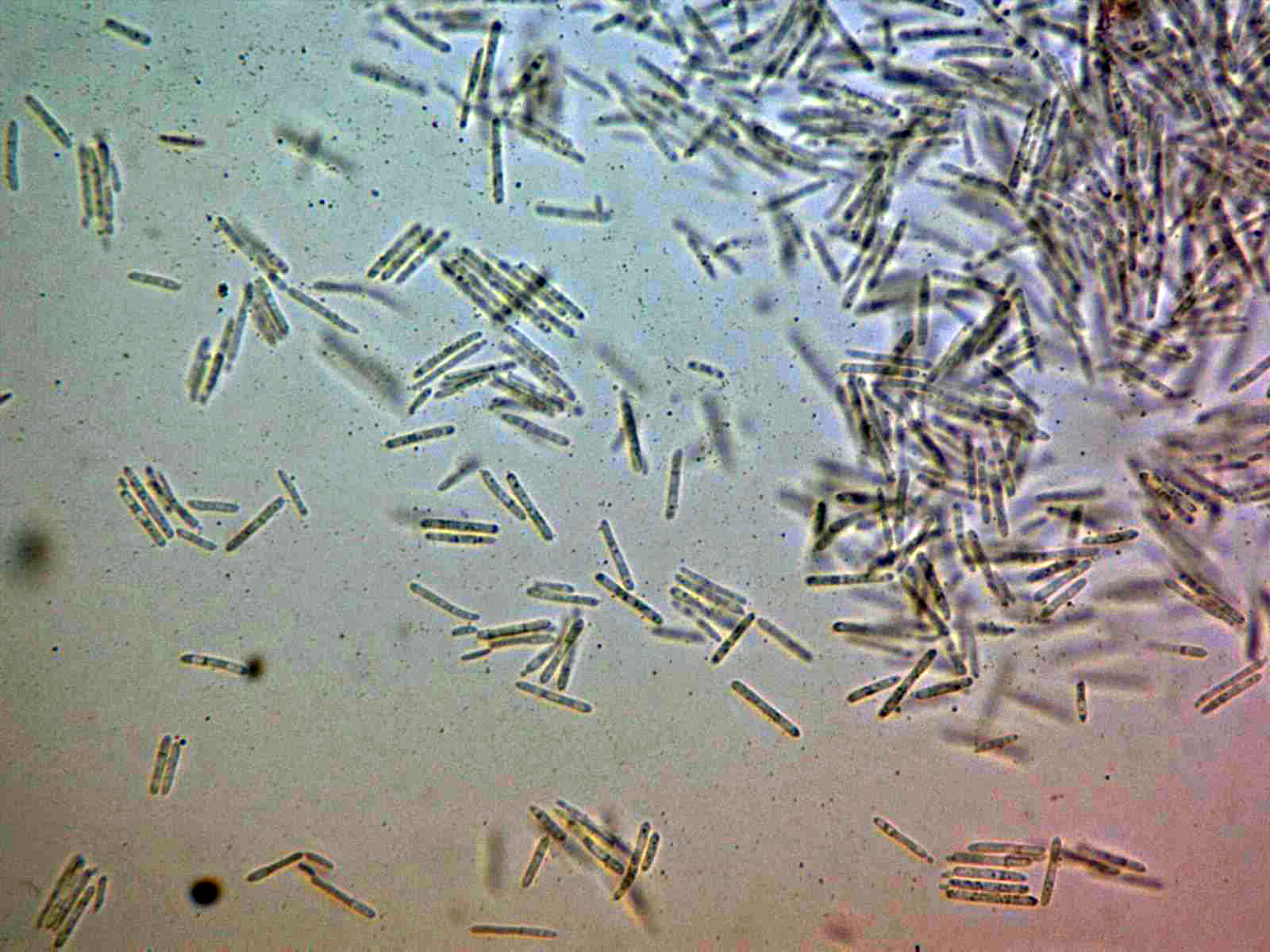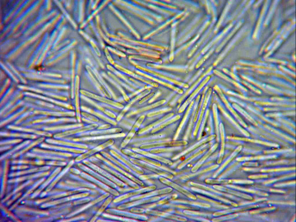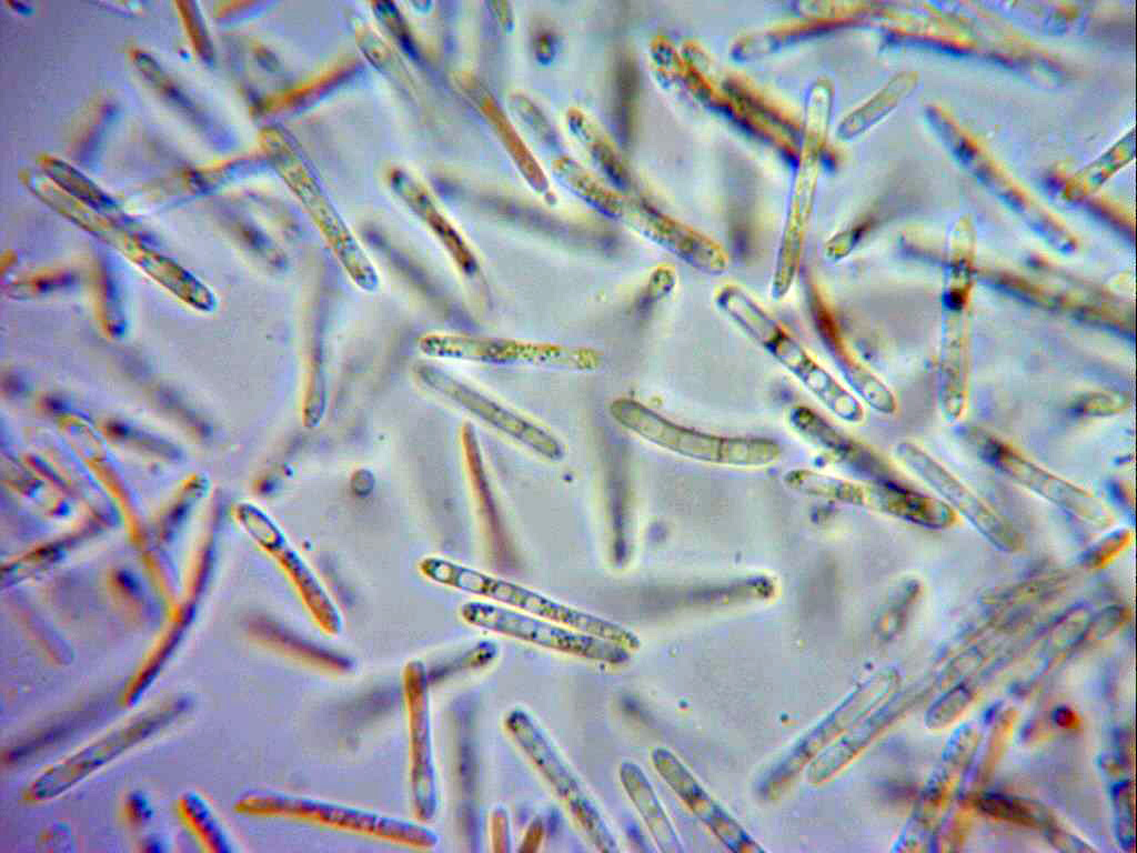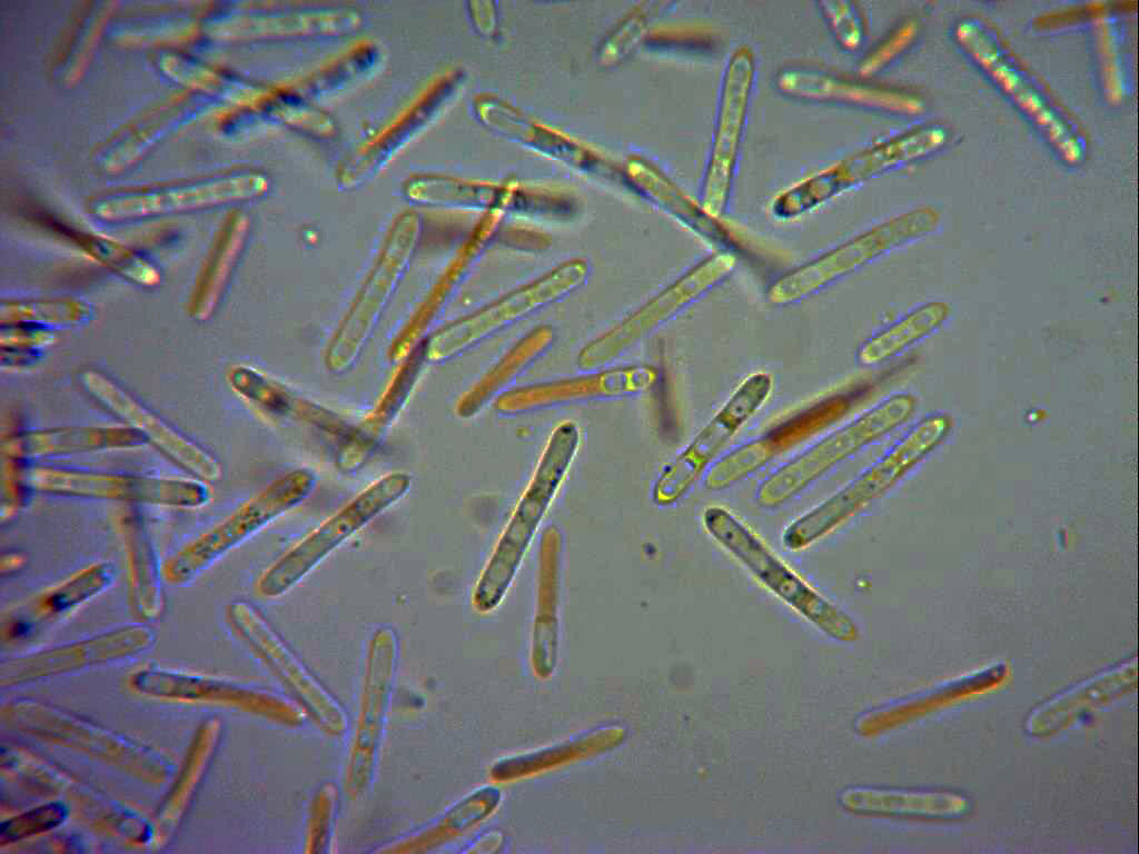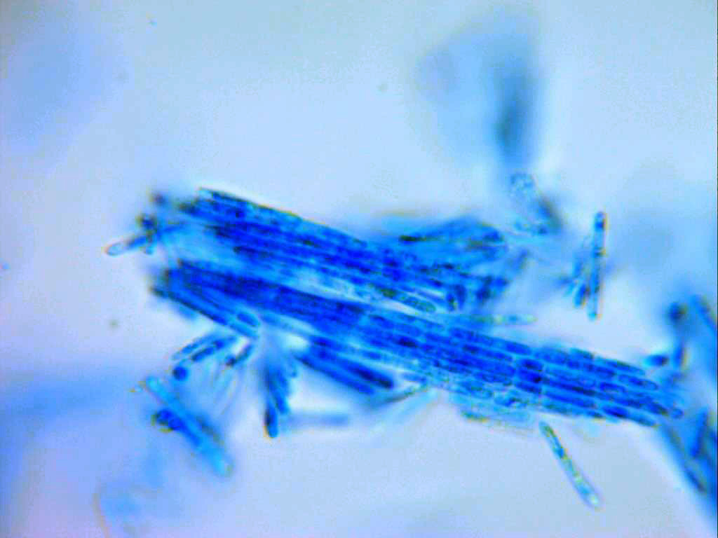 Conidios cilíndricos, alargados, rectos, terminando en formas redondeadas y con gotas y granulaciones en su interior, en mis mediciones de 10,7;18,5 X 1,7;2 micras.