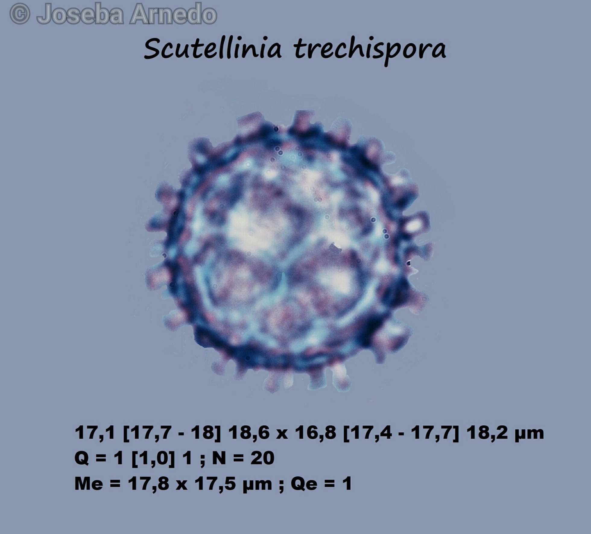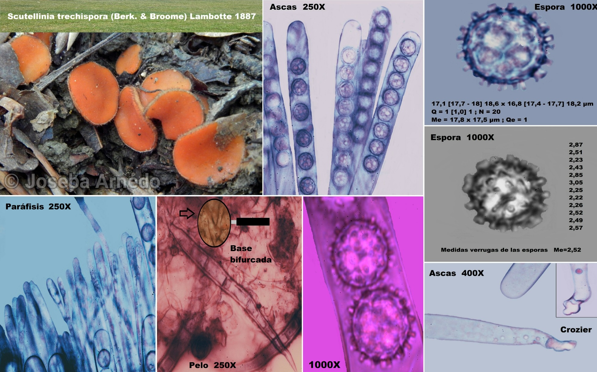 Volviendo a la microscopía que nos muestra Joseba hay un detalle que no me encaja, quizás sea un poco tiquismiquis, pero las esporas dentro del asca donde se indica Esporas 1000X, en la parte de abajo de la imagen y de color violeta, su forma elipsoidal no me cuadra con Scutellinia trechispora, ya que según todos los autores consultados deben ser globosas, según mi parecer me parecen mas propias de Scutellinia scutellata, Scutellinia cejpii o Scutellinia subhirtella, a ver si se te han colado dos Scutellinias distintas en el estudio