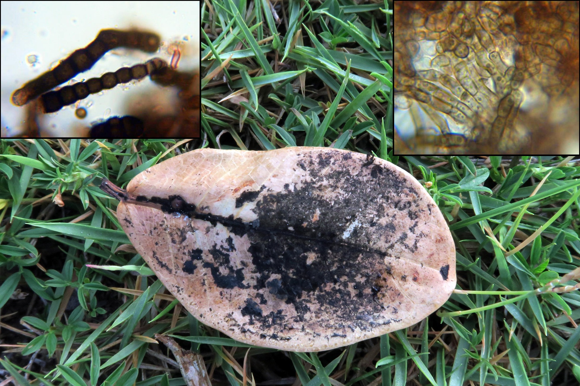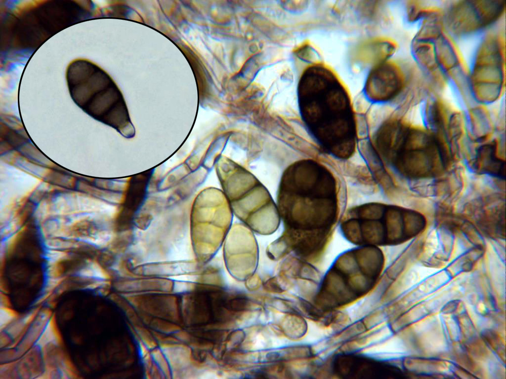 Por la morfología de estos muy probablemente se trate de una Alternaria de la Sección Pseudoulocladium, dentro de estas y por las medidas de los conidios con la que mejor encaja es con la Alternaria aspera, como que en estos casos resulta imposible el asegurar algo sin un análisis molecular y dado que cada día aparecen nuevos taxones, lo dejo como Alternaria aff. aspera.