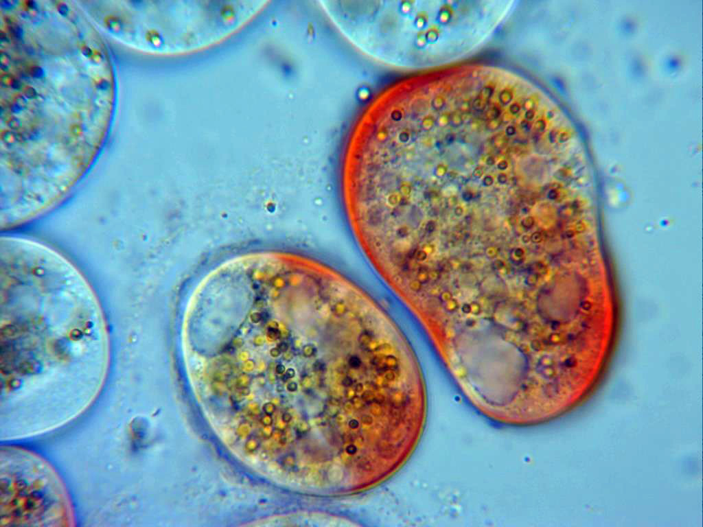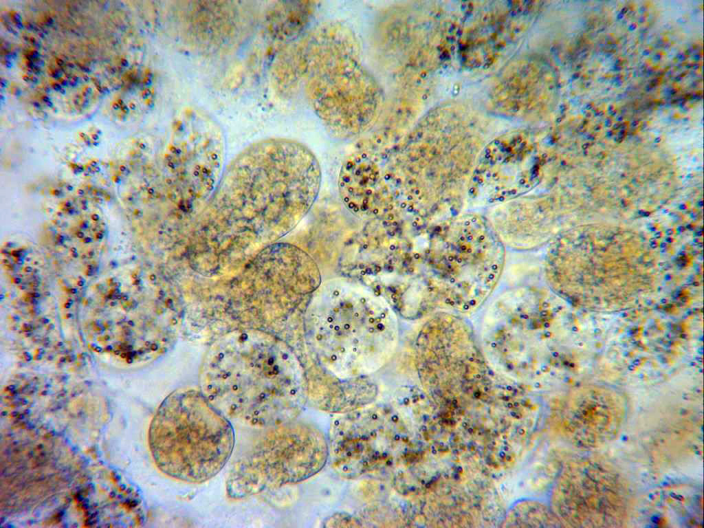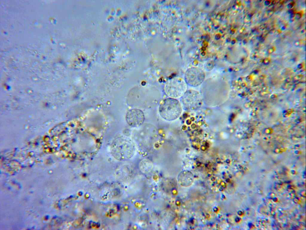 Y por último una imágen a las 48 horas (una vida muy corta), aquí ya aparecen granulos globosos y cerebriformes en el plasmodium.