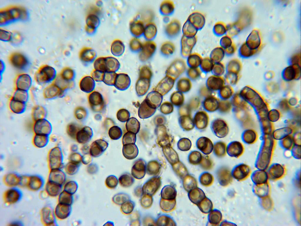Conidios de pequeño tamaño, globosos y con unas medidas de entre 2,3 a 3,2 micras.