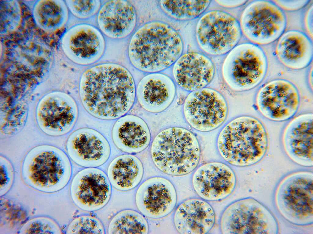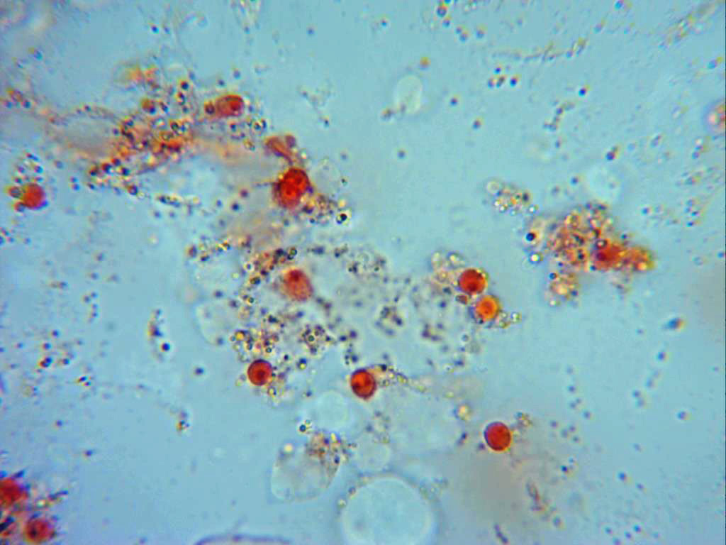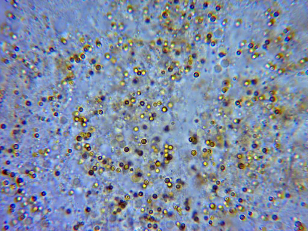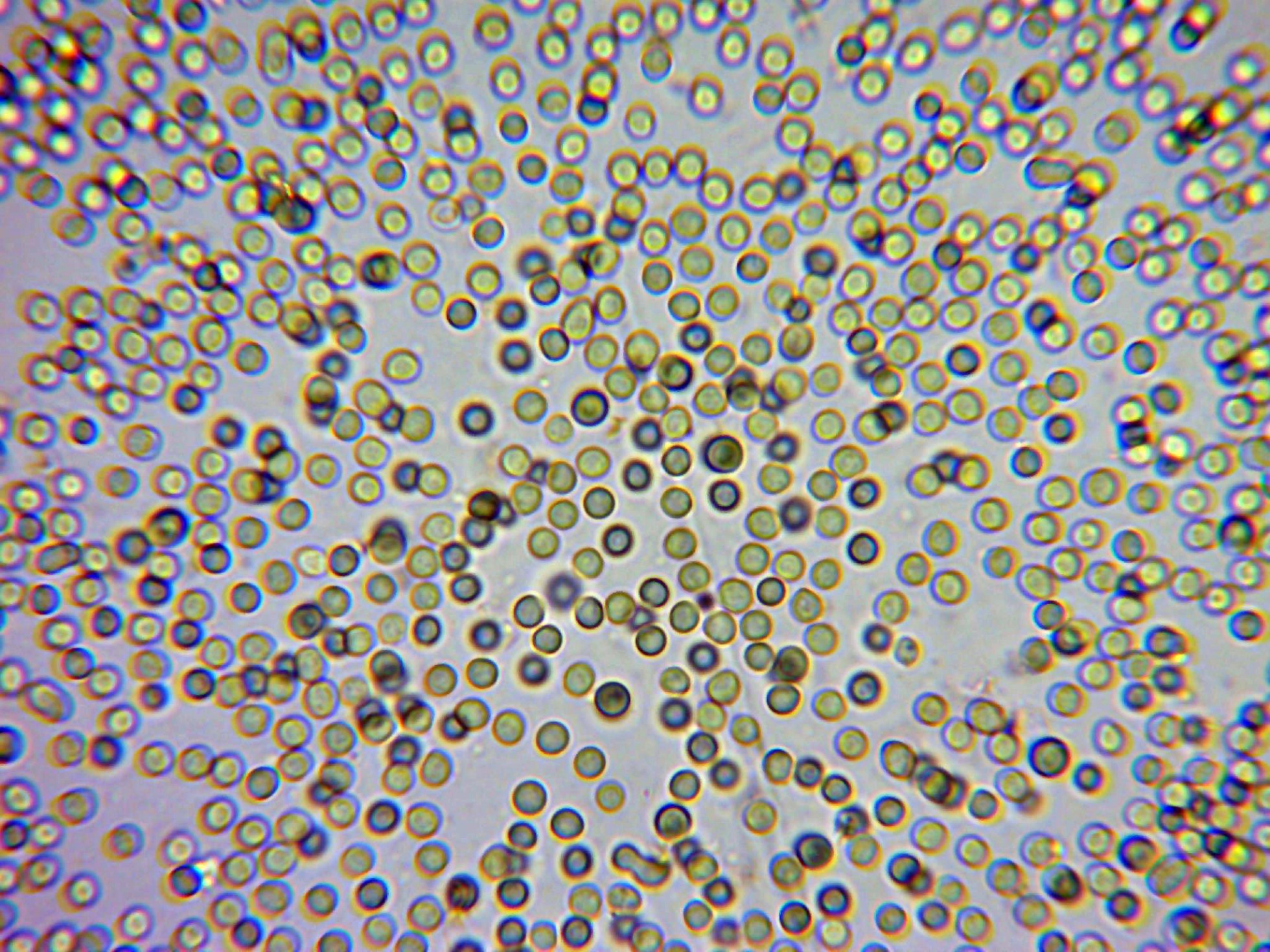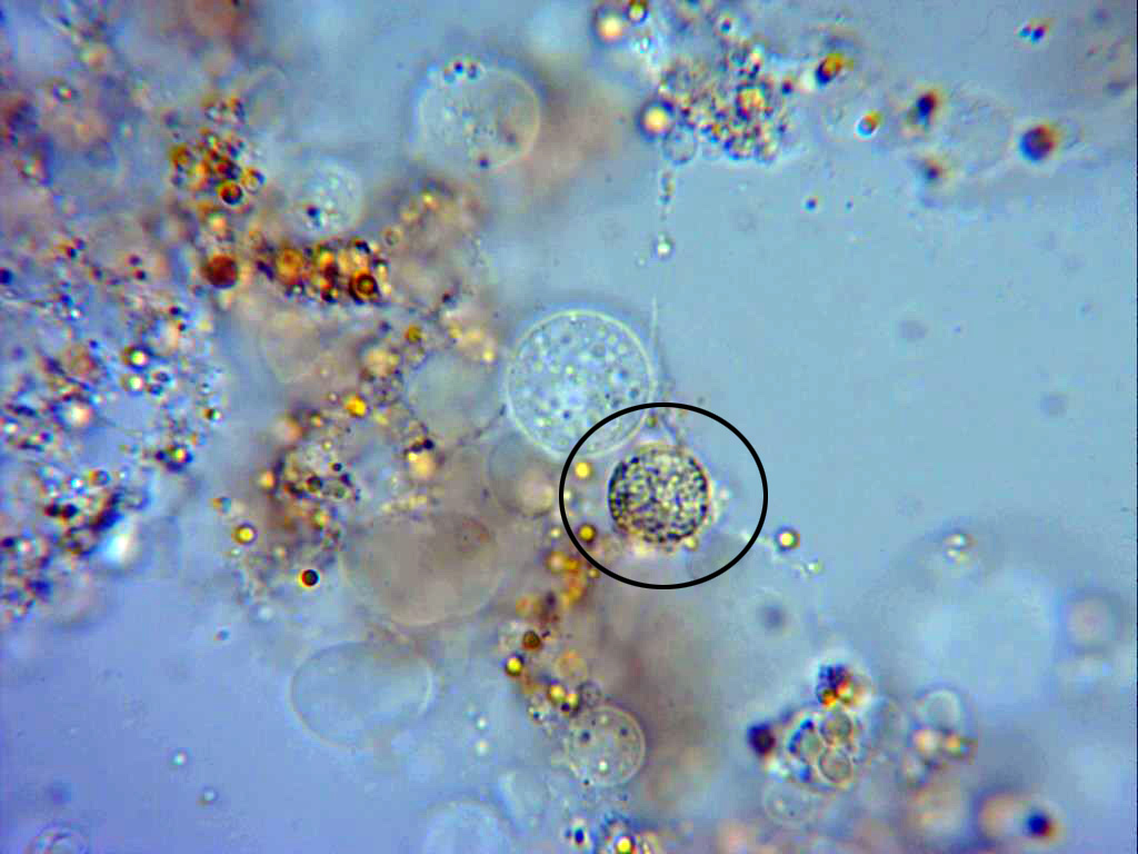 Solo muy pocas esporas como la remarcada en el círculo, de un tamaño muy por encima de las esférulas.