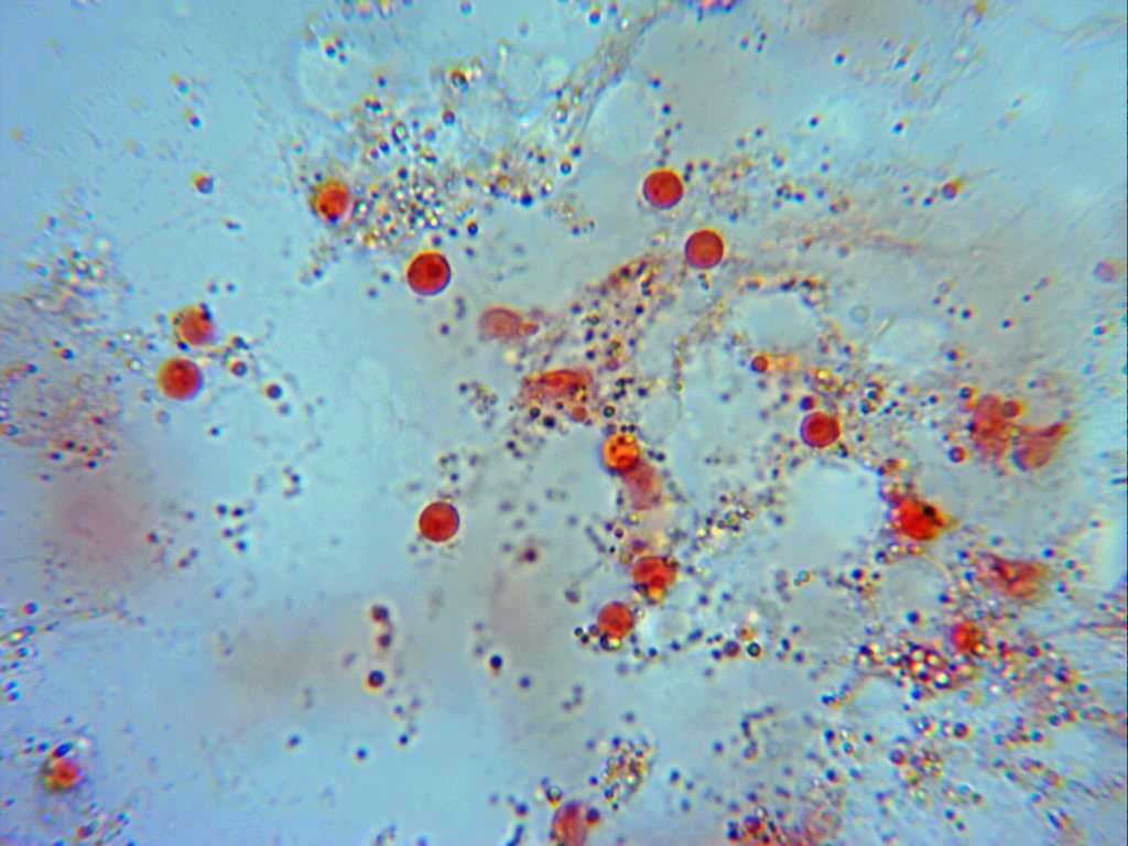 En su microscopía aparecen un gran número de células que al parecer absorben y fagocitan bacterias.