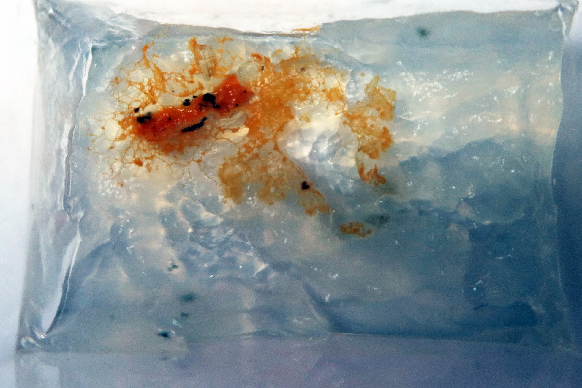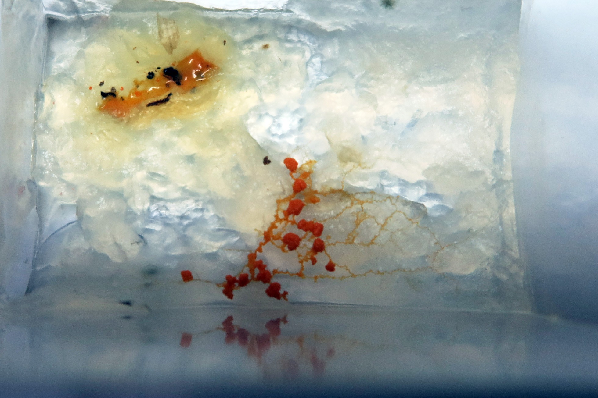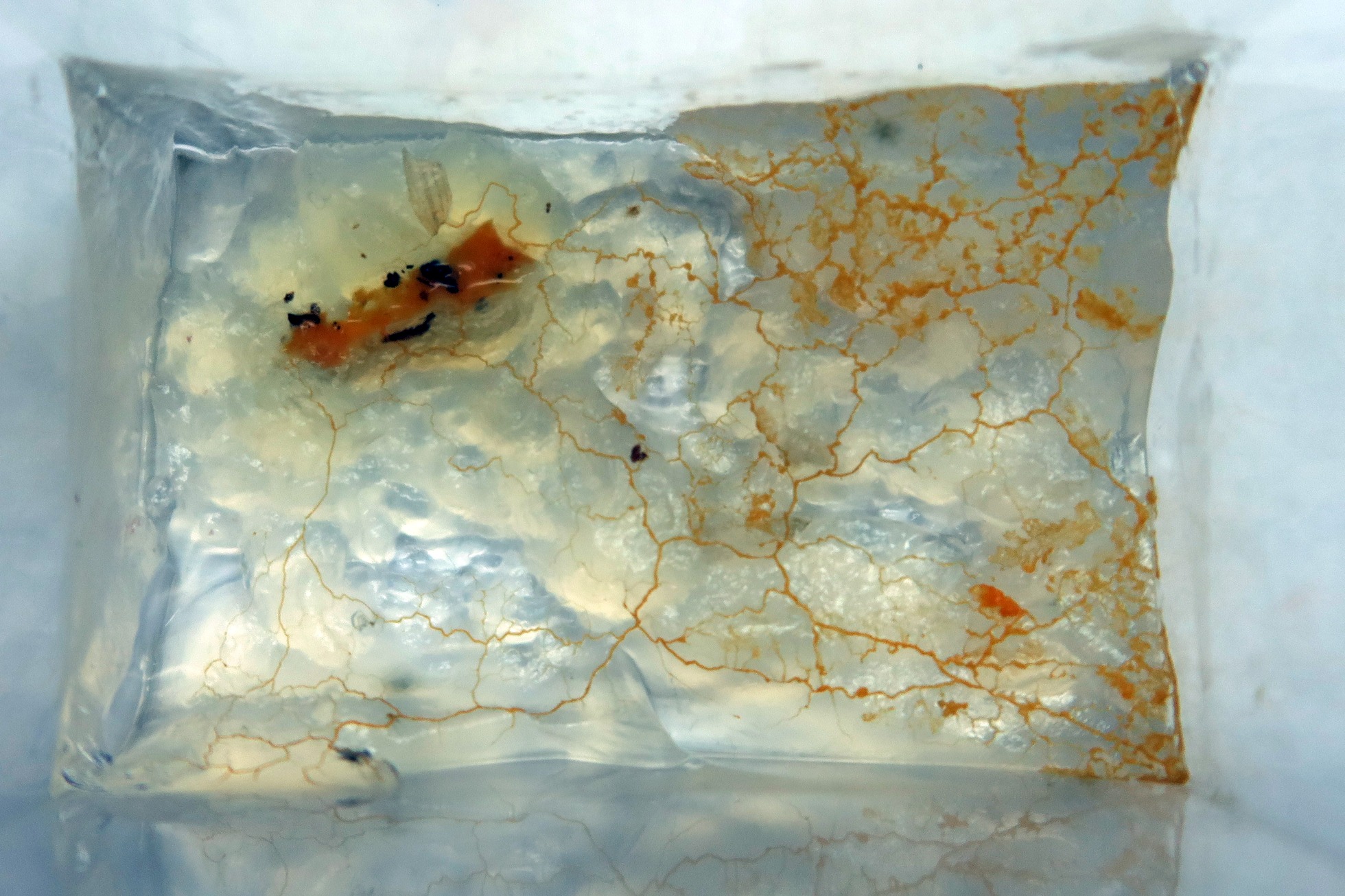 En este momento y aprovechando que estaba practicando unos cultivos con Agar agar a dos especies de Haplotrichum, hice una prueba con el Agar agar restante que tenía en un recipiente rectangular, con un trozo del plasmodium encontrado.