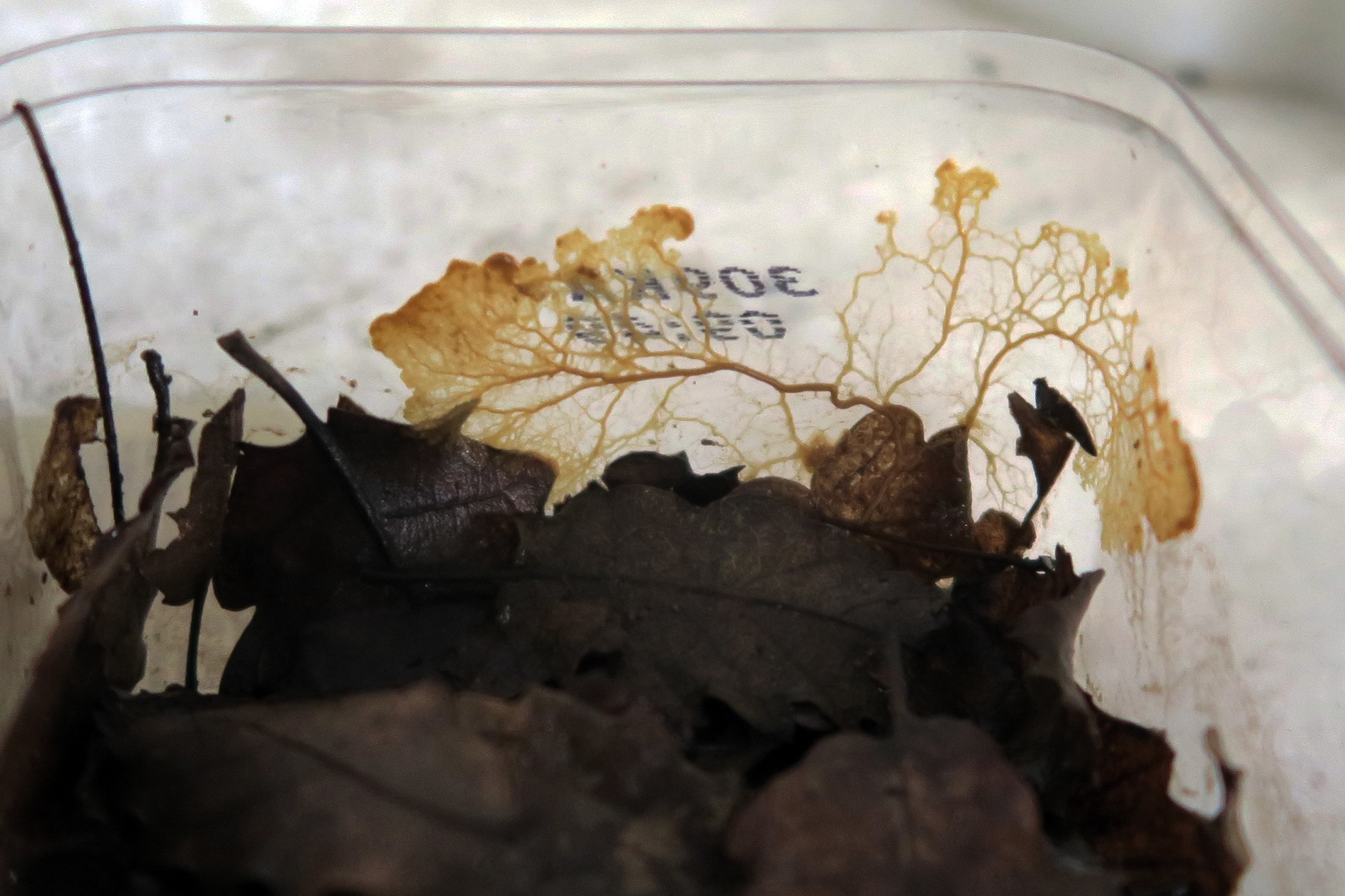 Ya el 9 de Diciembre y obsesionado con completar el estudio de la misma, de nuevo preparé una placa con Agar agar e inoculé restos del mismo del recipiente con las hojas de roble.