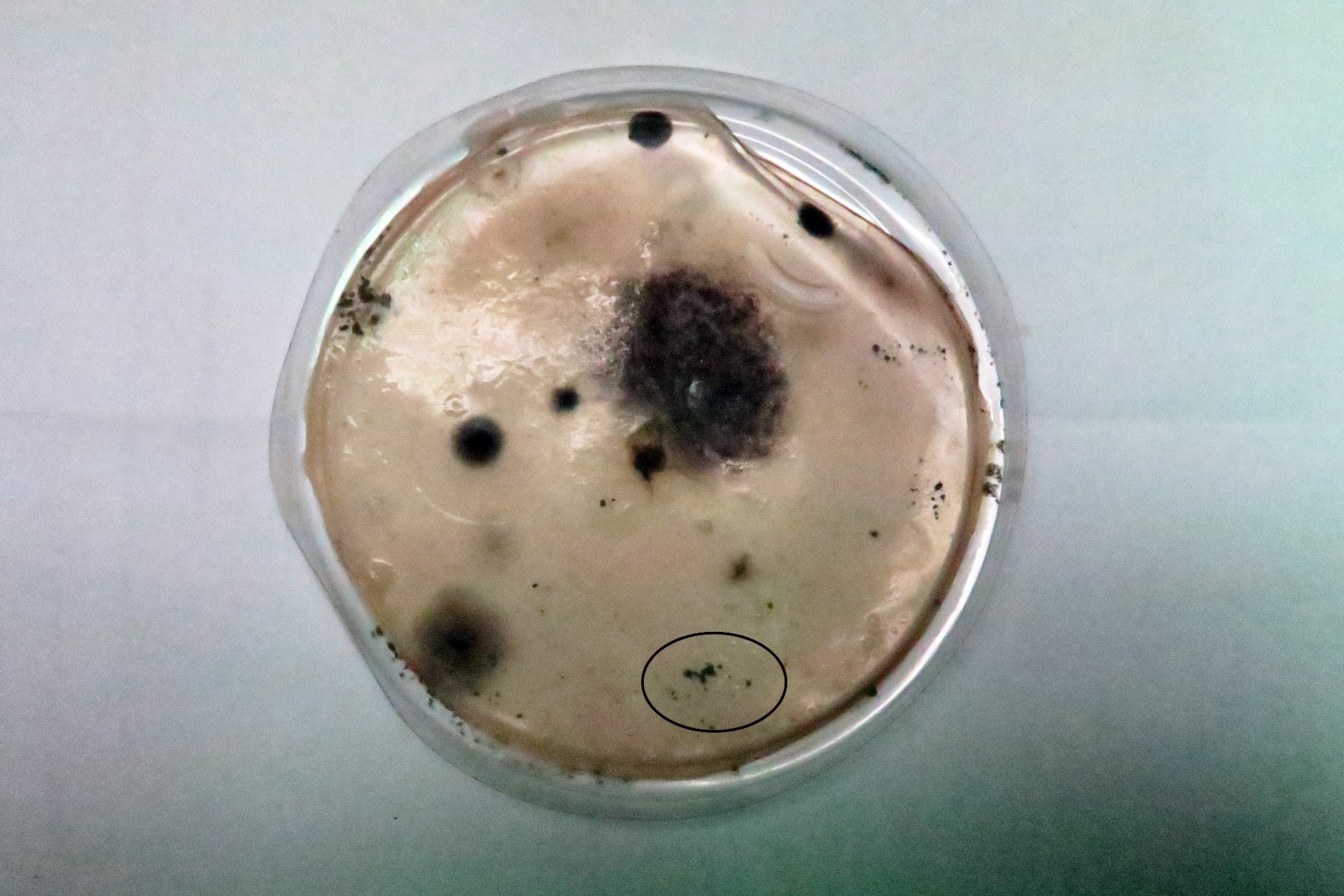 La placa a las 3 semanas y la mancha de Alternaria marcada con un círculo.