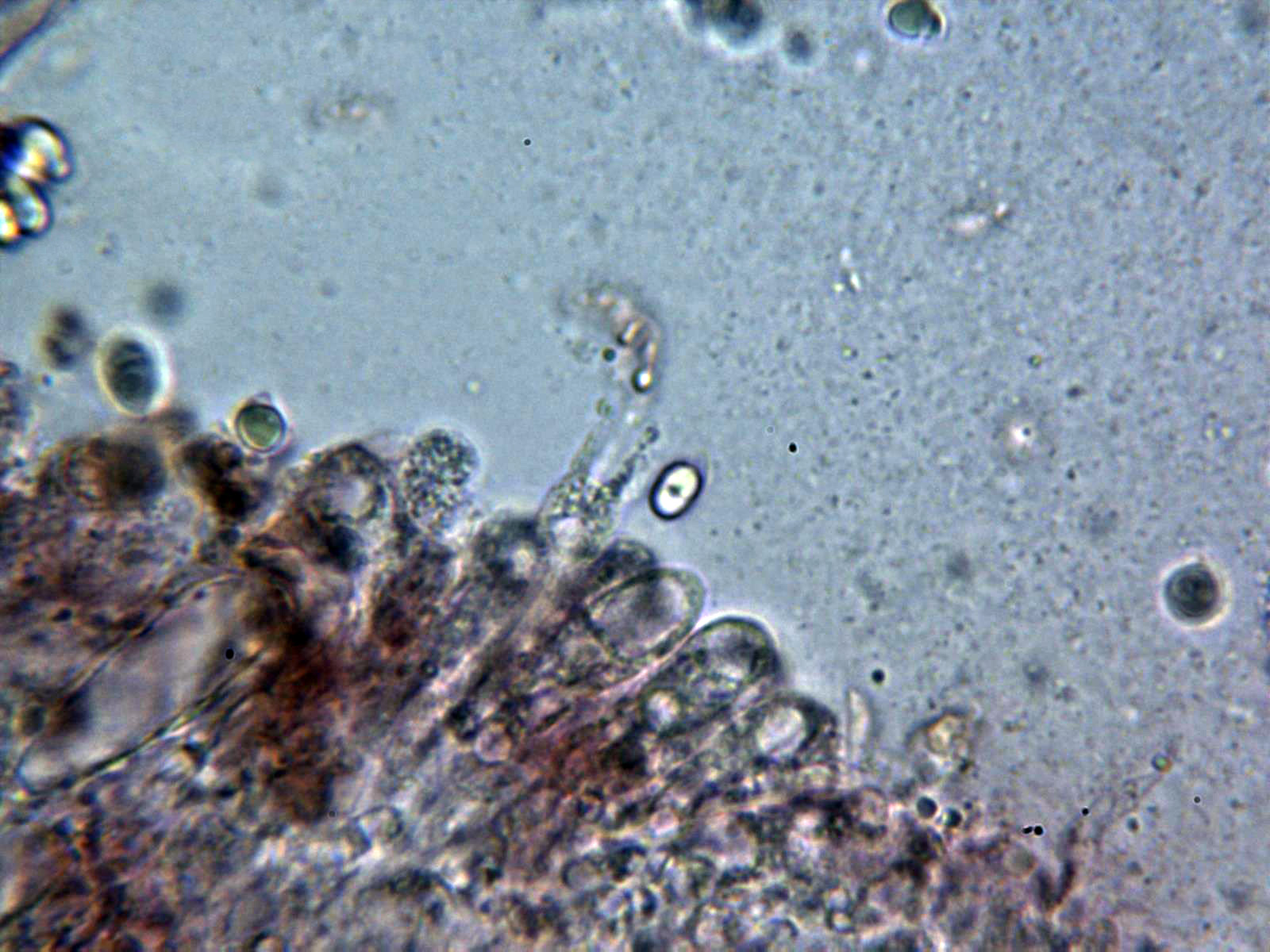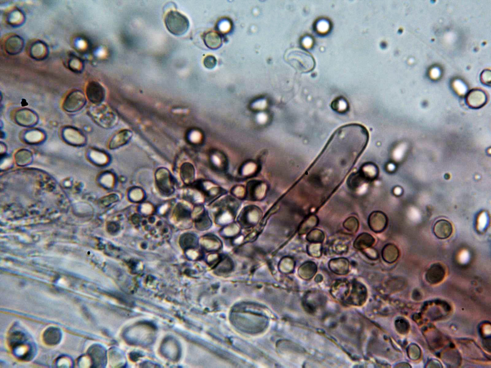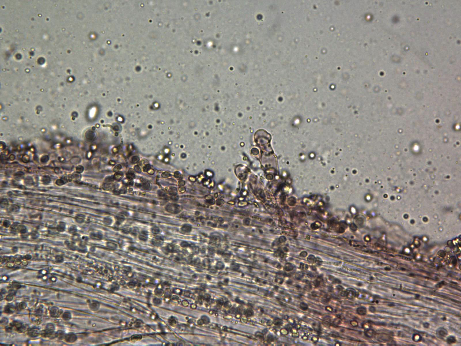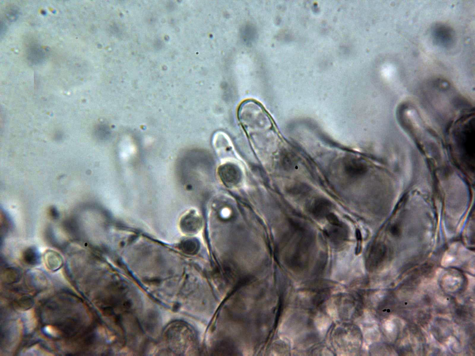 En la mayoría de muestras de la arista laminar, aparecía una pigmentación muy oscura (como la que aparece en la imagen), esta dificultaba la observación de los queilocistidios, intuyo que podía contribuir a la coloración pardo lilácea de la arista laminar.