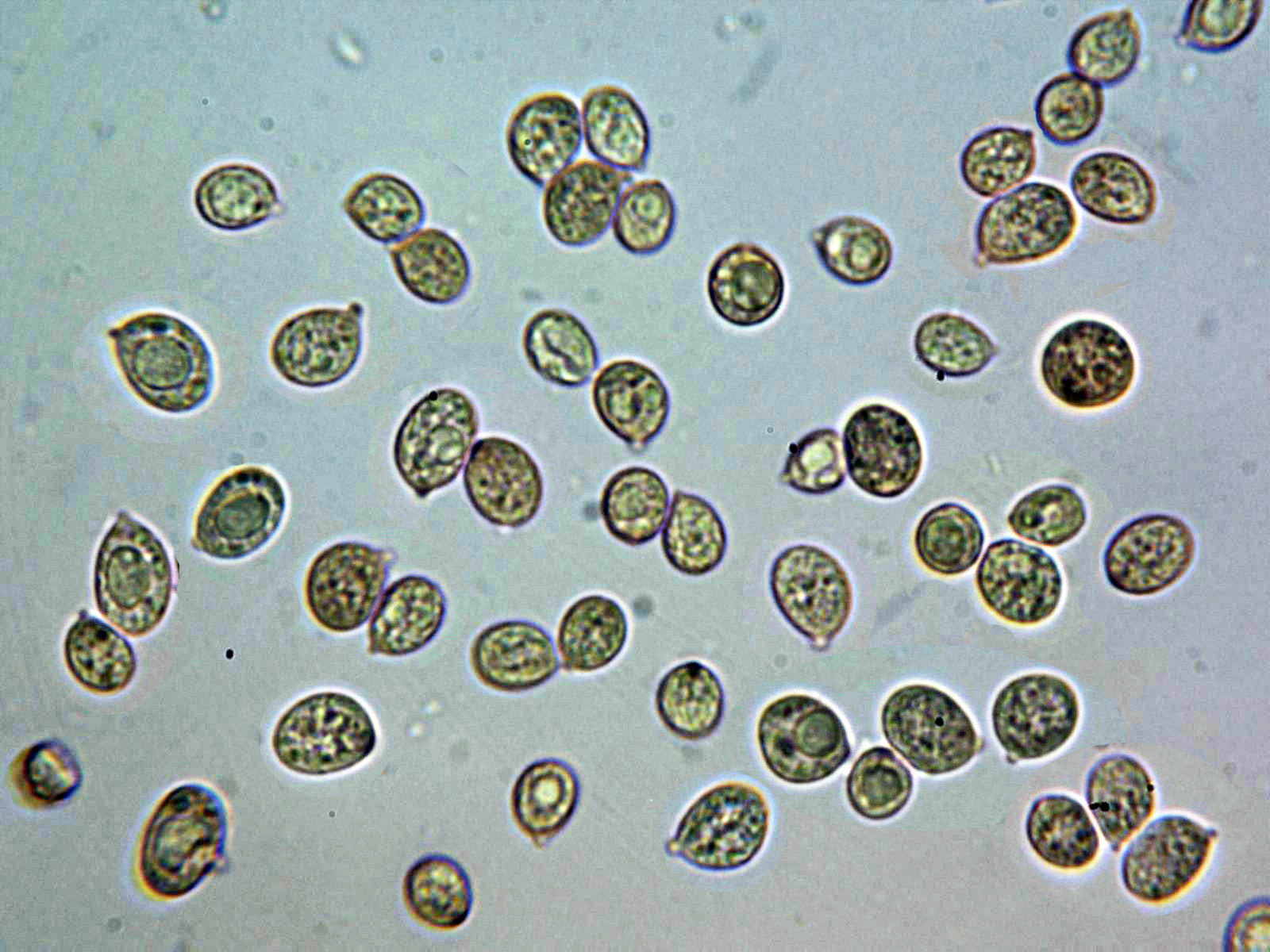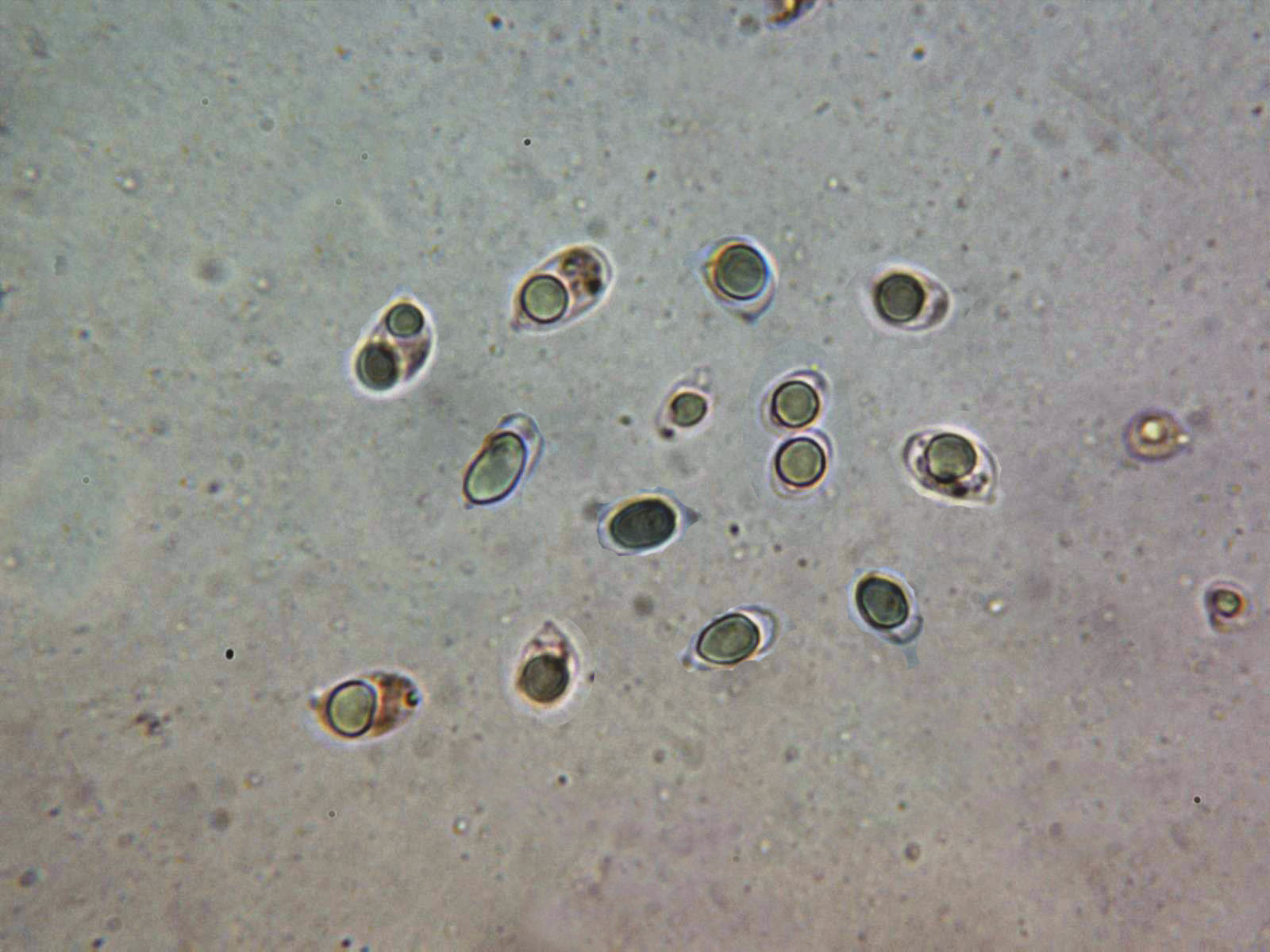 Un aspecto ya muy distinto, esporas entre elipsoides y amigdaliformes, ya con una pared bien definida, con marcada apícula y contenido granuloso bien visible (las vacuolas solo se pueden observar en algunas de ellas).