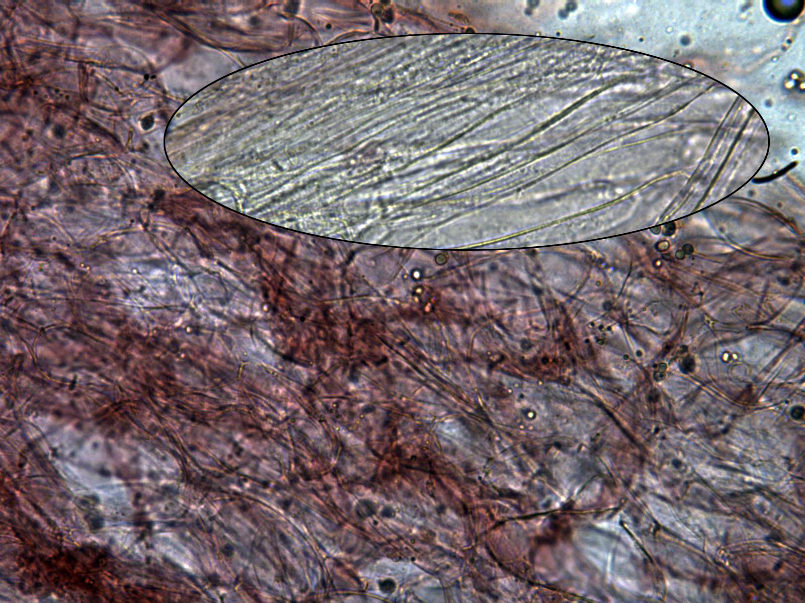 Hifas de la pileipellis gelificadas, en la miniatura las hifas de la estípite, no pude observar fíbulas en ninguna de ellas a pesar de que en el enlace de Micolosa si que aparecen en las imágenes, por el contrario el enlace de The Mycenas of Northern Europe, la describen libre de fíbulas como es mi caso.