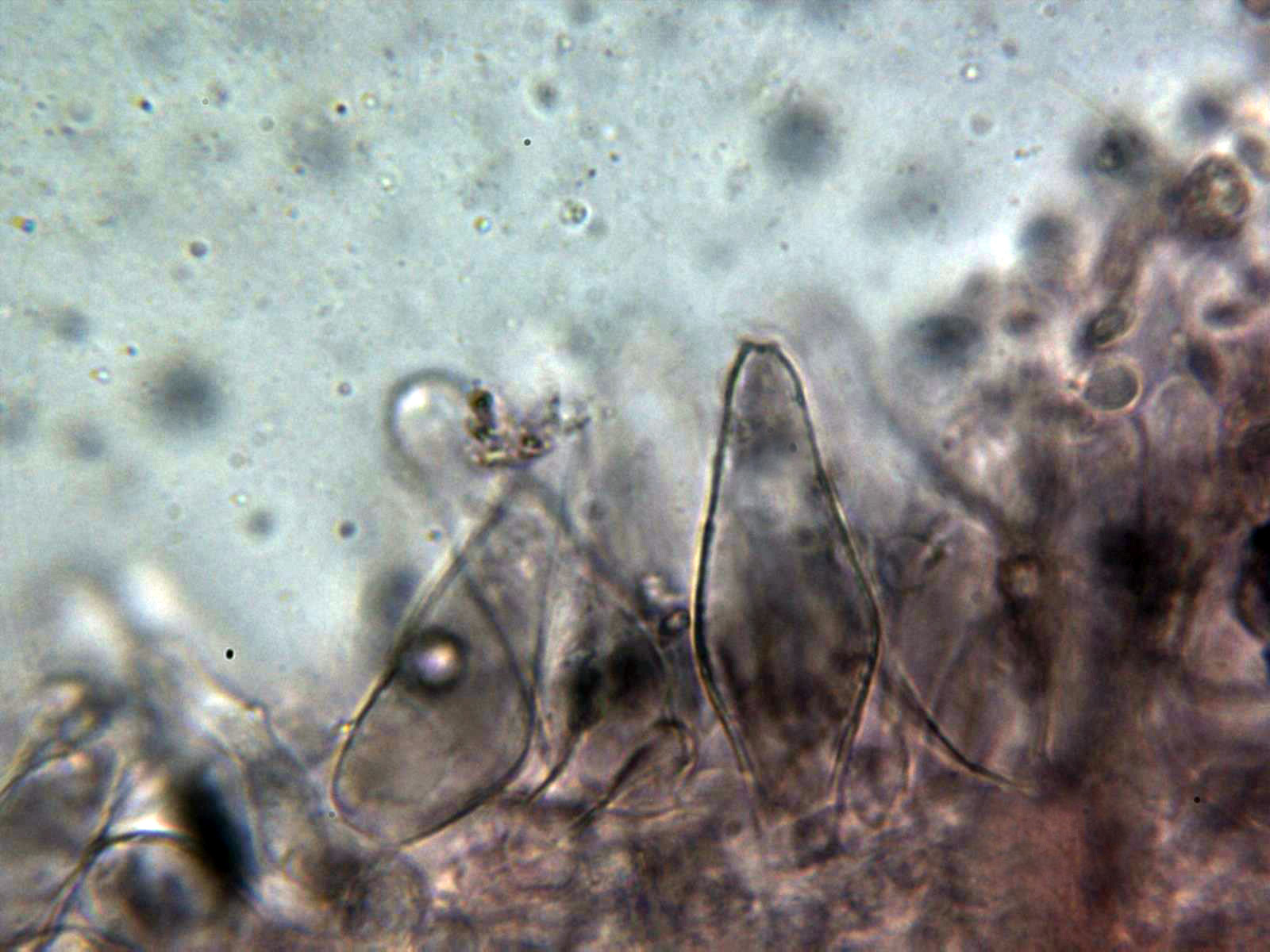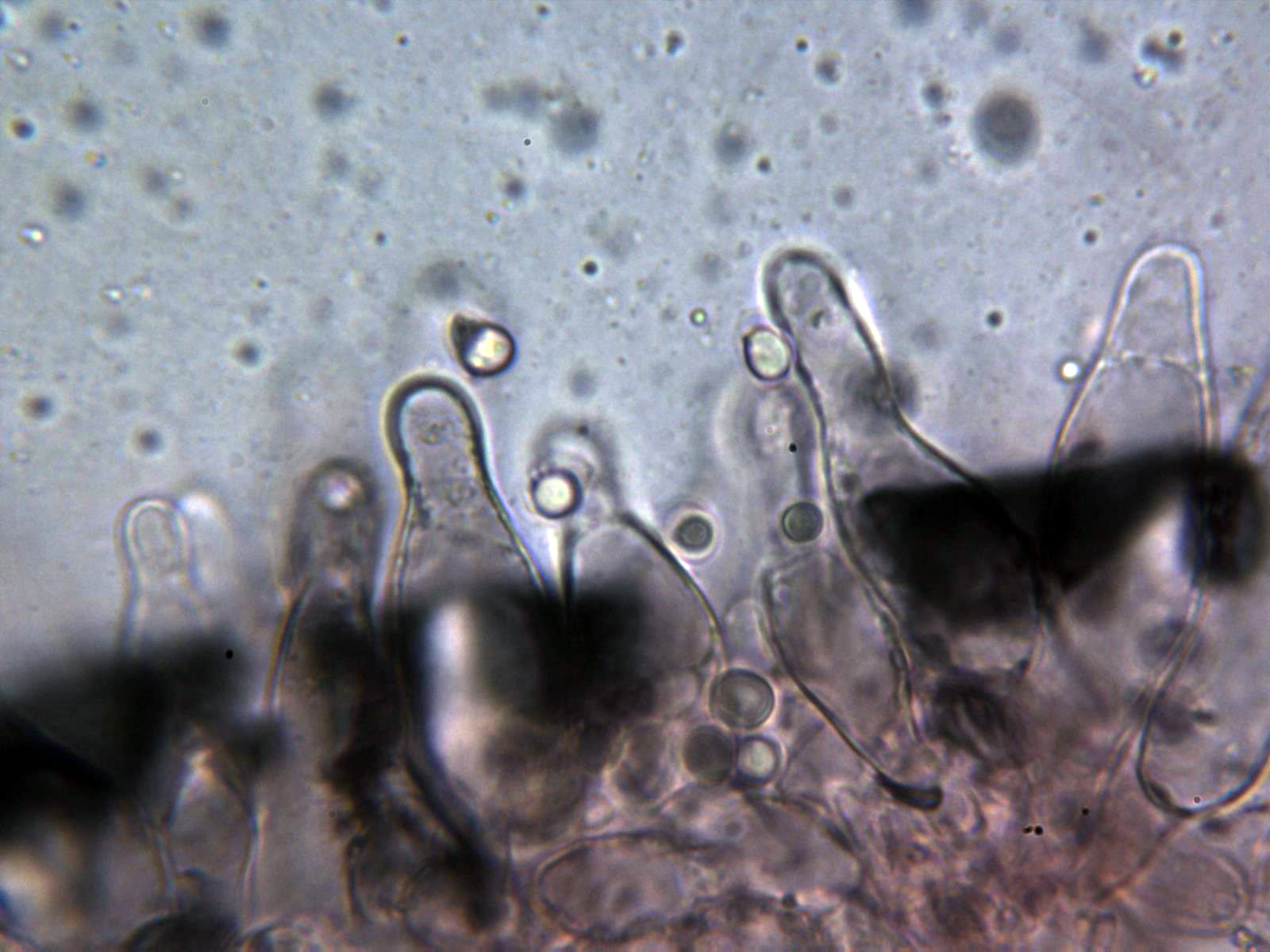 Queilocistidios muy abundantes en la arista laminar, quedando esta prácticamente estéril, ensanchados en su base, algunos lageniformes, con cuello cilíndrico, otros subcapitados, otros algo sinuosos y terminando en formas redondeadas. En agua destilada se observa en su interior un pigmento suavemente liláceo.