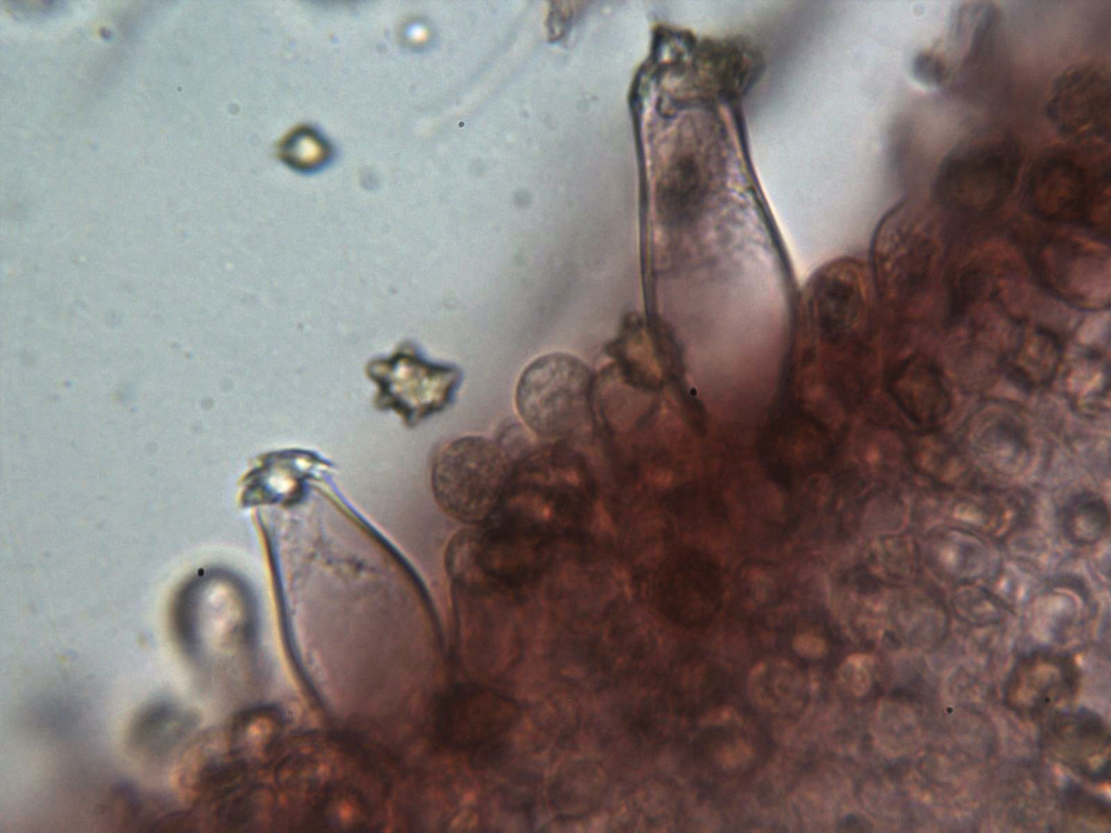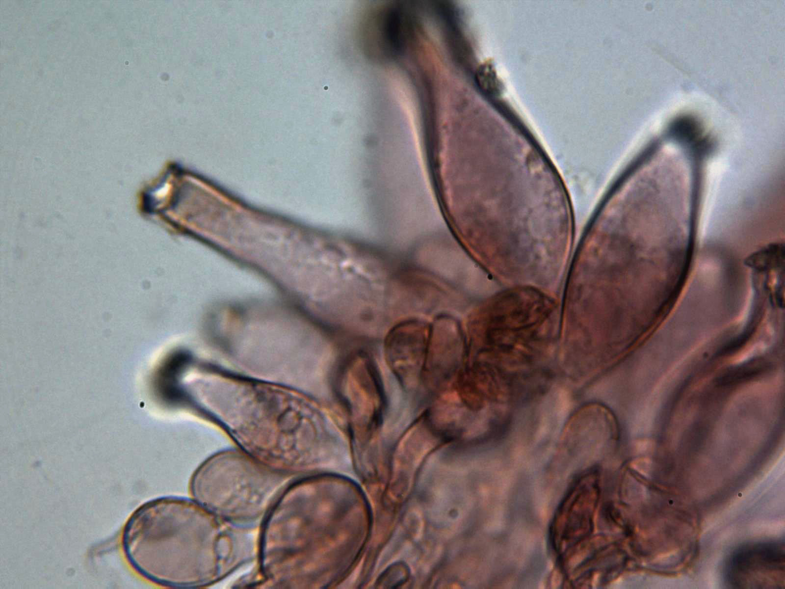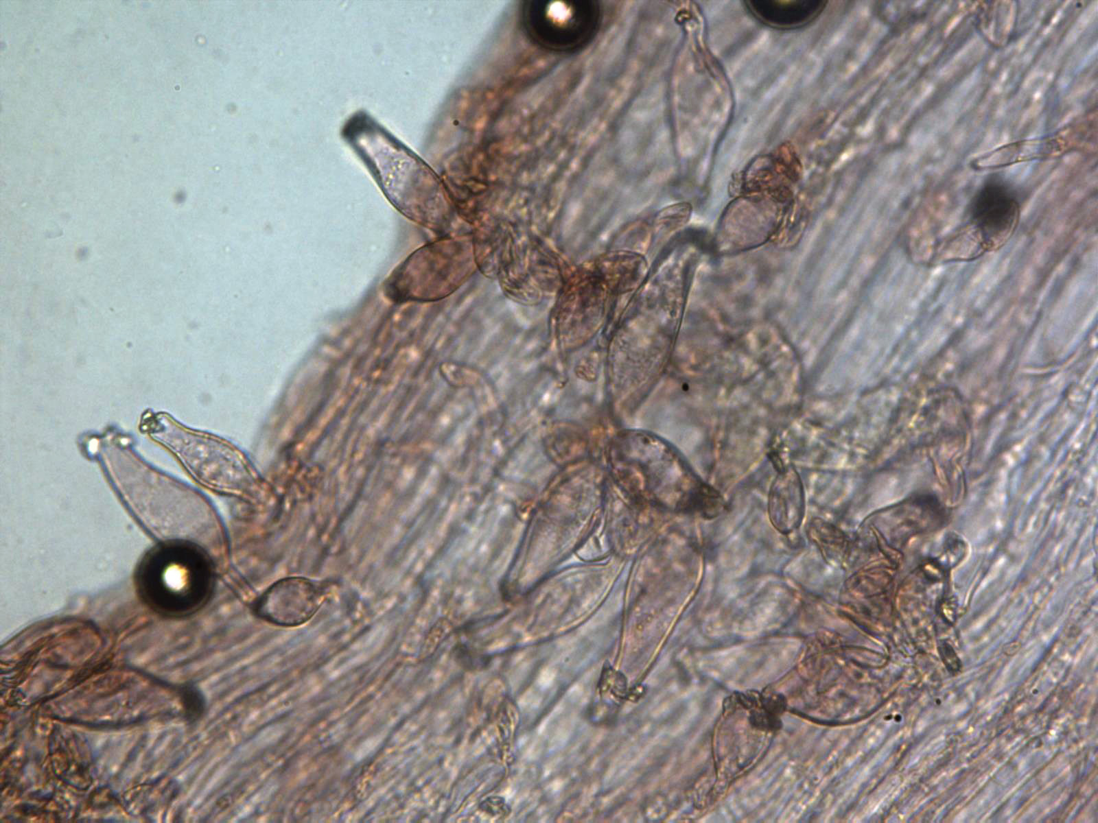 Caulocistidios a 400 aumentos. Abundantes caulocistidios, con la misma morfología que los queilocistidios.