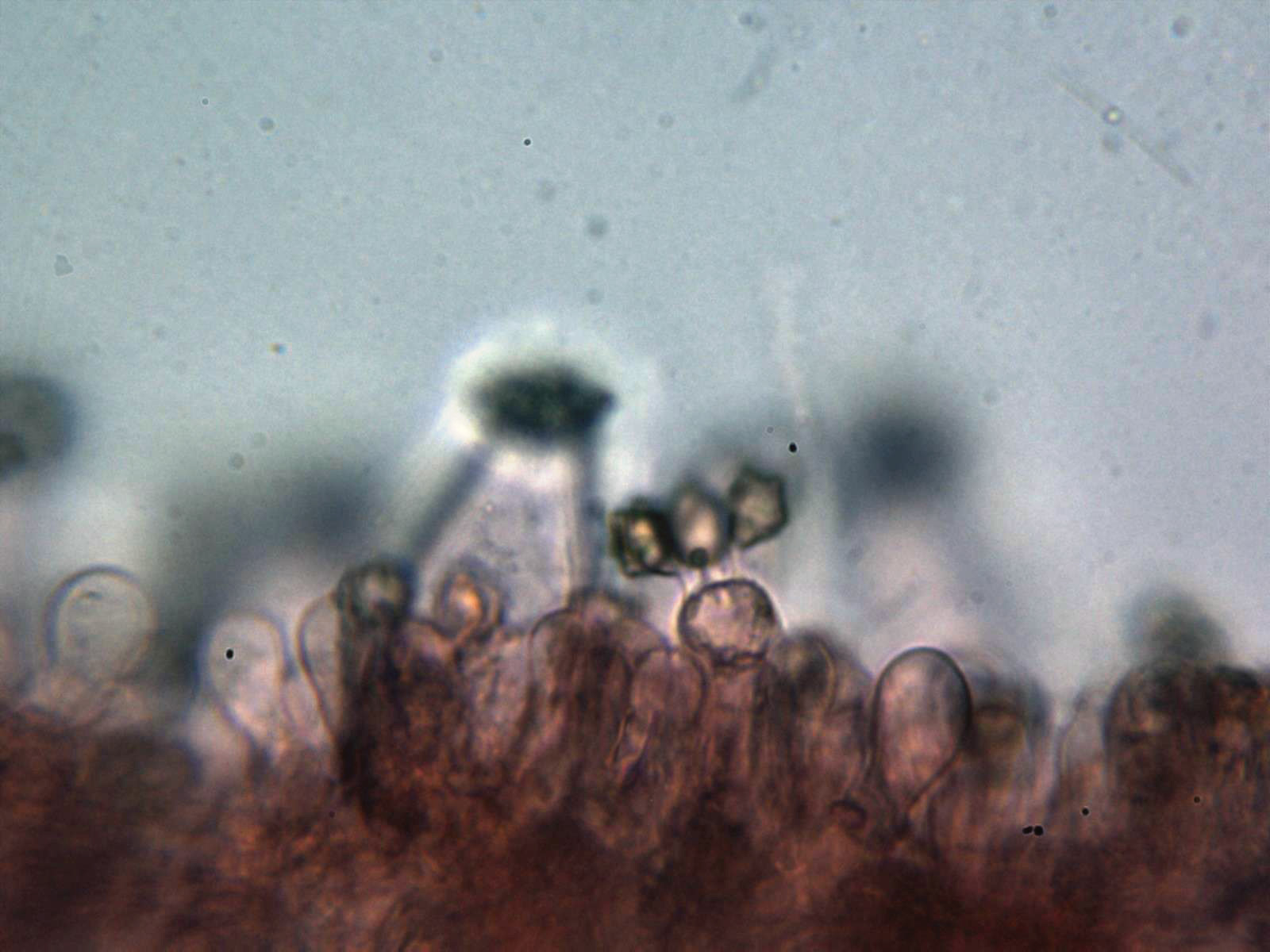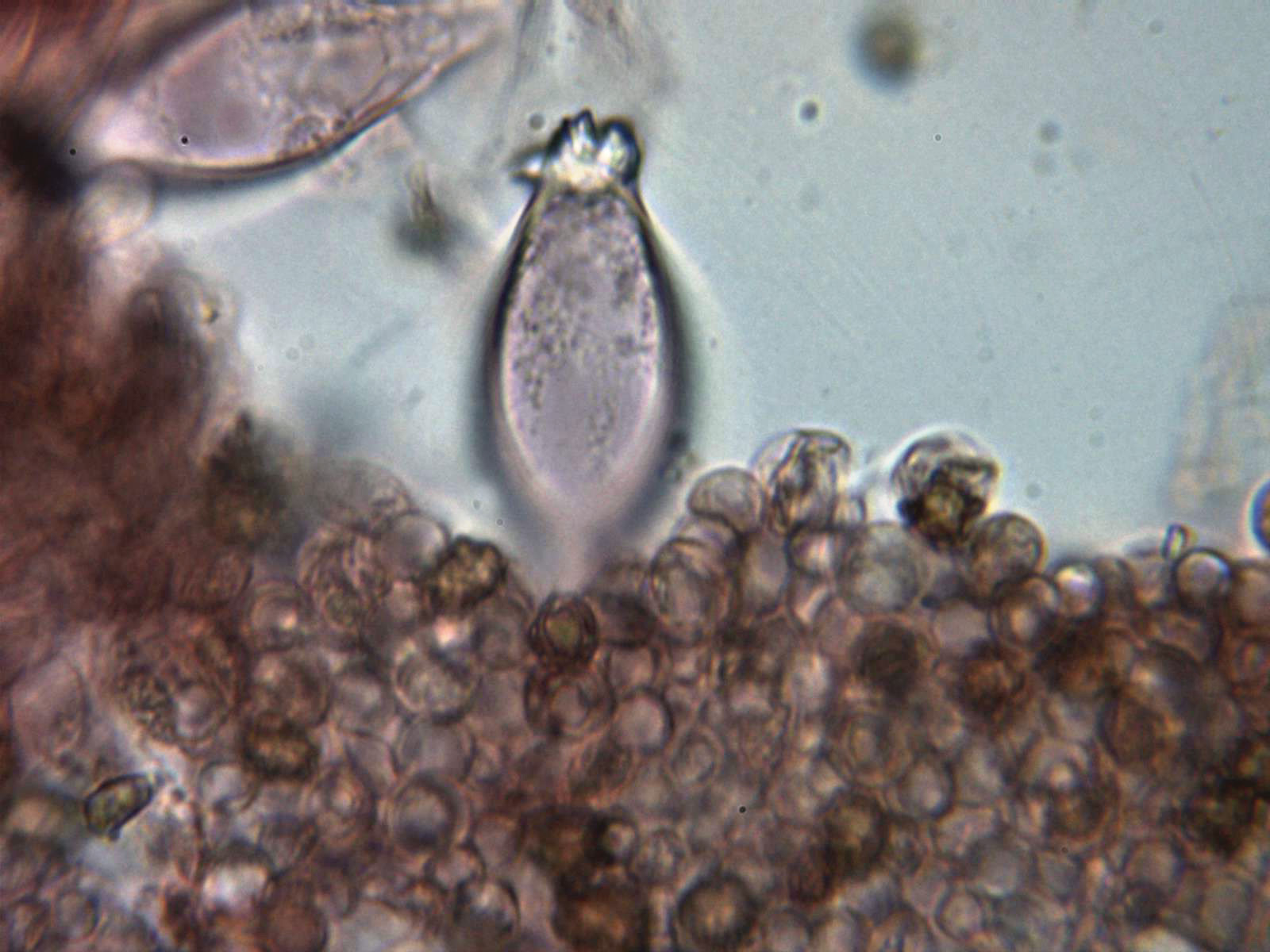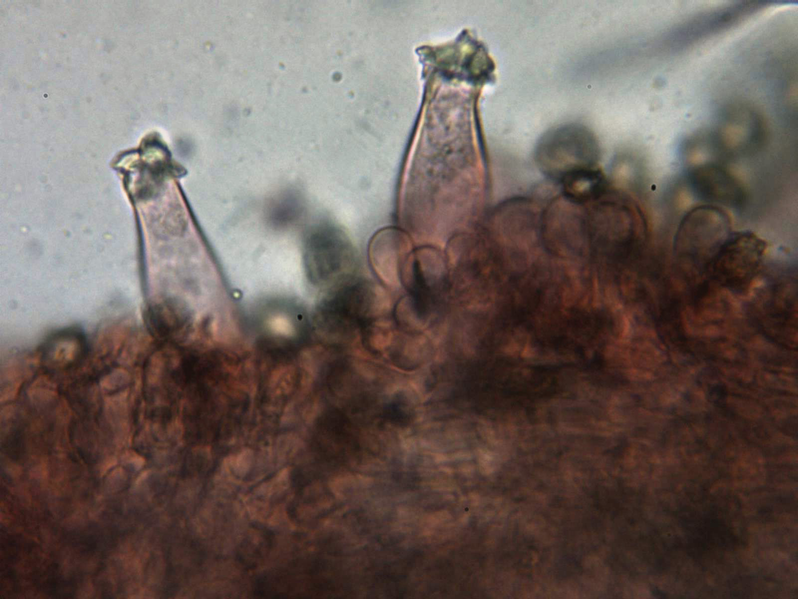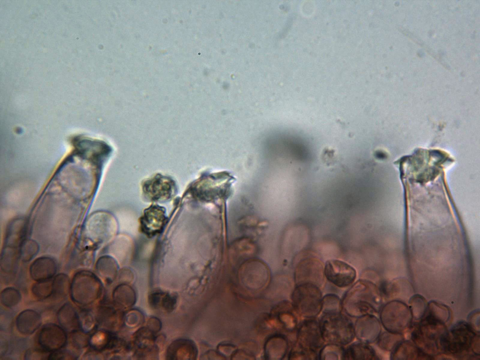 Caulocistidios a 400 aumentos. Abundantes caulocistidios, con la misma morfología que los queilocistidios.