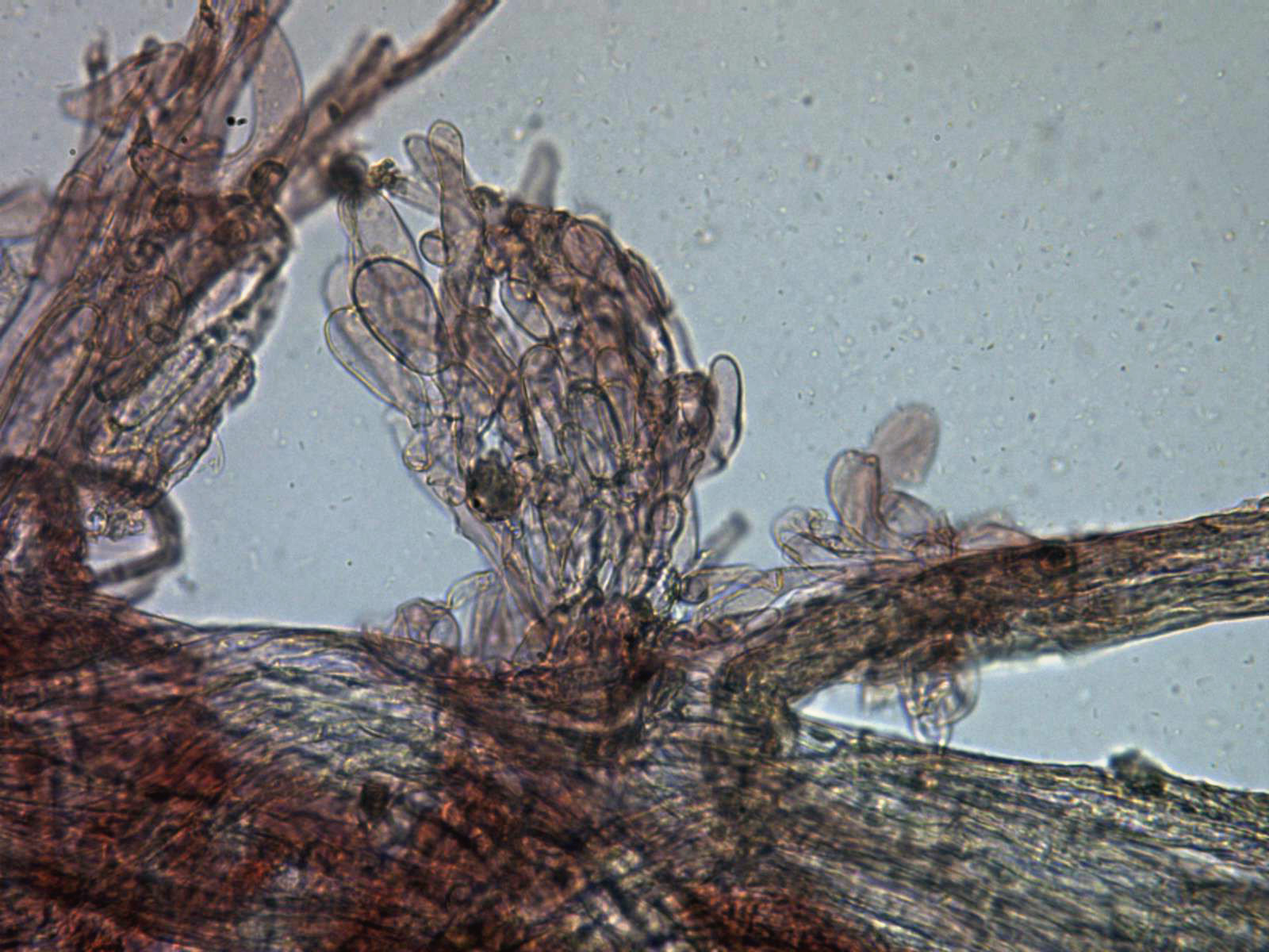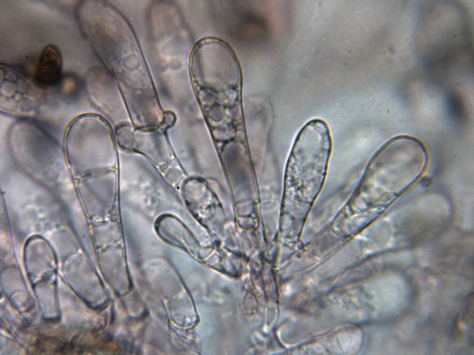 Caulocistidios de la parte superior del pié a 400 aumentos, septados y con forma de ramillete.