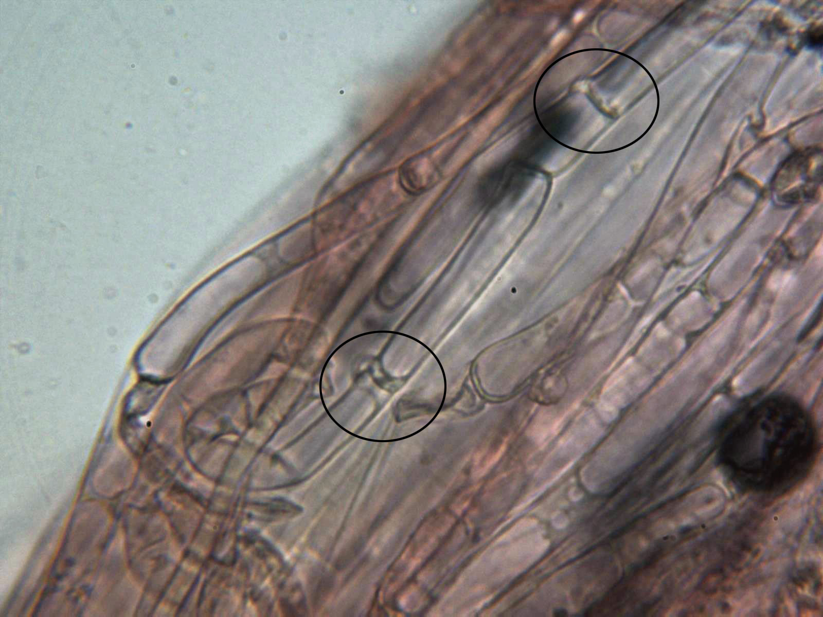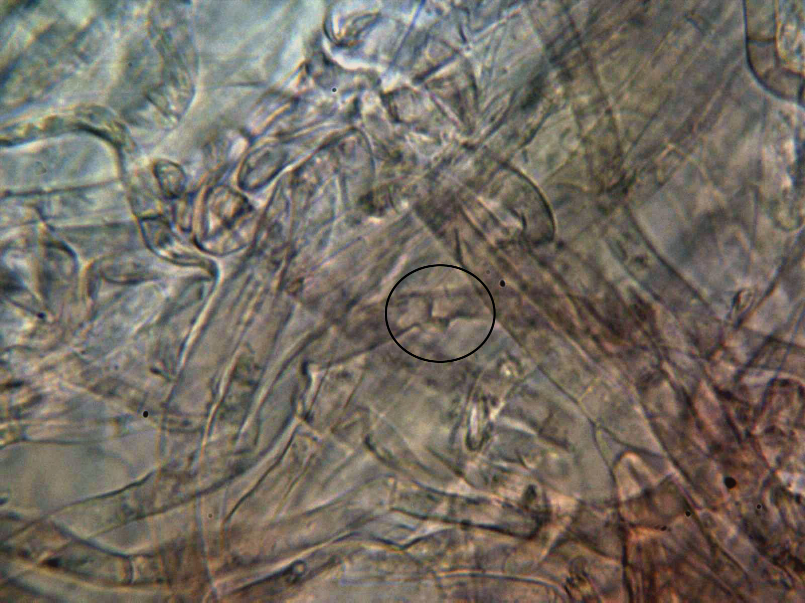 Base del pié con hifas fibuladas y sin caulocistidios.