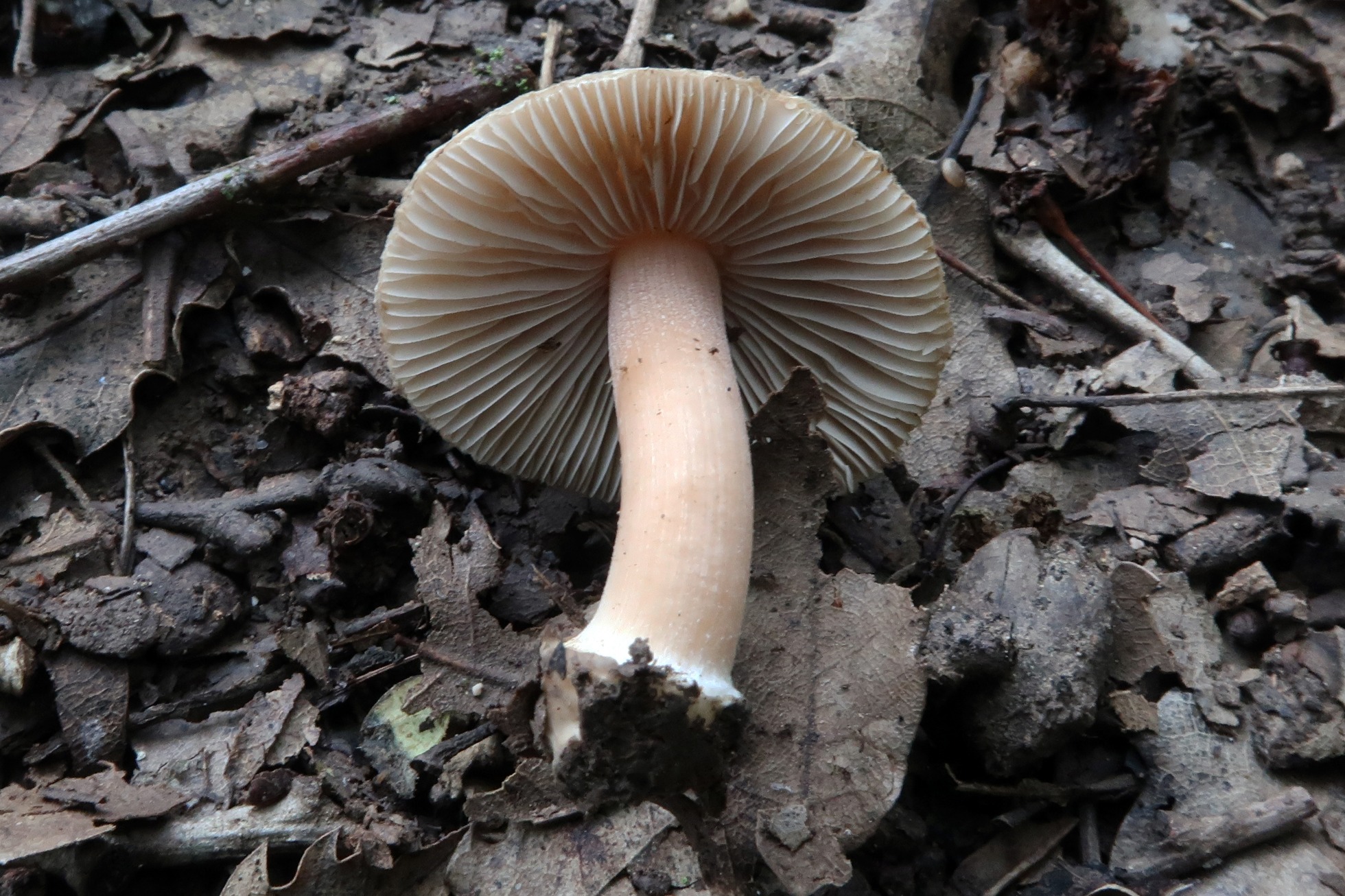 Pié liso, fibrado longitudinalmente y blanquecino, con una pruina en su superficie, principalment en la parte superior del mismo. La base del mismo ligeramente ensanchada sin llegar a formar un bulbo bien diferenciado.