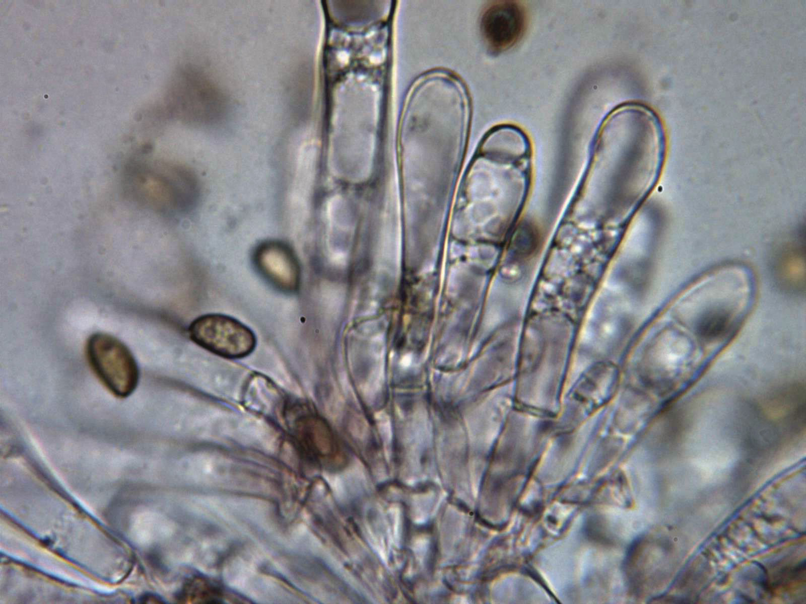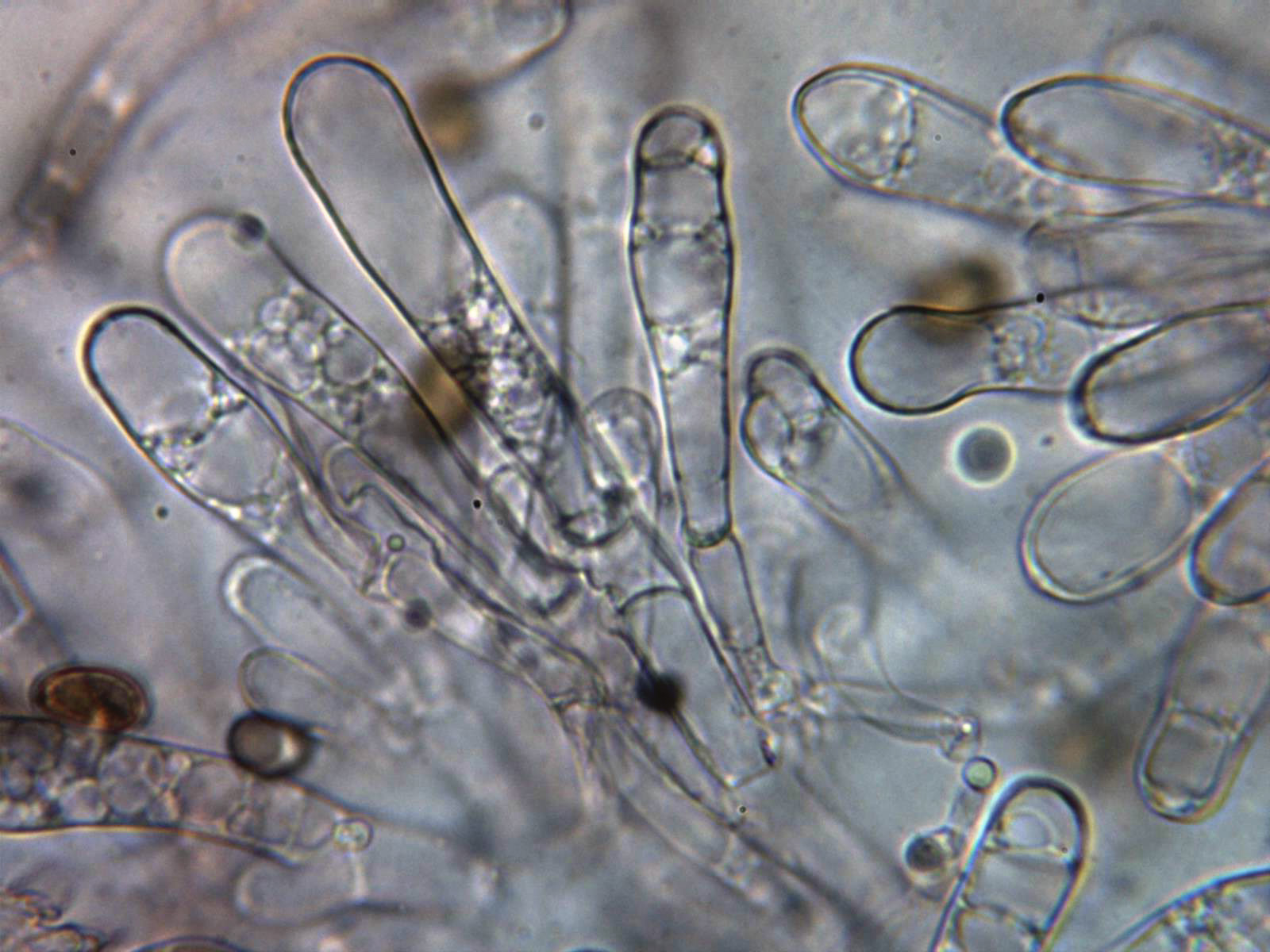 Queilocistidios muy abundantes, dejando la arista laminar estéril, cilíndricos, terminando con formas redondeadas, partiendo varios de una misma base y con fíbulas.