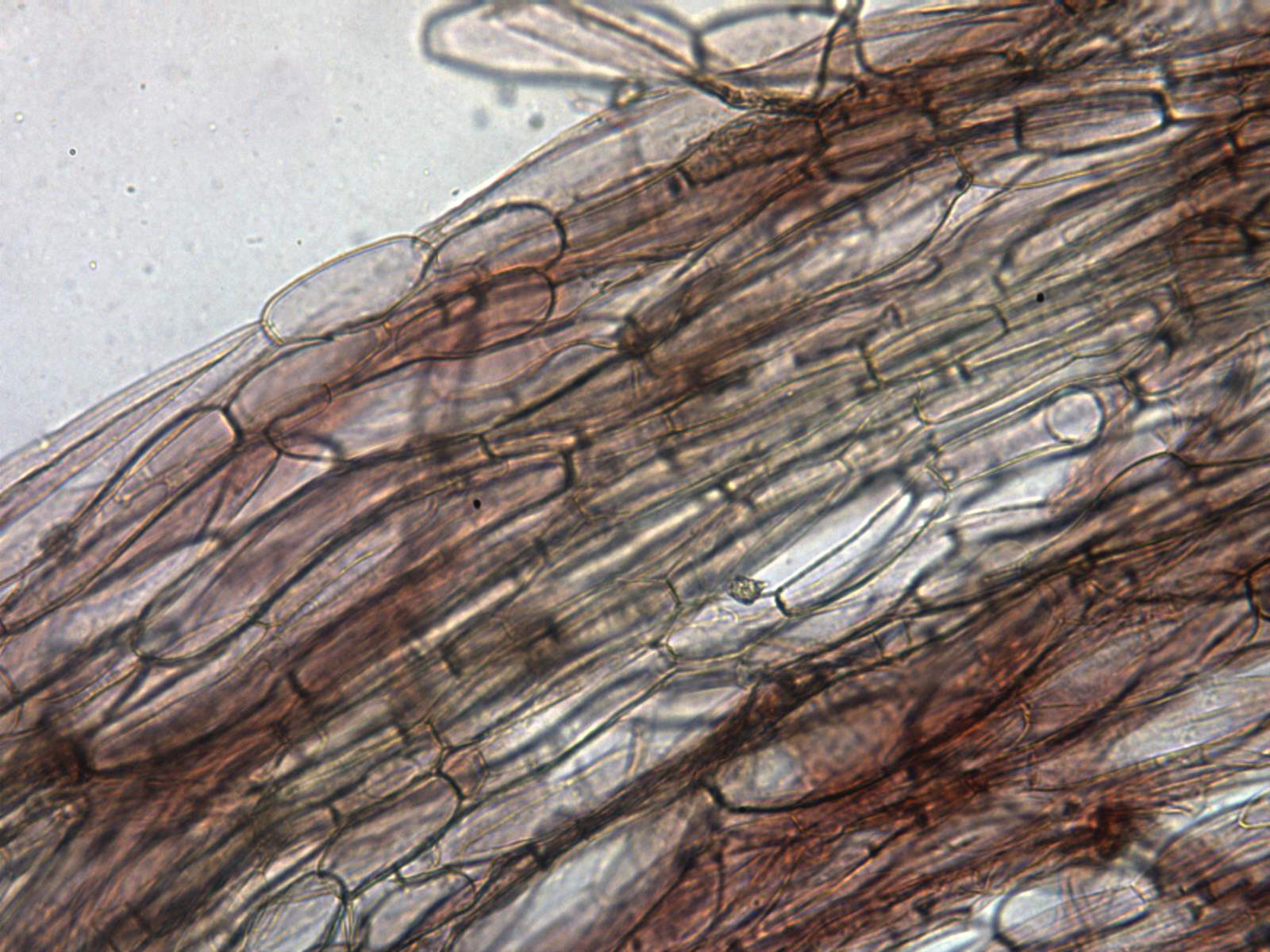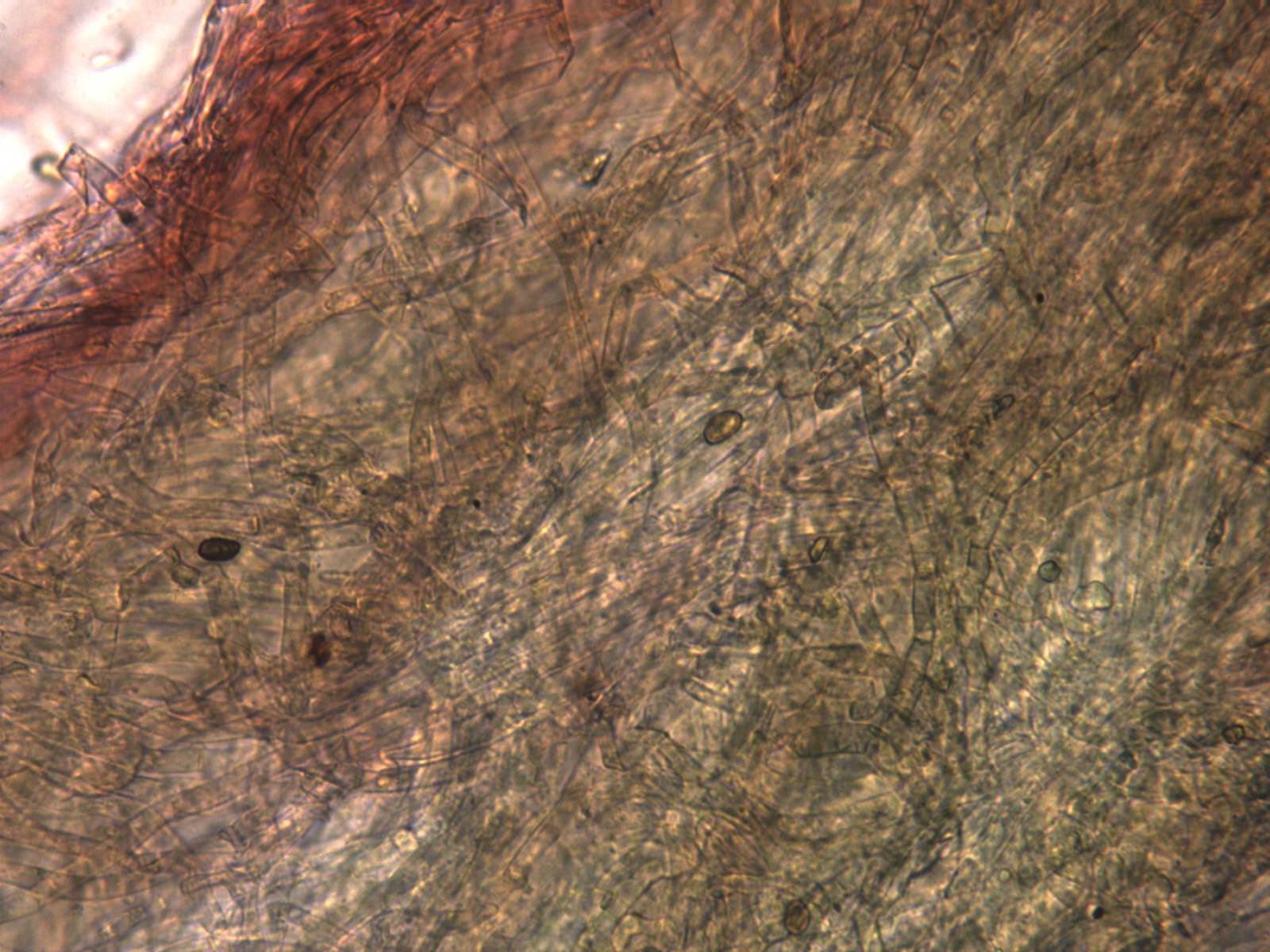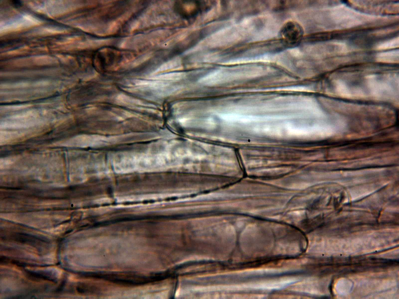 Suprapellis a 1000 aumentos, con hifas cilíndricas, septadas, ligeramente pigmentadas y al parecer sin fíbulas.