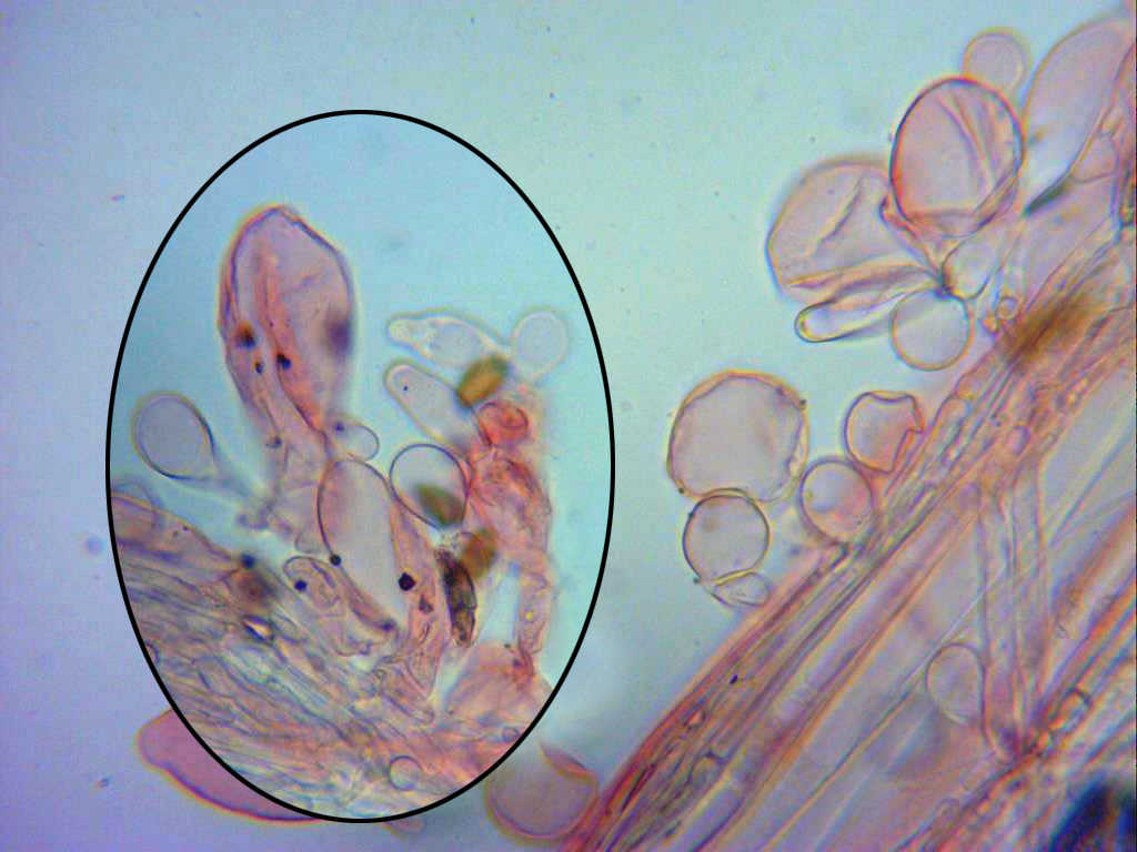 Caulocistidios presentes en la parte alta del pié de diversa morfología. Los de la imágen a tan solo 400 aumentos.