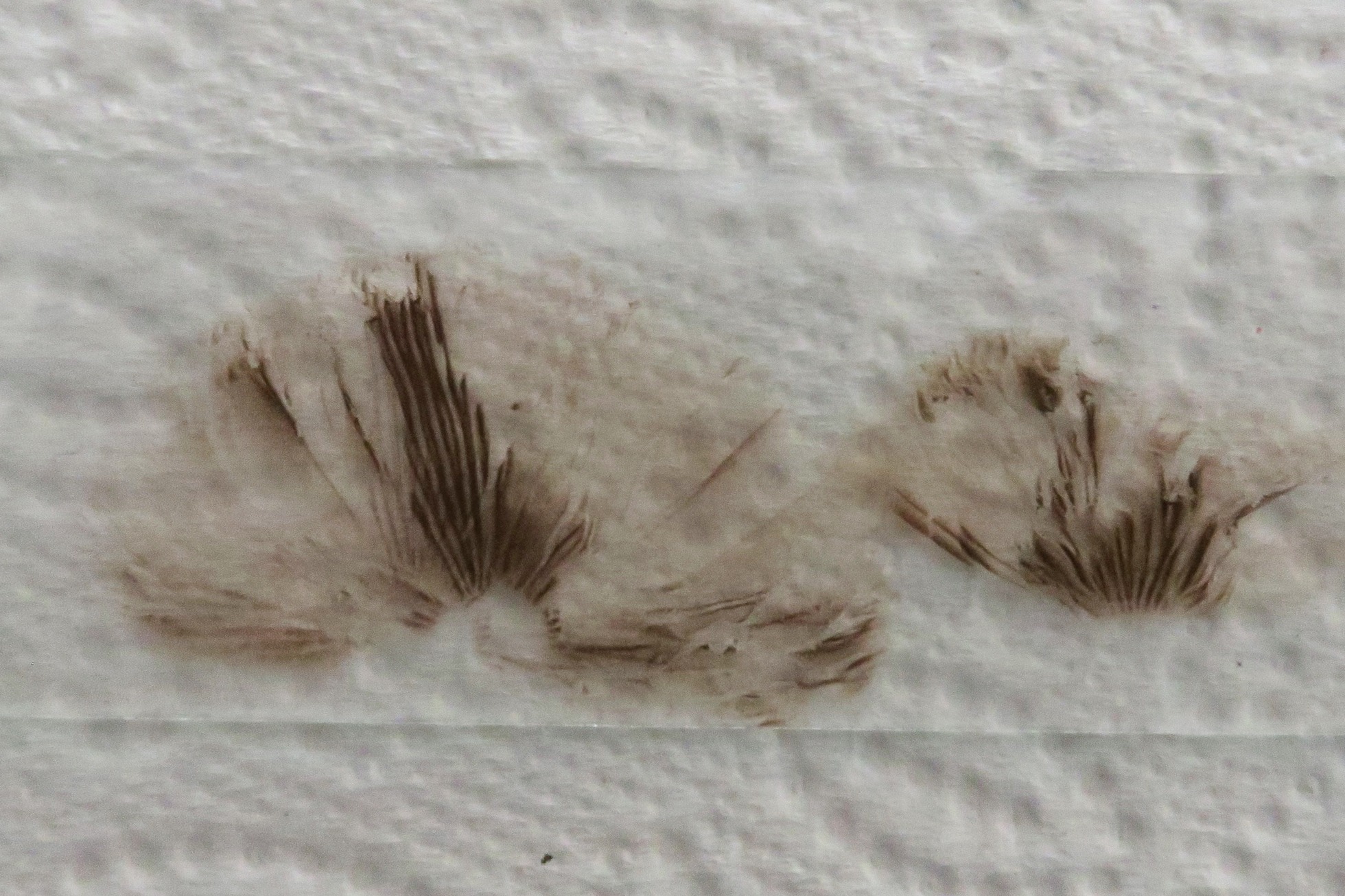 Esporada en masa de color marrón tabaco oscuro.
