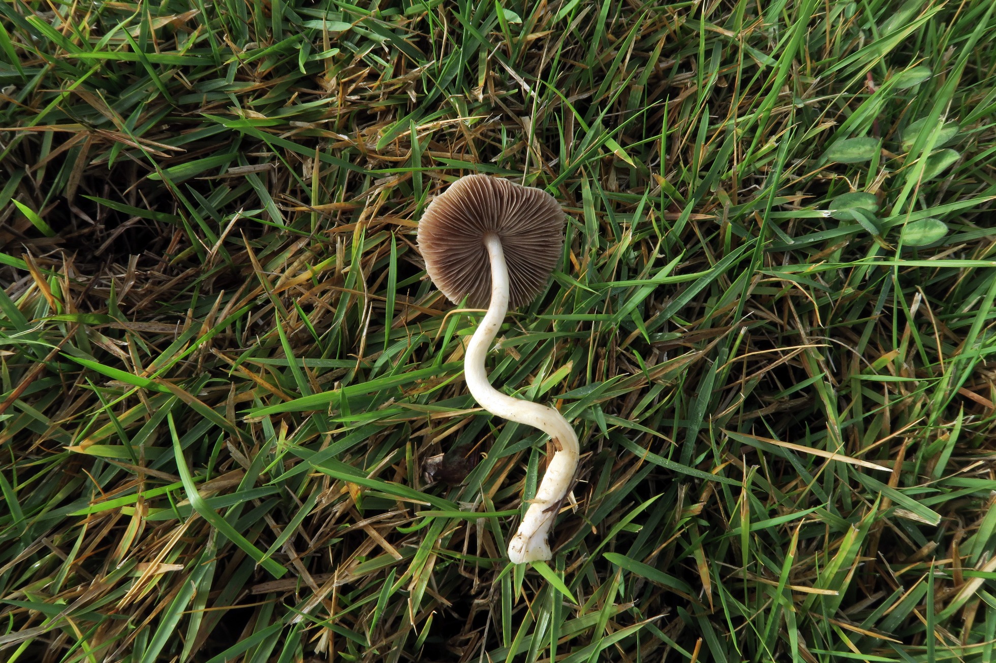 Imágenes tomadas anteayer de un Agrocybe brotando de forma solitaria en el césped de una zona ajardinada de la República Dominicana.