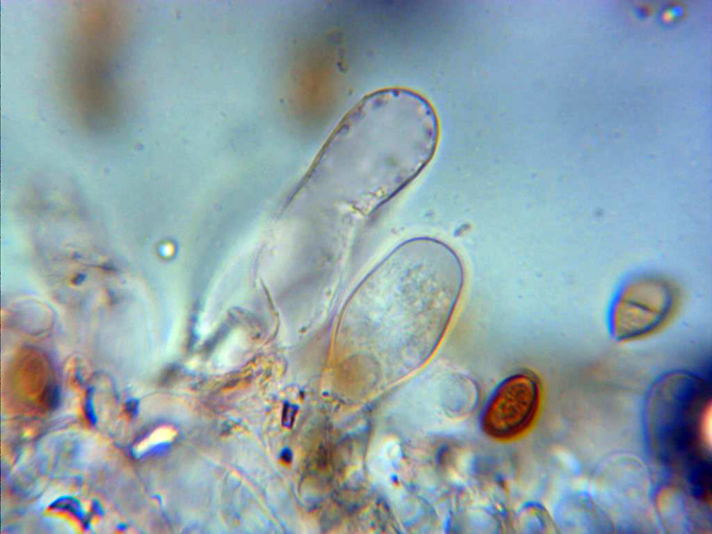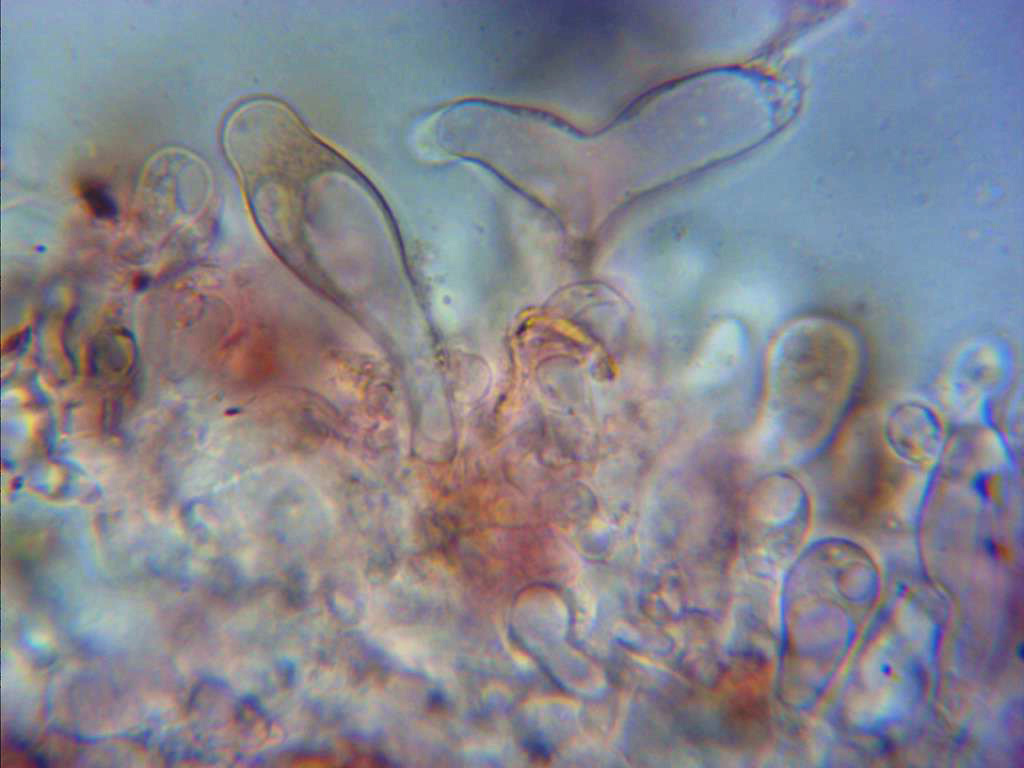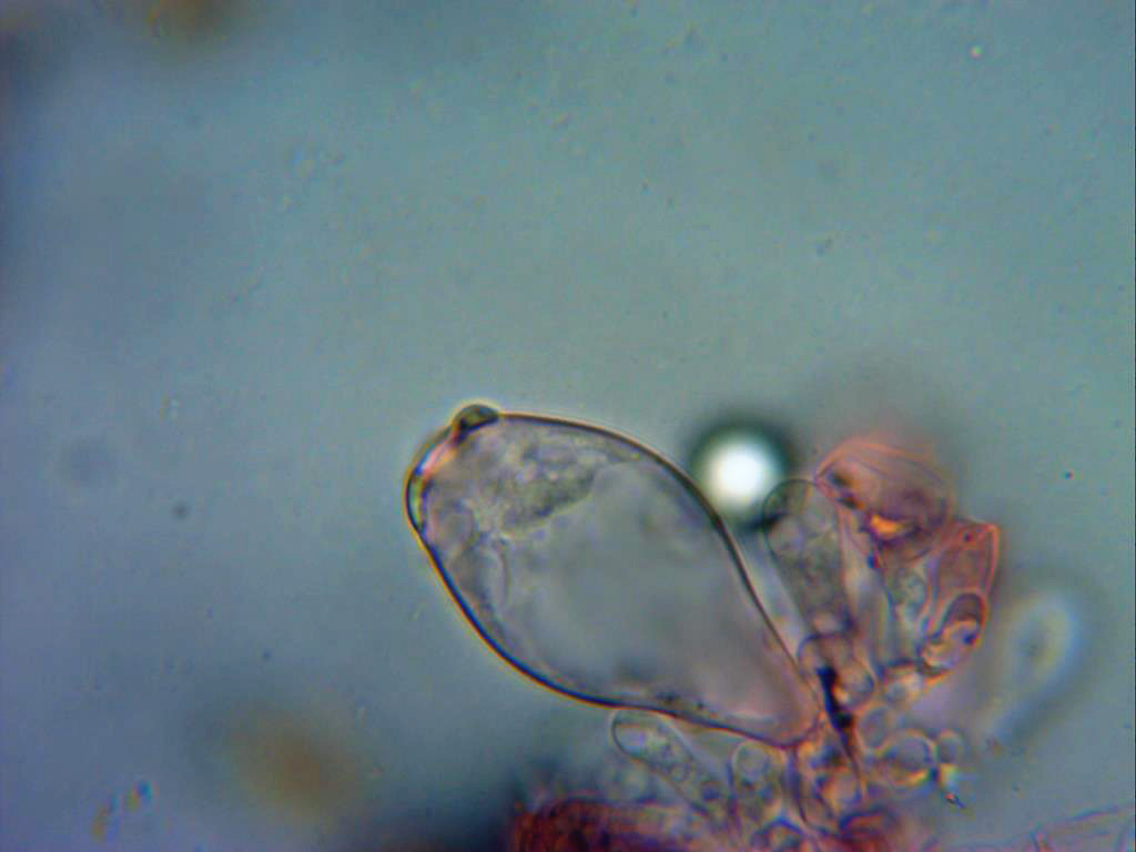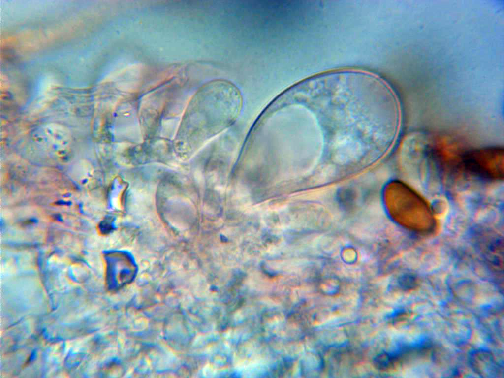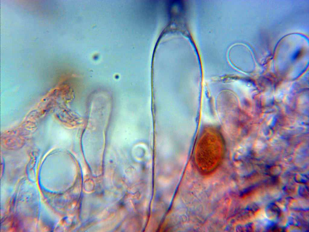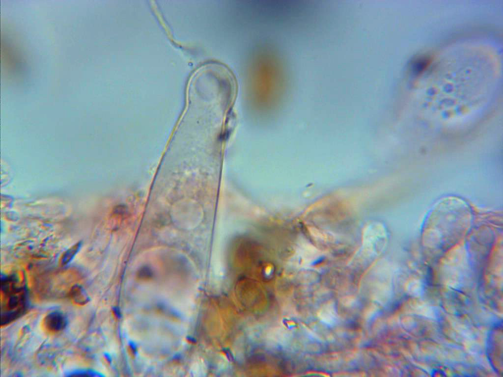 Pleurocistidios escasos pero de gran tamaño, el de la imágen por encima de las 70 micras, hialinos de paredes delgadas y terminando en un cuello mas estrecho.