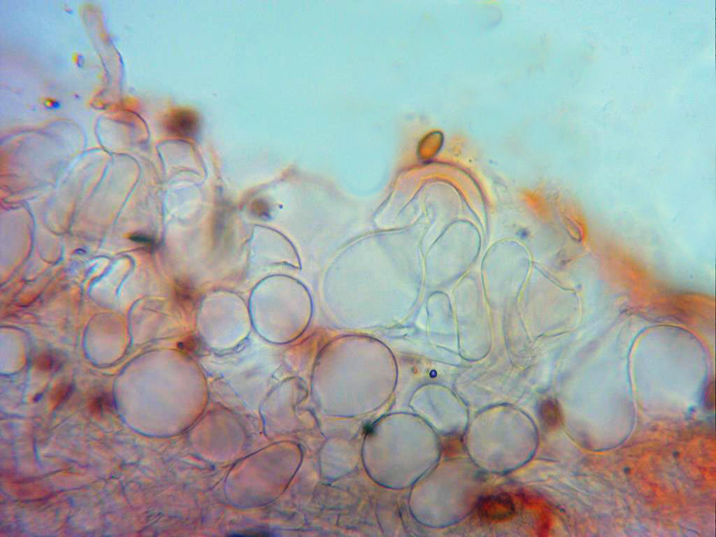 Suprapellis compuesta por hifas entre esféricas y piriformes, pedunculadas y de un tamaño considerable de entre 32 y 55 micras.