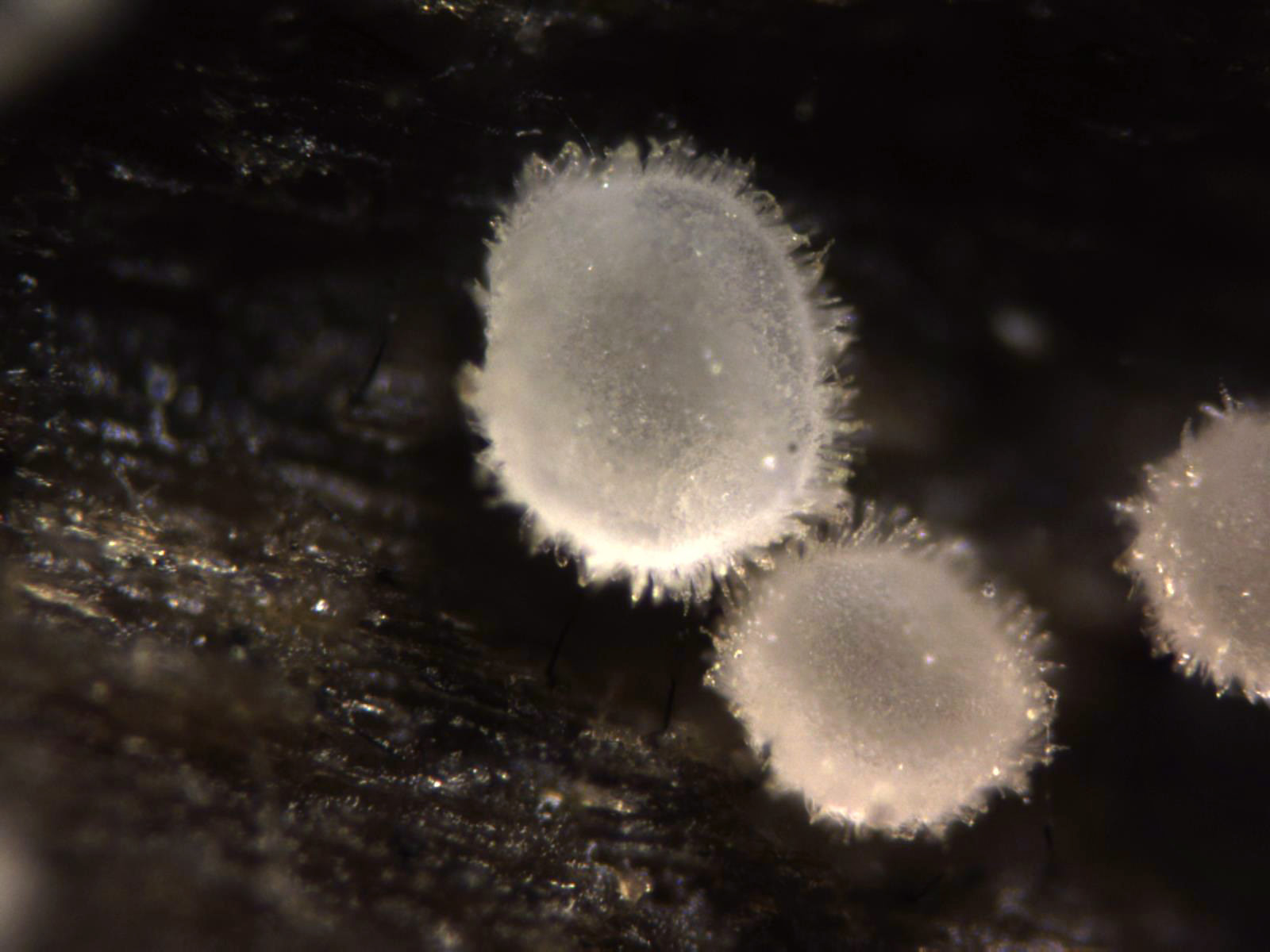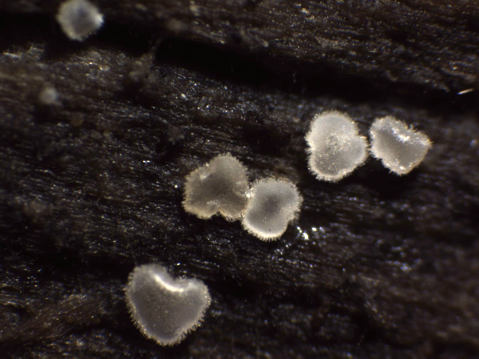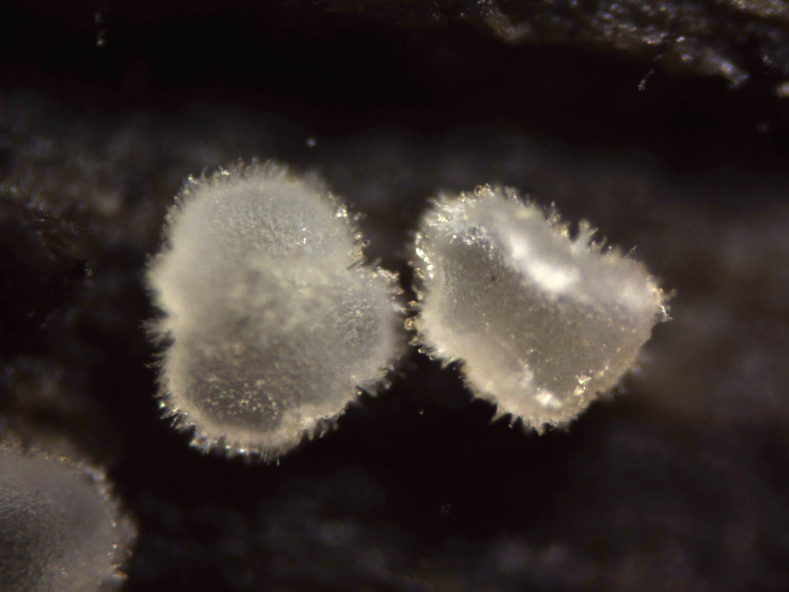 Apotecios en con forma de disco, transparentes y borde de los mismos piloso.