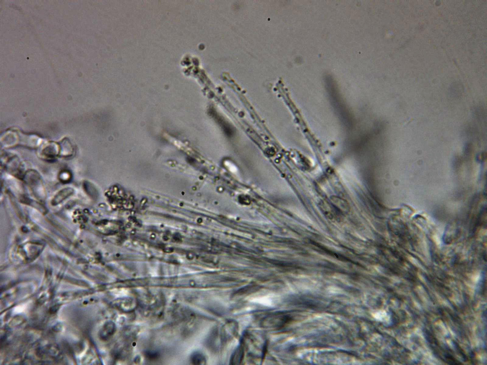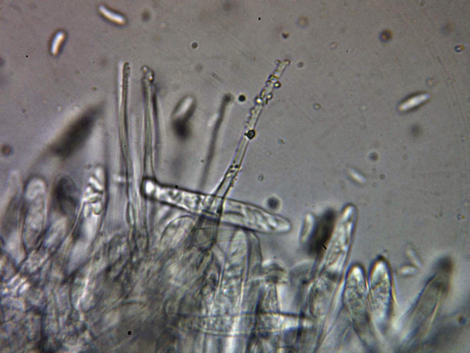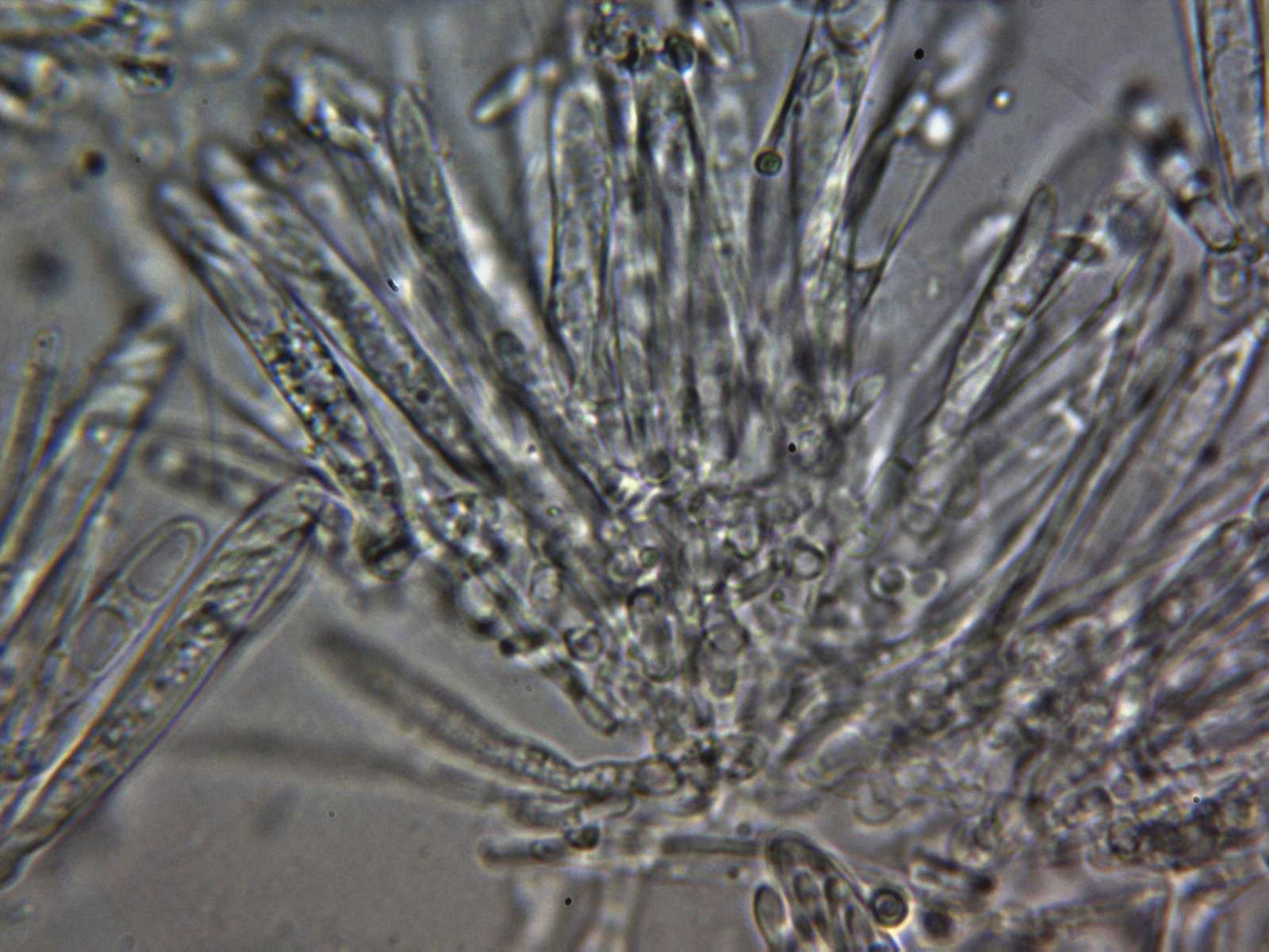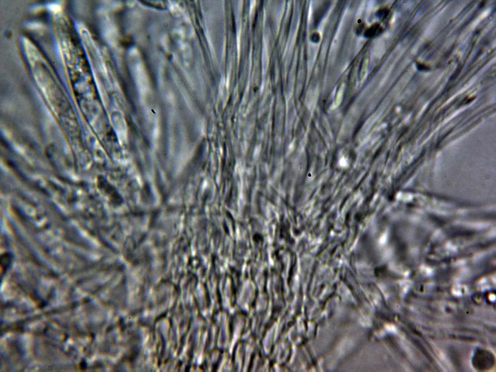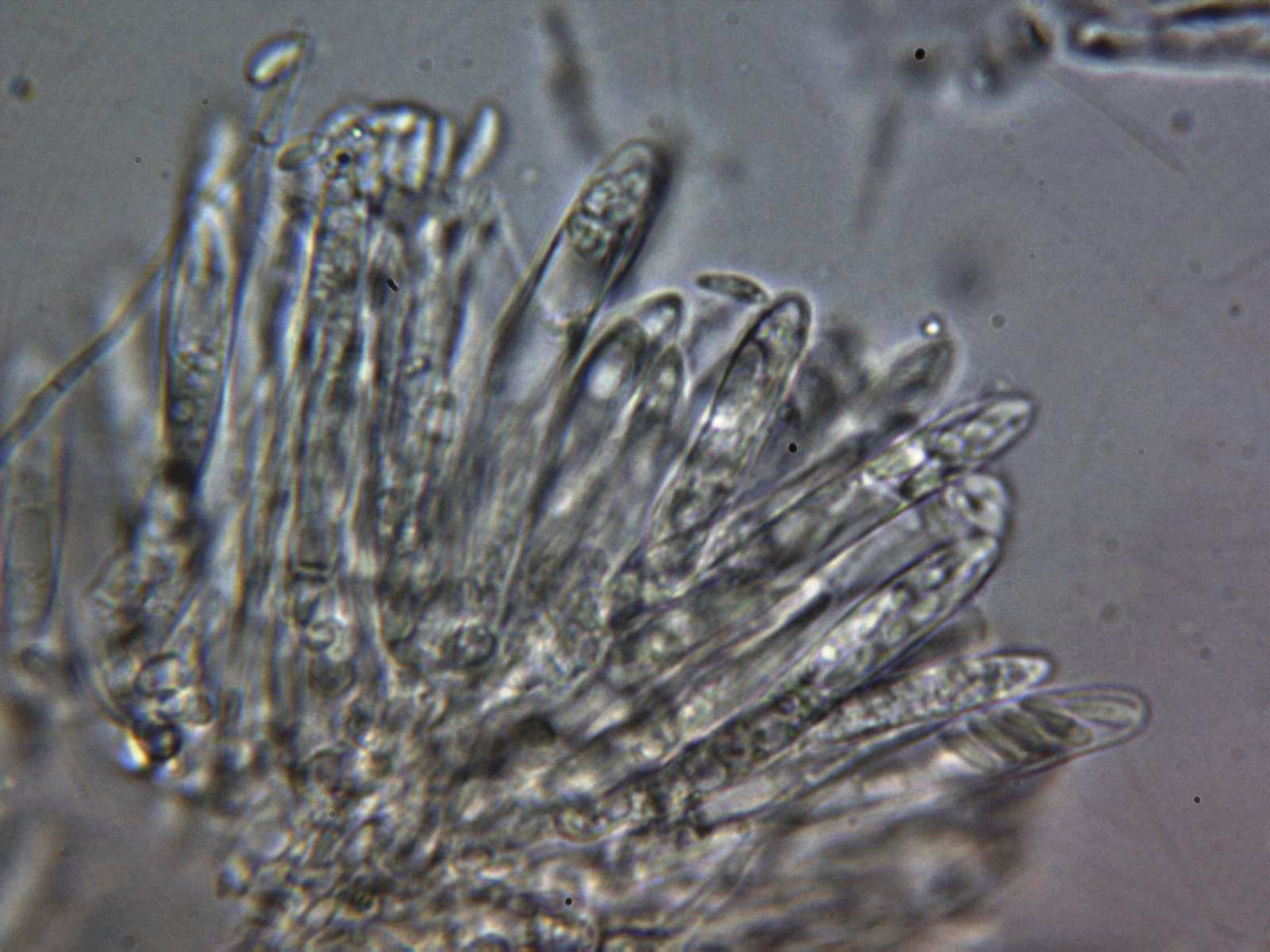 Paráfisis en solución de Rojo Congo diluido, muy escasas y de difícil observación, filiformes con una longitud parecida a las ascas y una anchura de tan solo 1,3 a 1,6 µm.