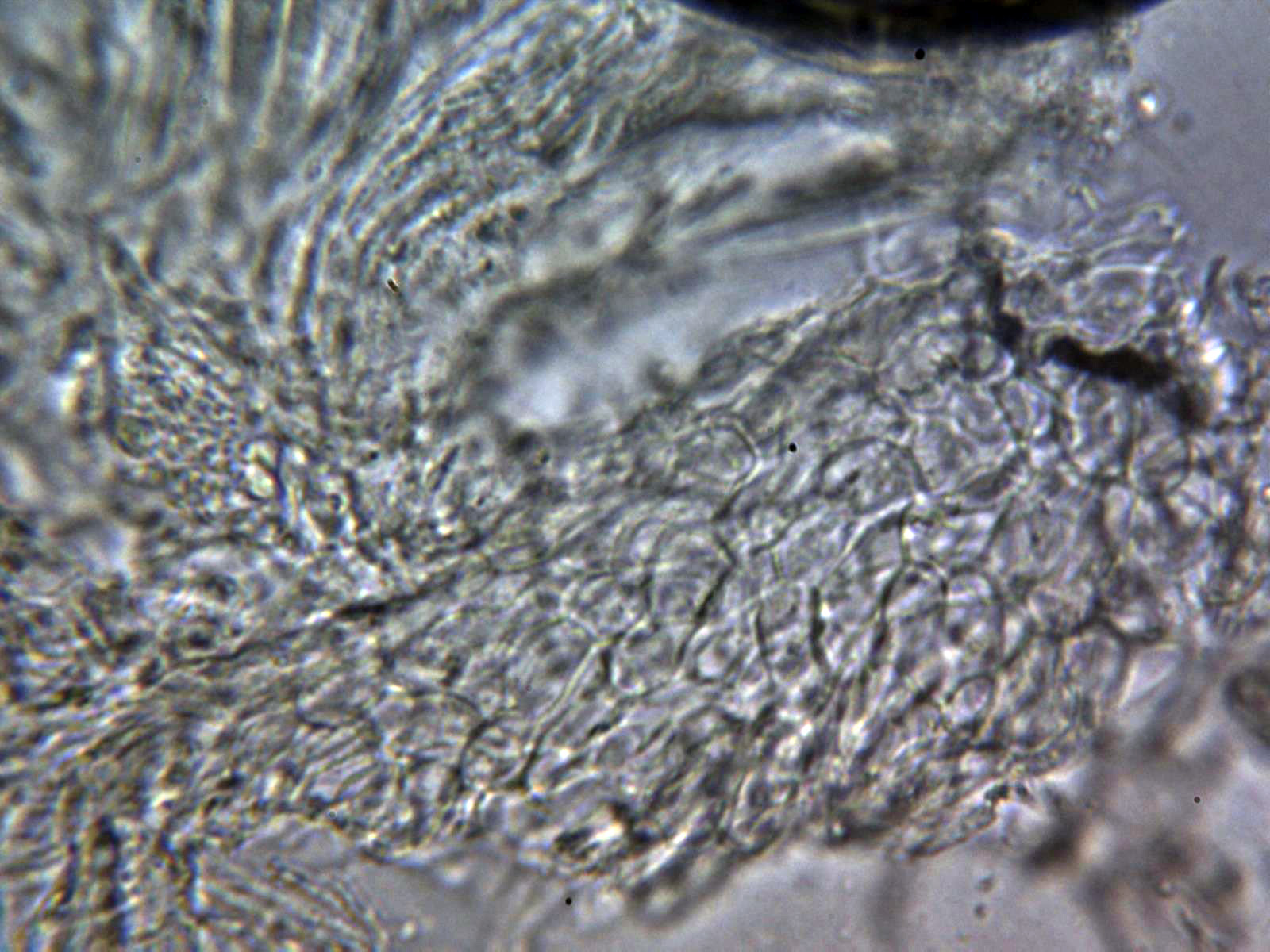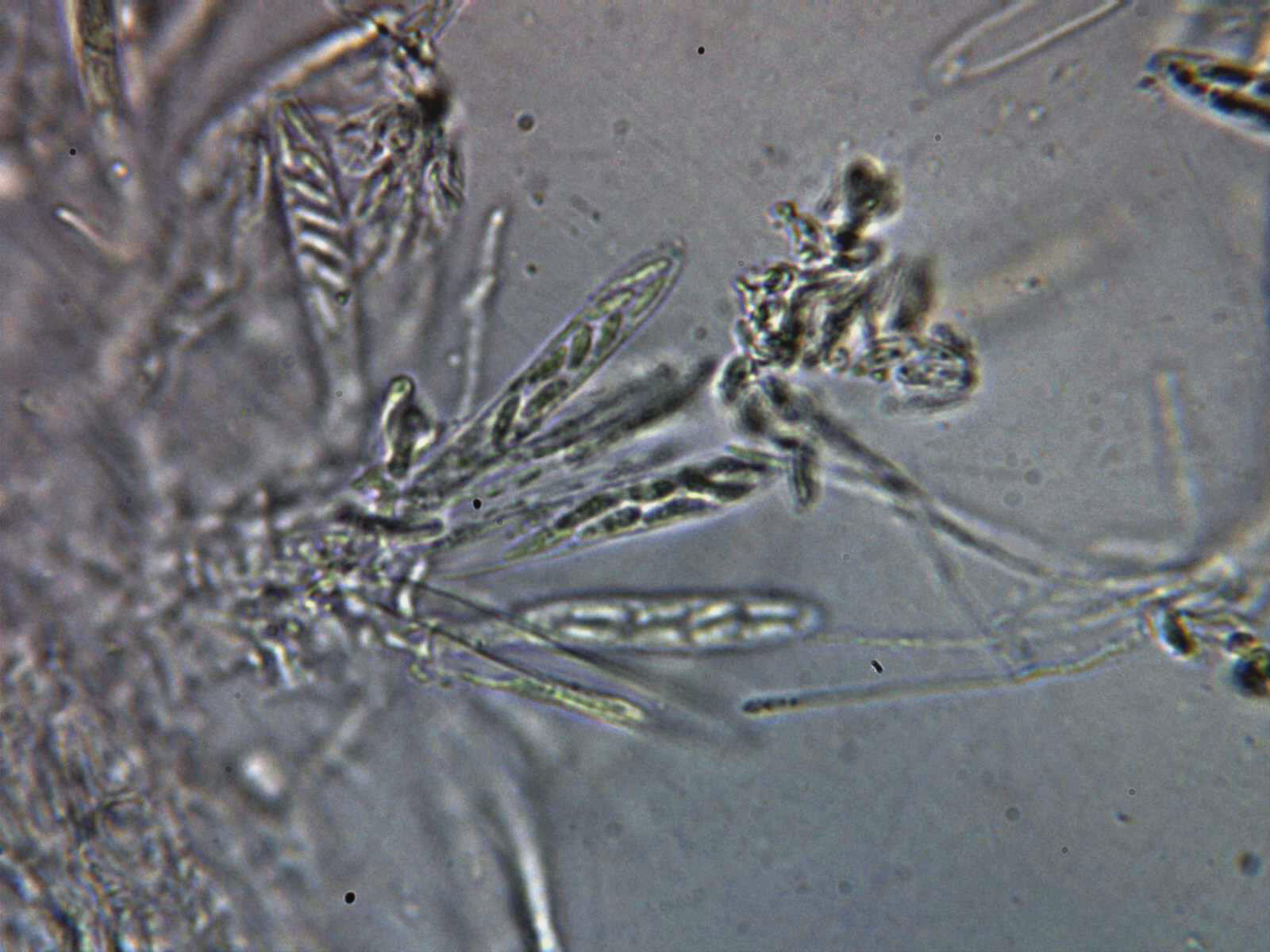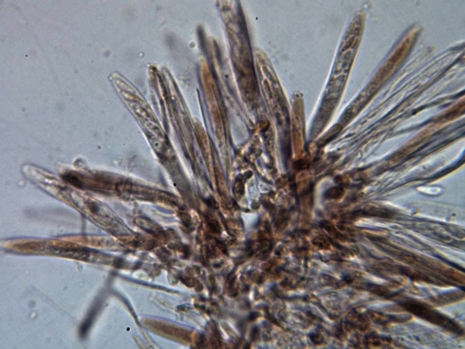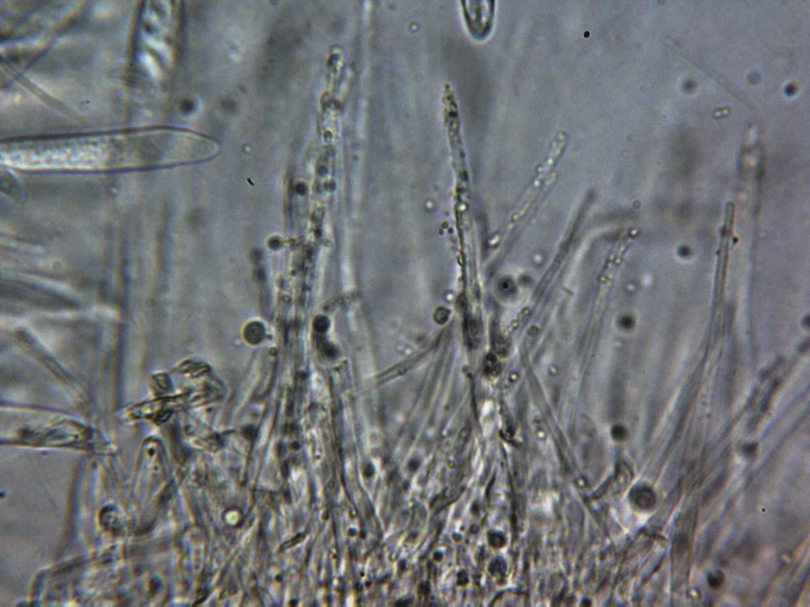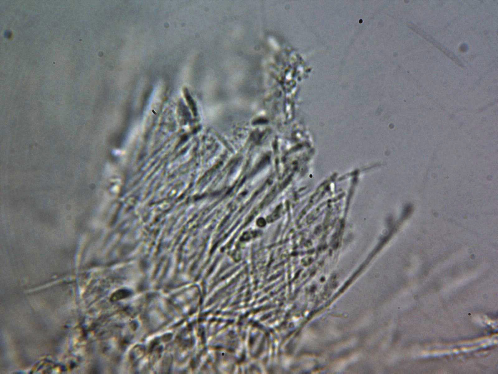 Paráfisis en solución de Rojo Congo diluido, muy escasas y de difícil observación, filiformes con una longitud parecida a las ascas y una anchura de tan solo 1,3 a 1,6 µm.