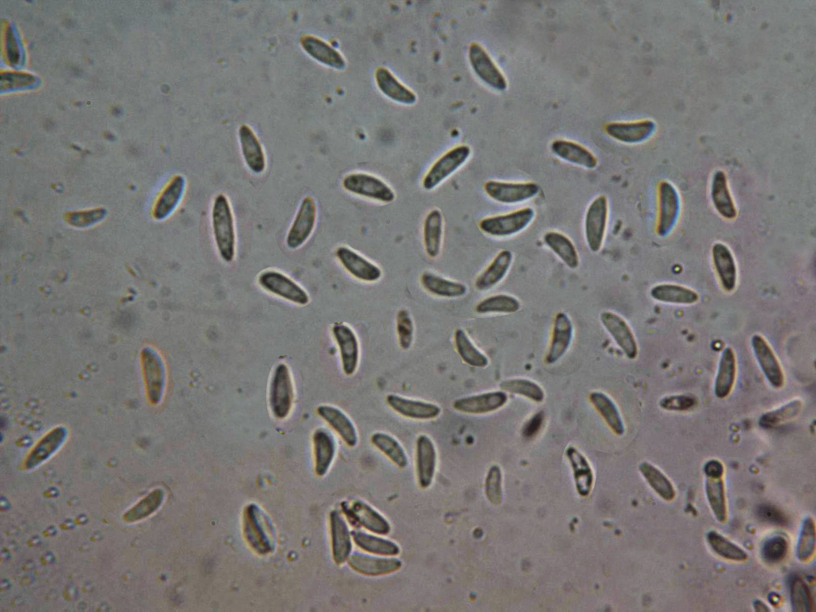 Ascas en solución de Rojo Congo diluido, las de la imagen con unas medidas de 40,5 a 48,7 µm. de largo por 4,4 a 5,3 µm. de ancho.