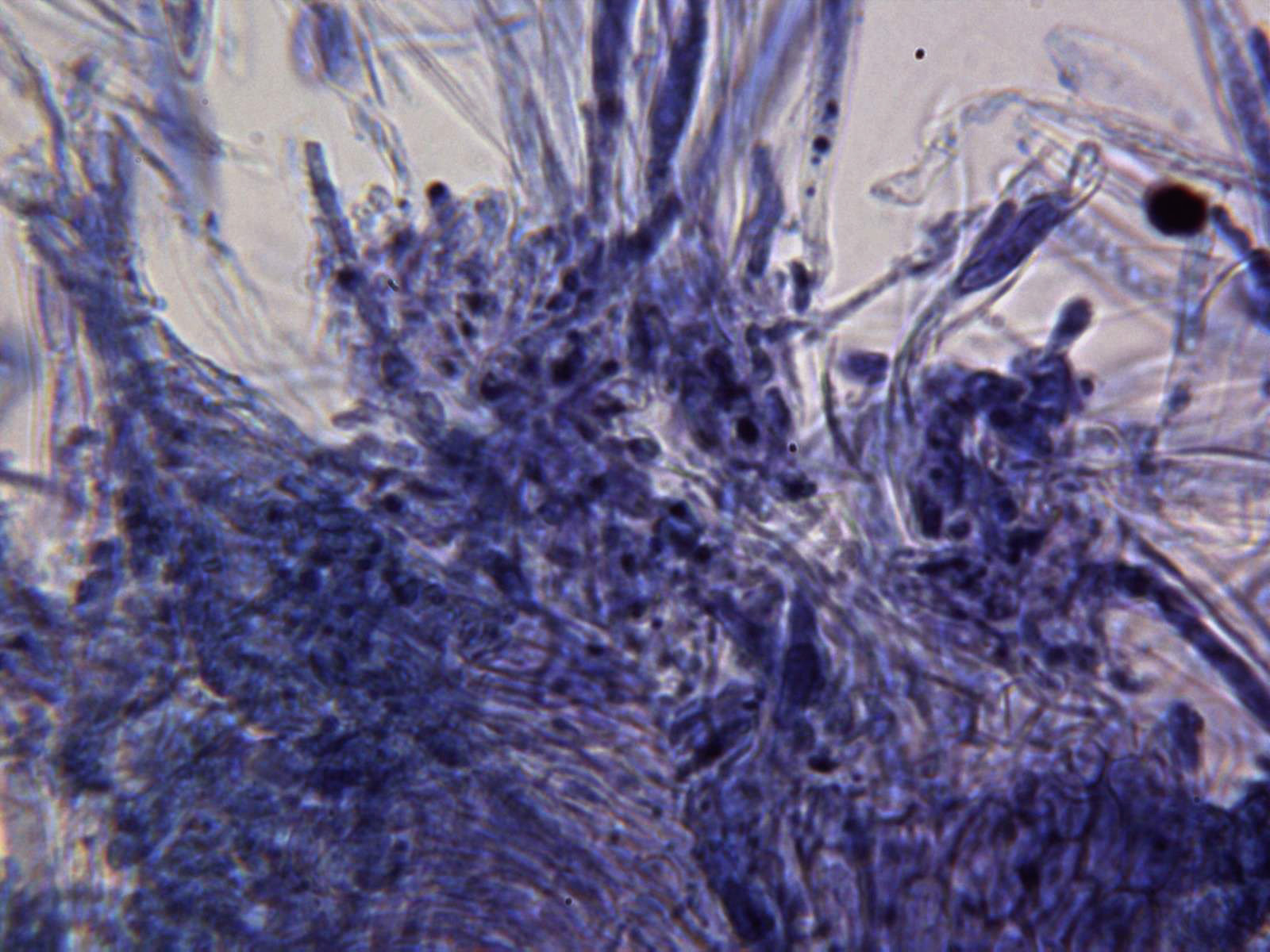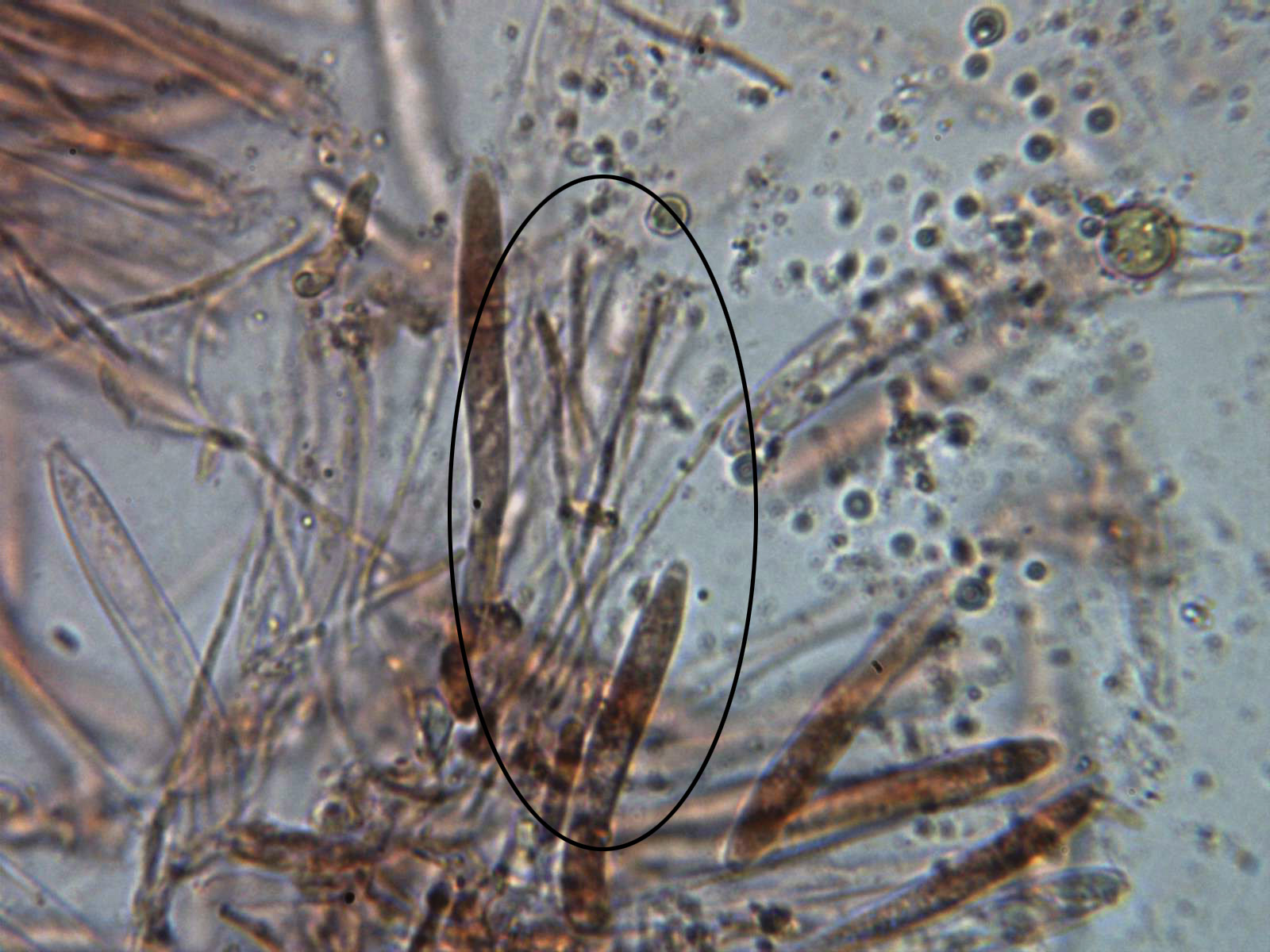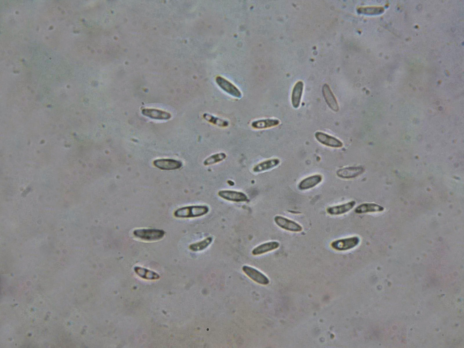 Esporas en Rojo Congo diluido, cilíndricas, estrechadas en los extremos y algo alantoides, con gotas de grasa en su interior y unas medidas de 6;7,8 (8,2) X 2,1;2,6 µm.