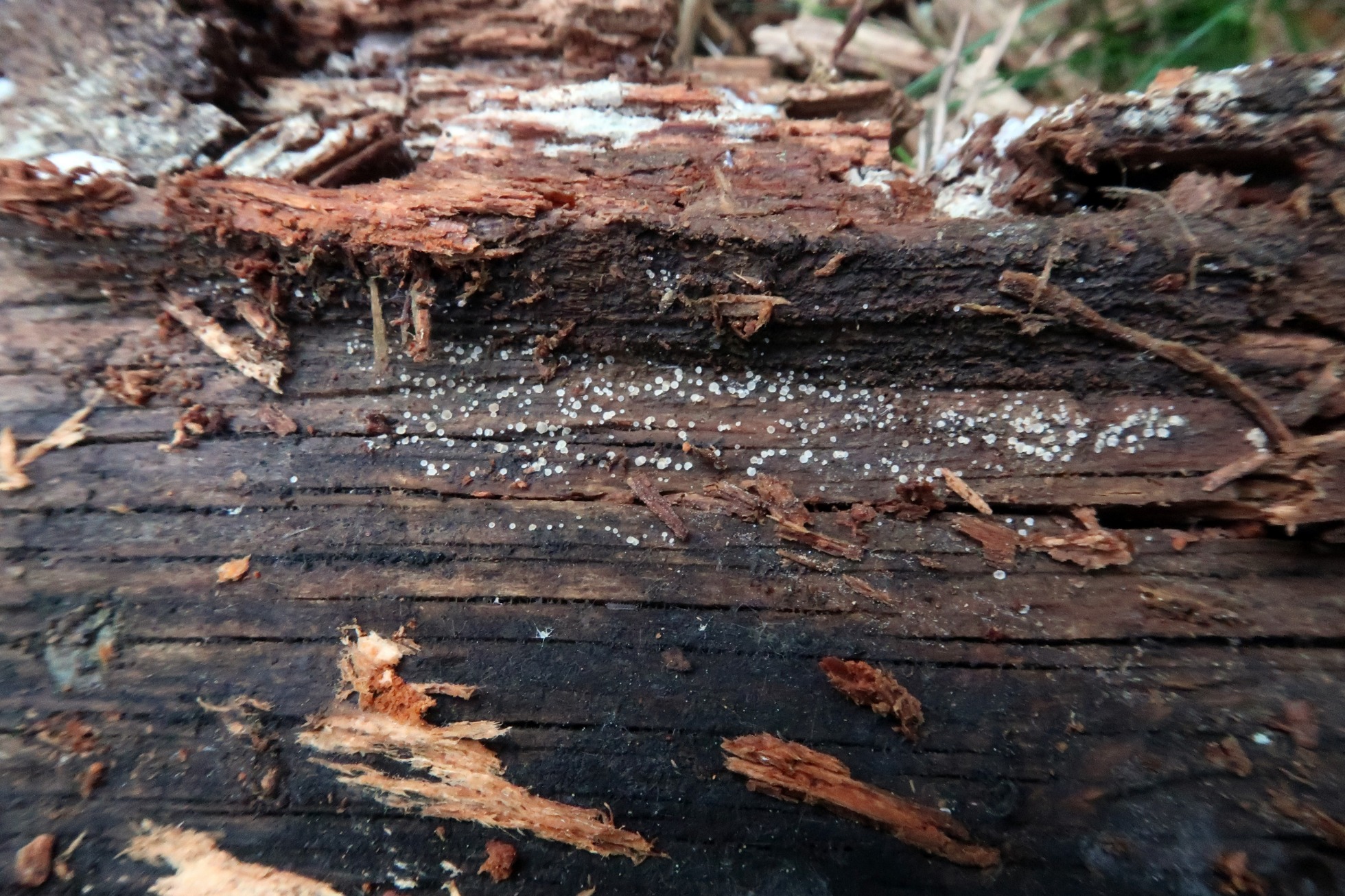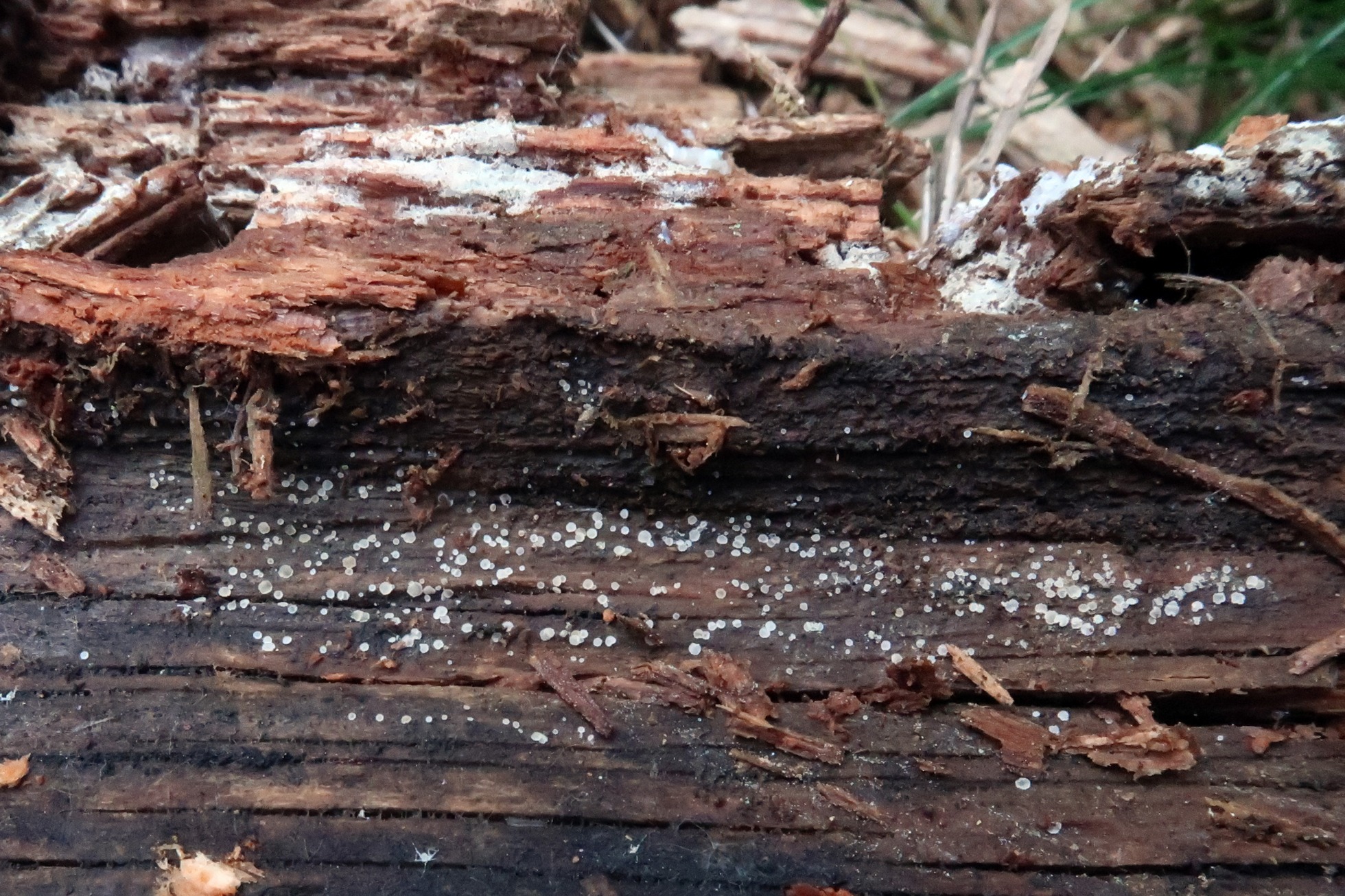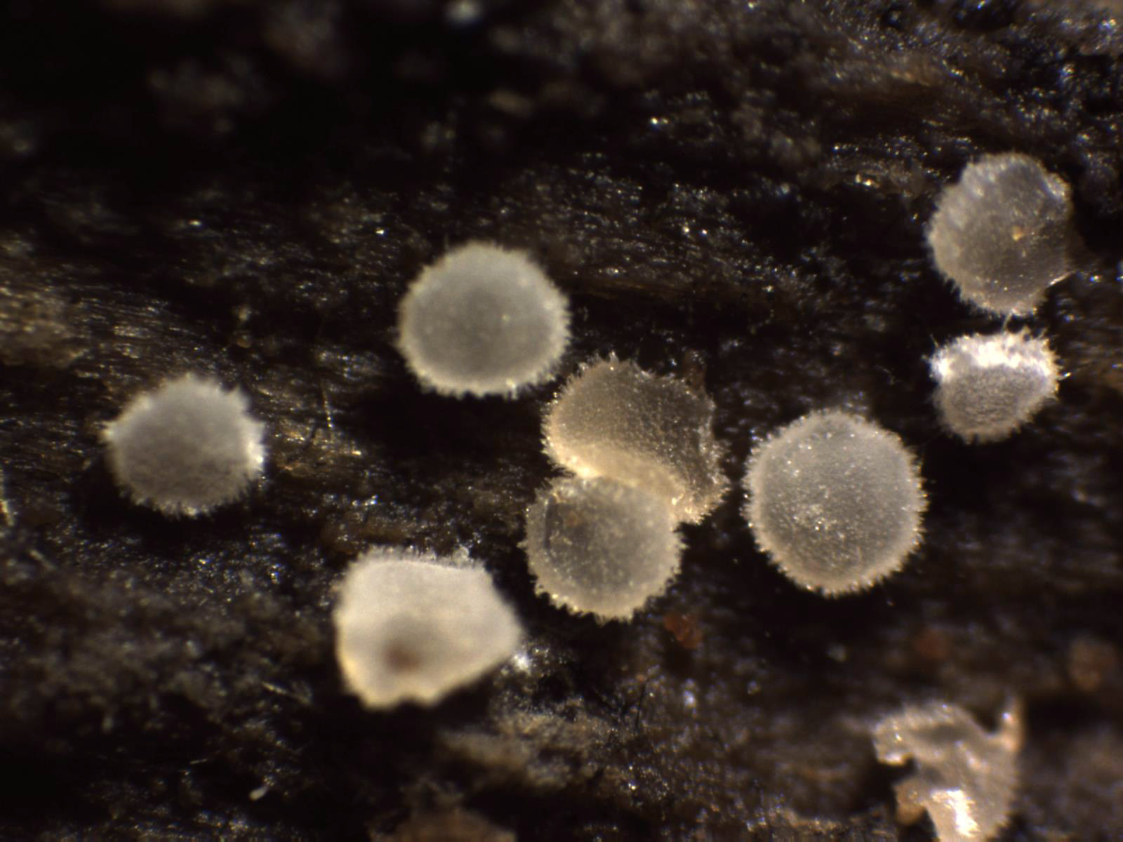 Muy diminutos apotecios fotografiados en pinar de altura bajo un tronco ya bastante degradado de Pinus uncinata, compartiendo espacio con una Mollisia, un Mixomiceto y una roña blanca, los tres aún pendientes de estudio.