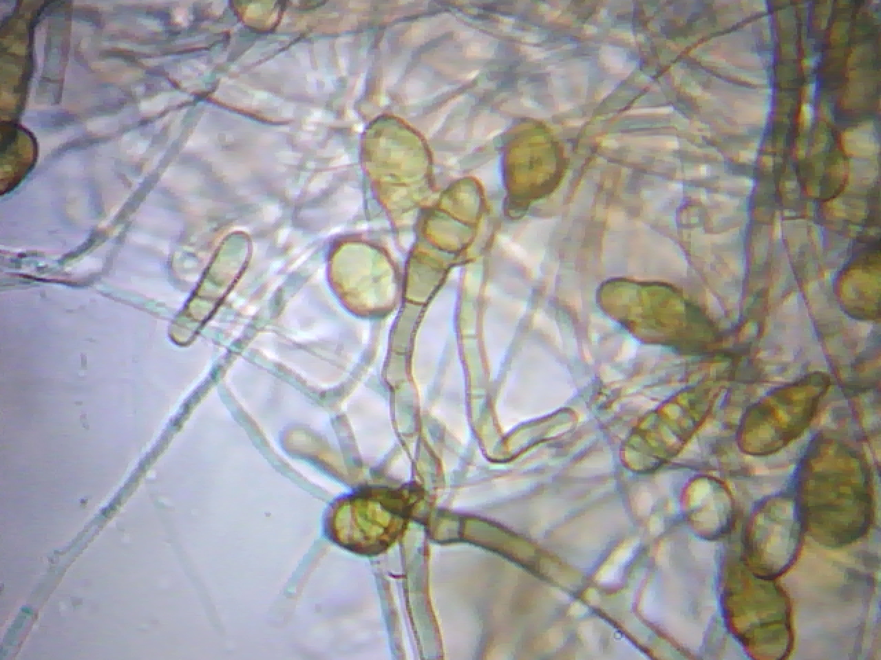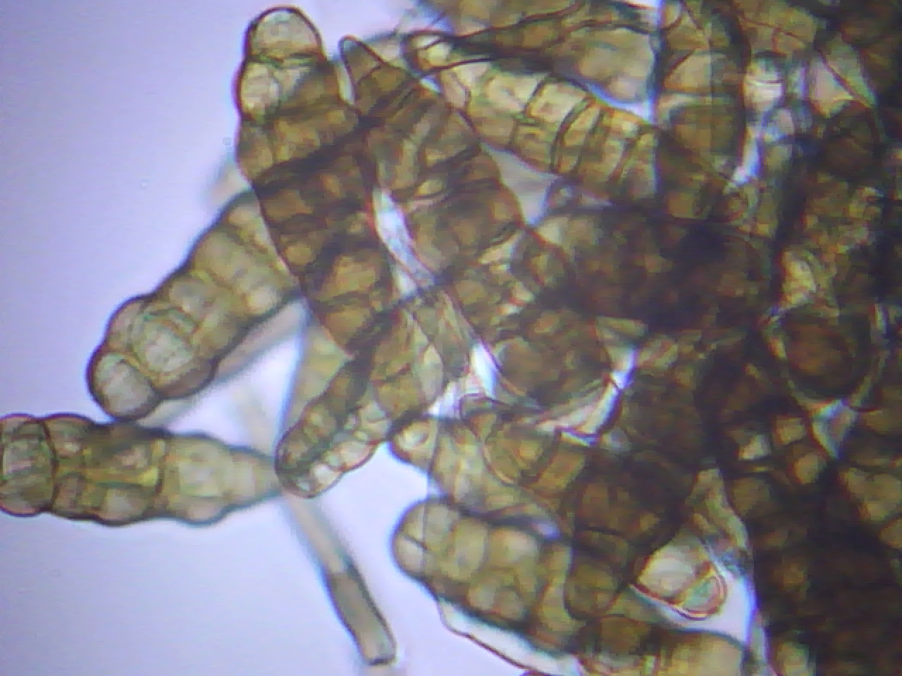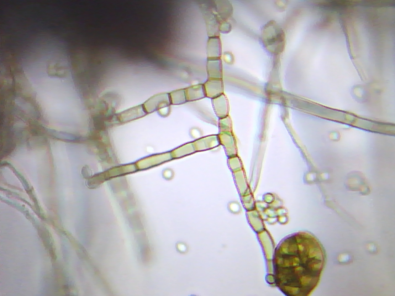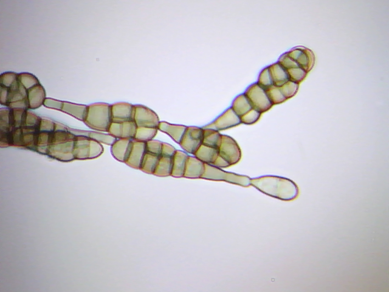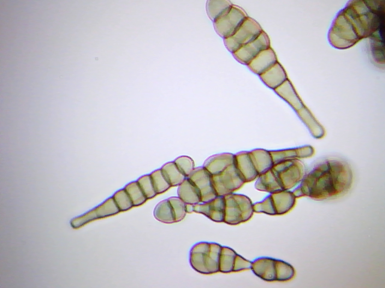 Al parecer esto es un buen ejemplo de a lo que llamamos moho y lo que os muestro en las fotos son conidióforos septados de color café, según he podido comprovar no estaban en cadena.