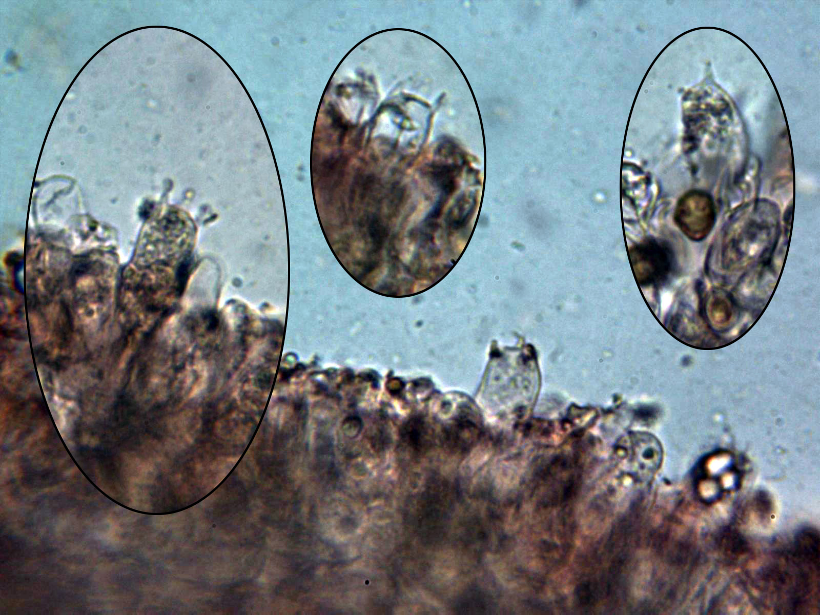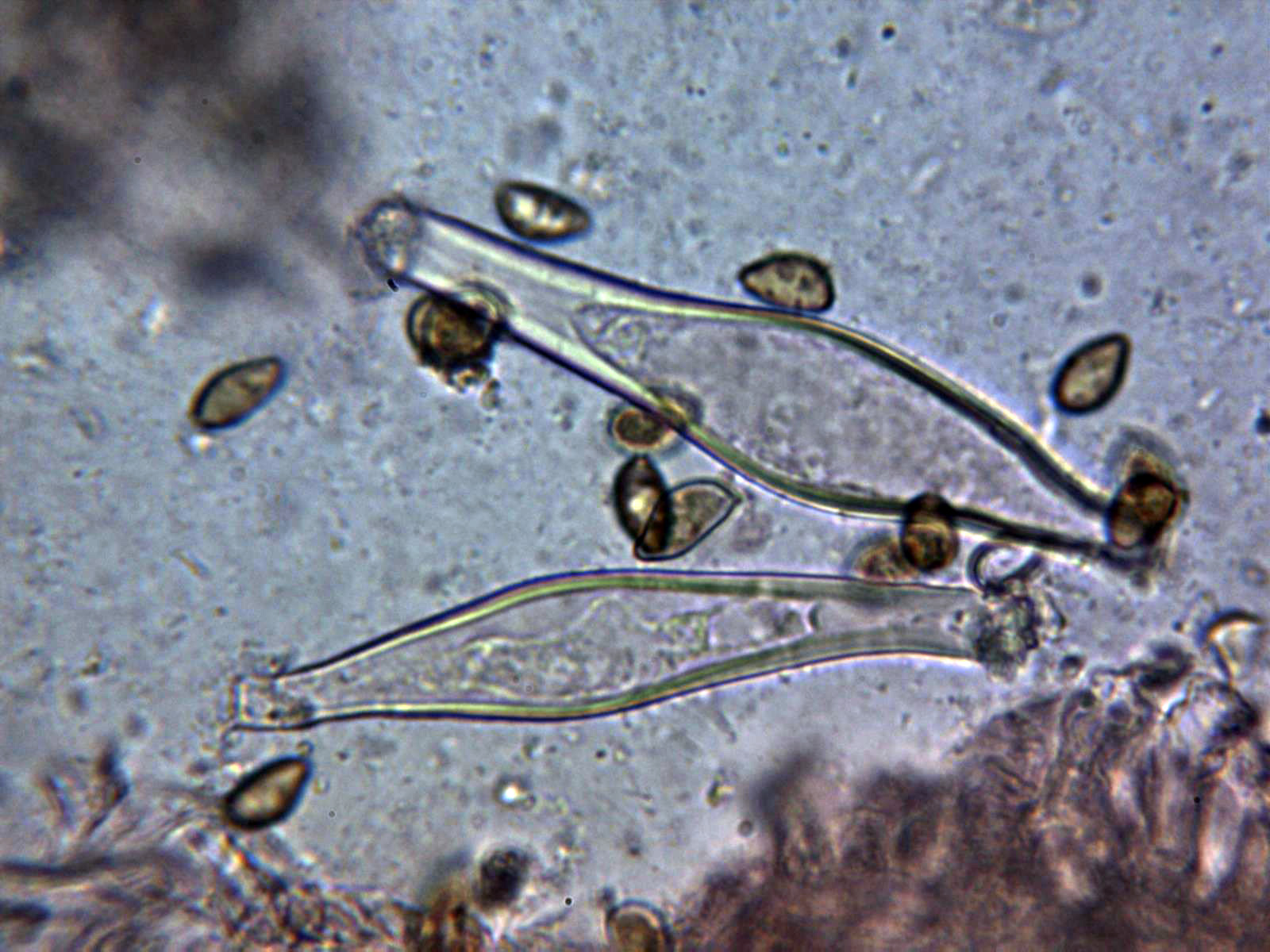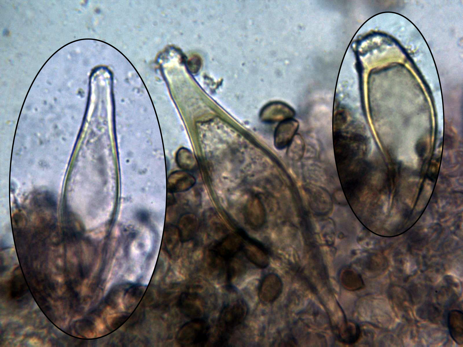 Queilocistidios fusiformes, alargados y con restos de cristalizaciones en el ápice.