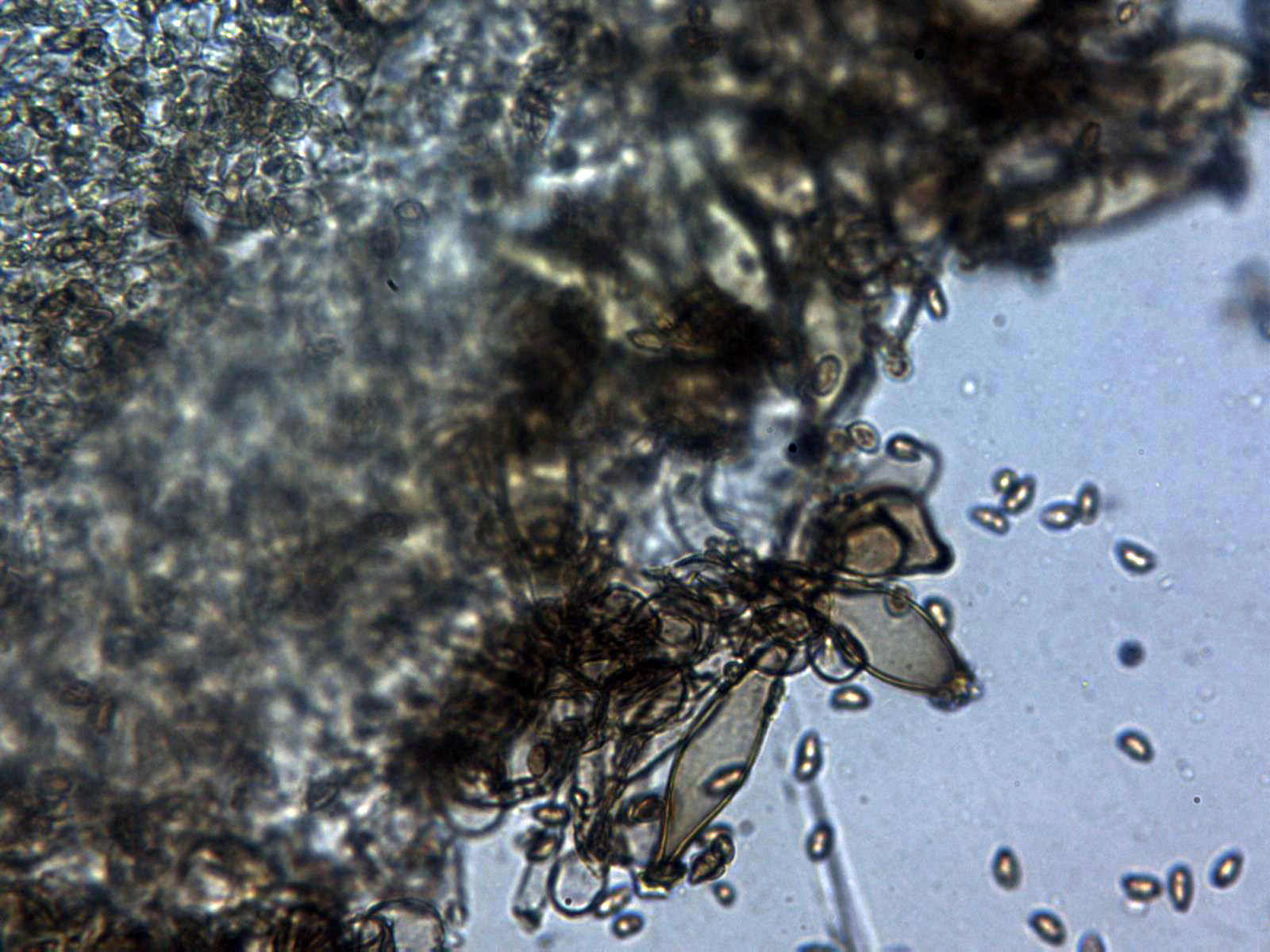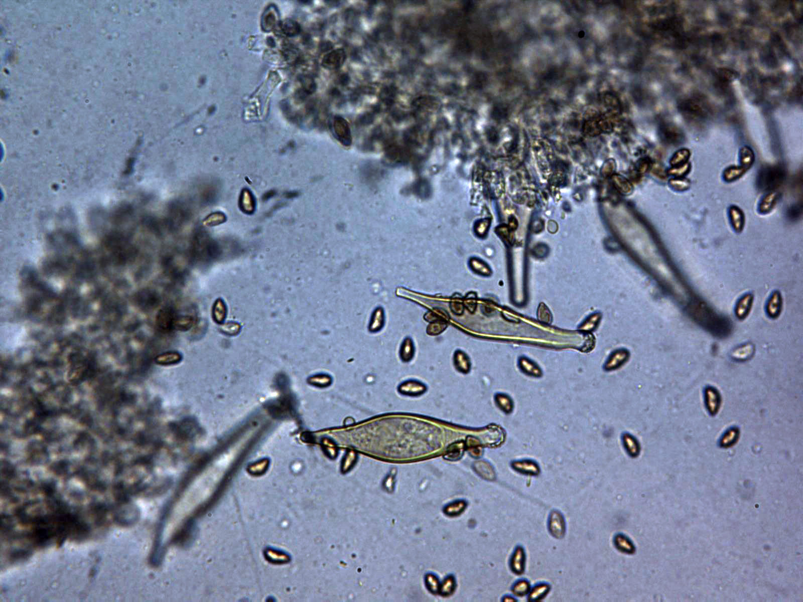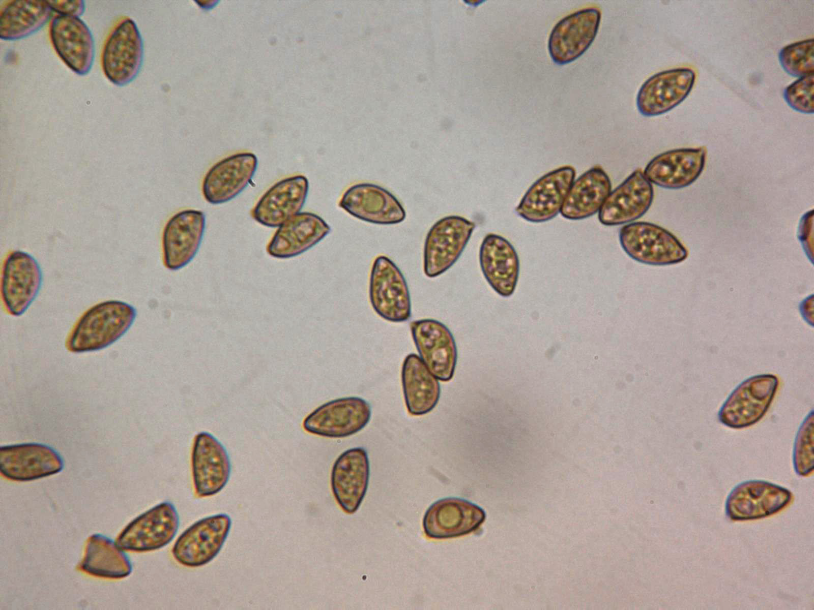 Esporas almendradas de pared gruesa, con apícula, color pardo amarillento y con granulaciones en su interior, en mis mediciones de 8,9;10,4 X 4,5;5,8 micras.