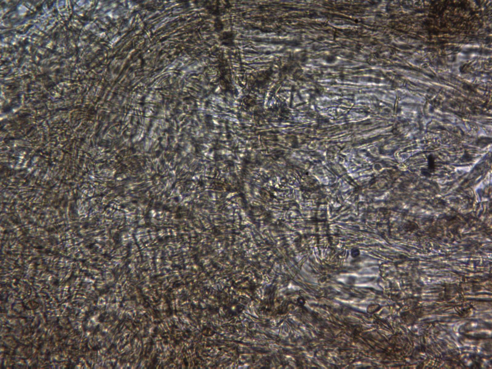 Cutícula a 400 aumentos, filamentosa con gruesas hifas pigmentadas de color pardo ocráceo.