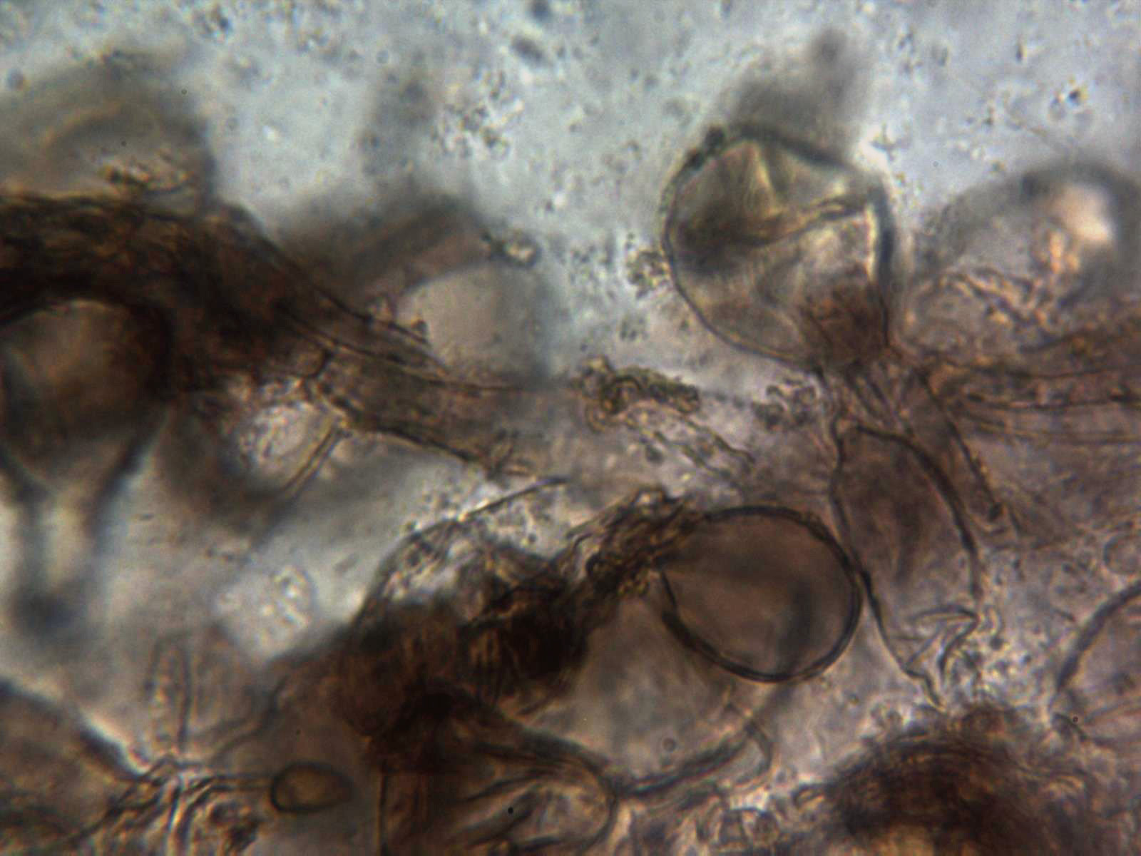 Arista a 1000 aumentos con algunas hifas globosas que se corresponderían con restos del velo.