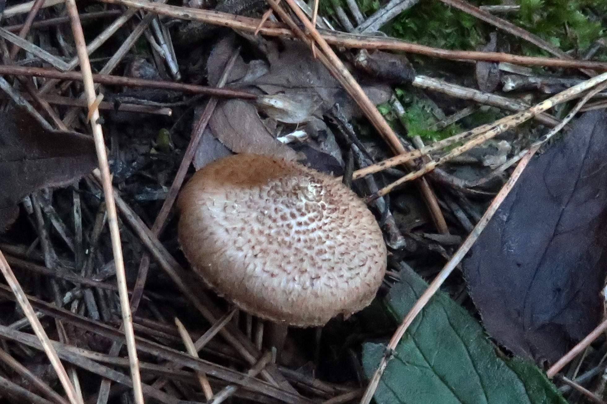 Pequeña seta con sombrero mamelonado, de color marrón, con su superficie cubierta por completo de escamas que sugieren una disposición radial.