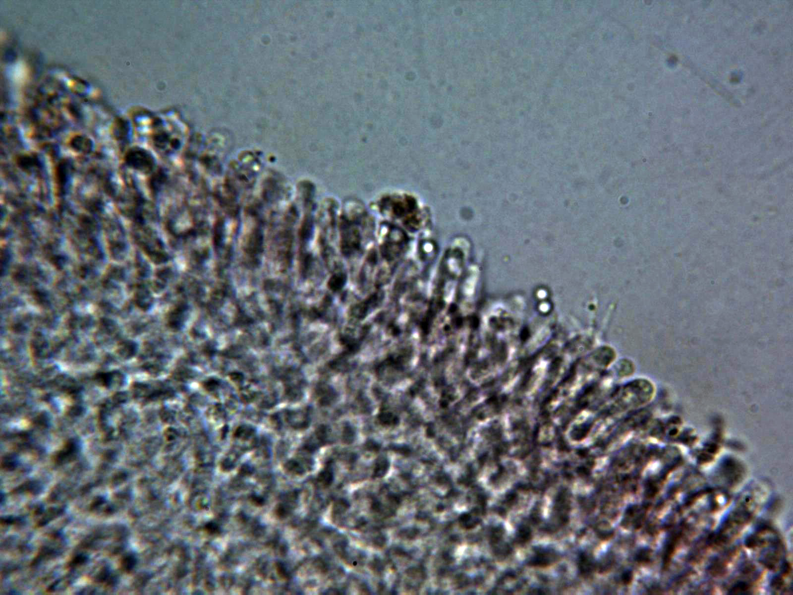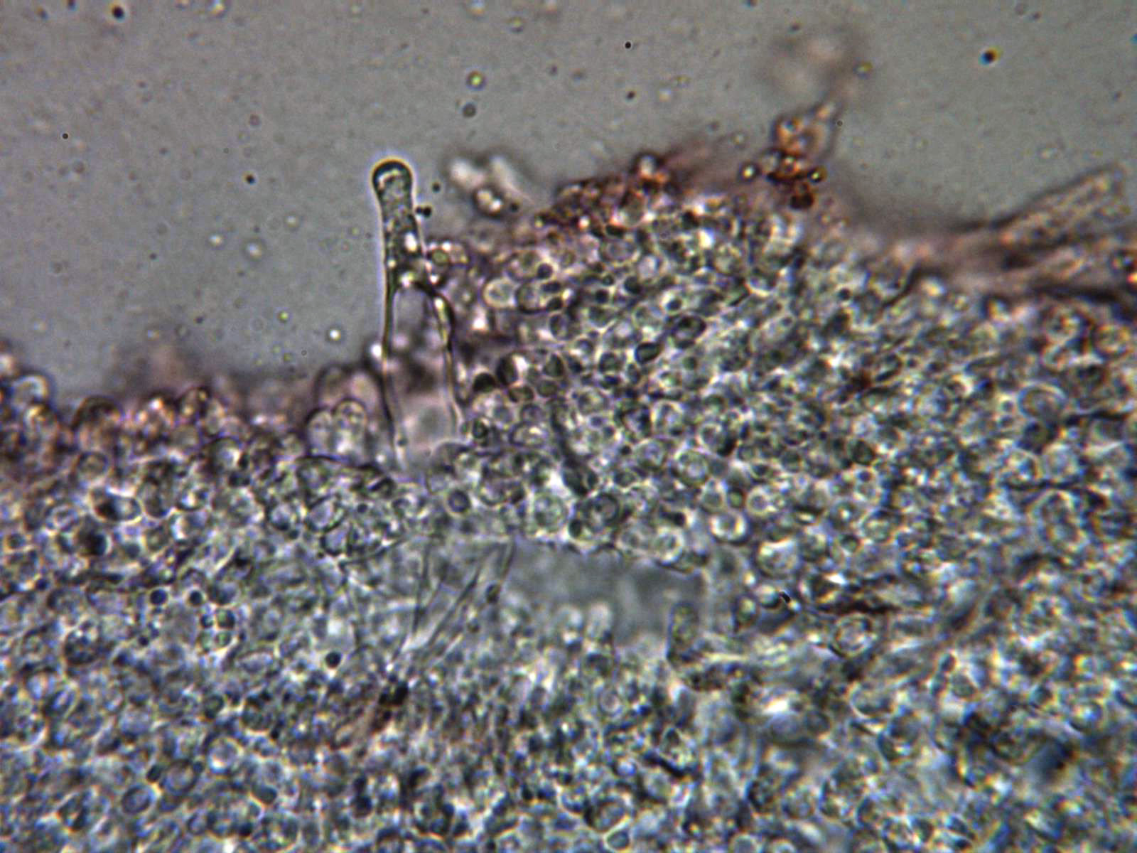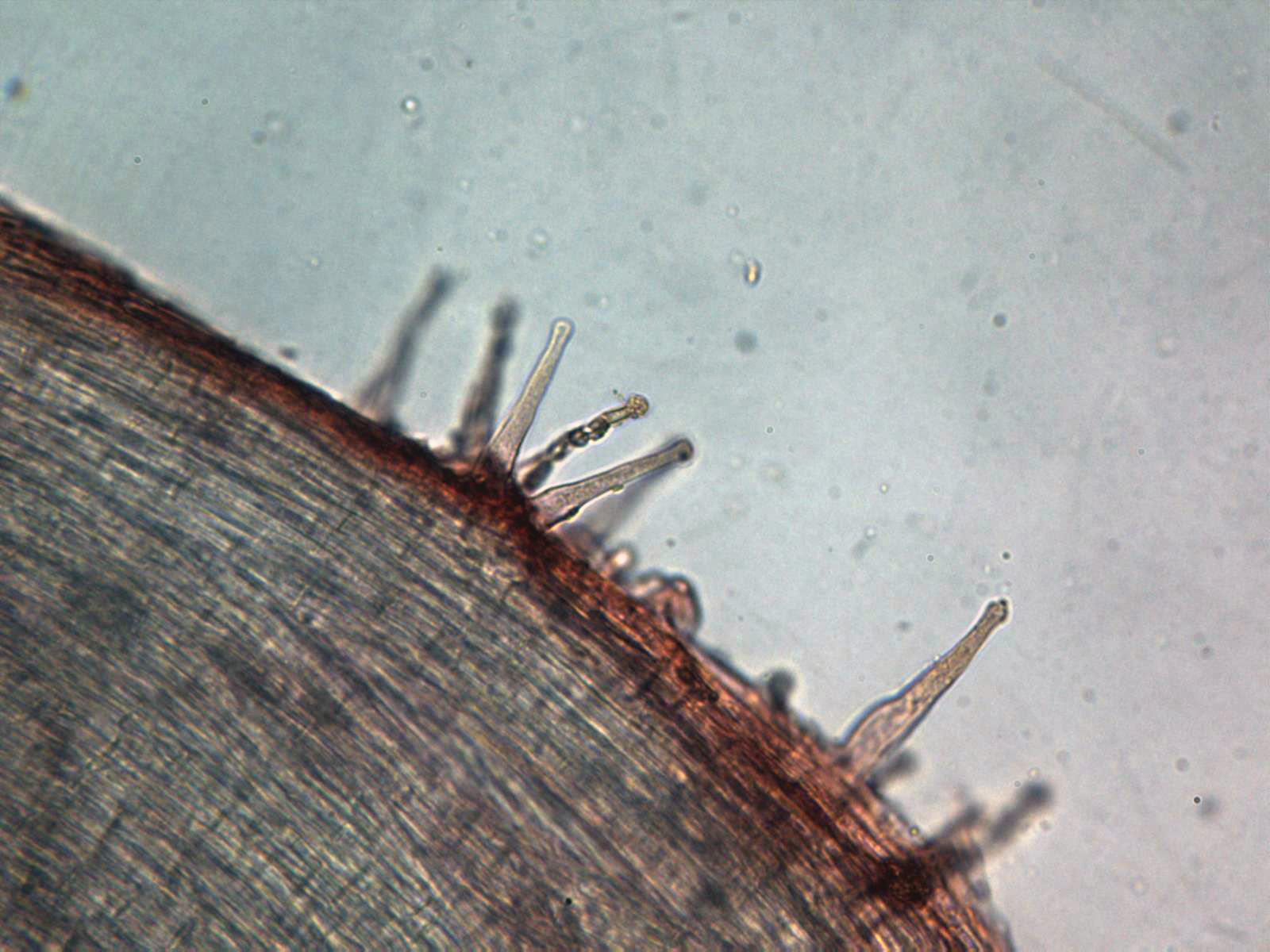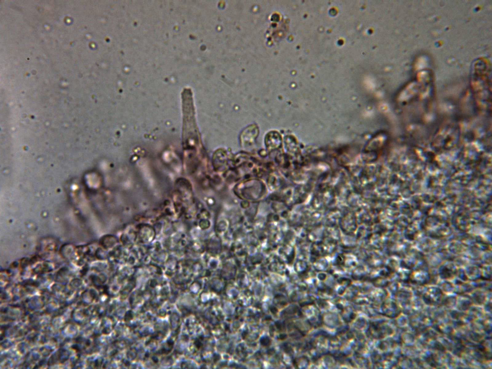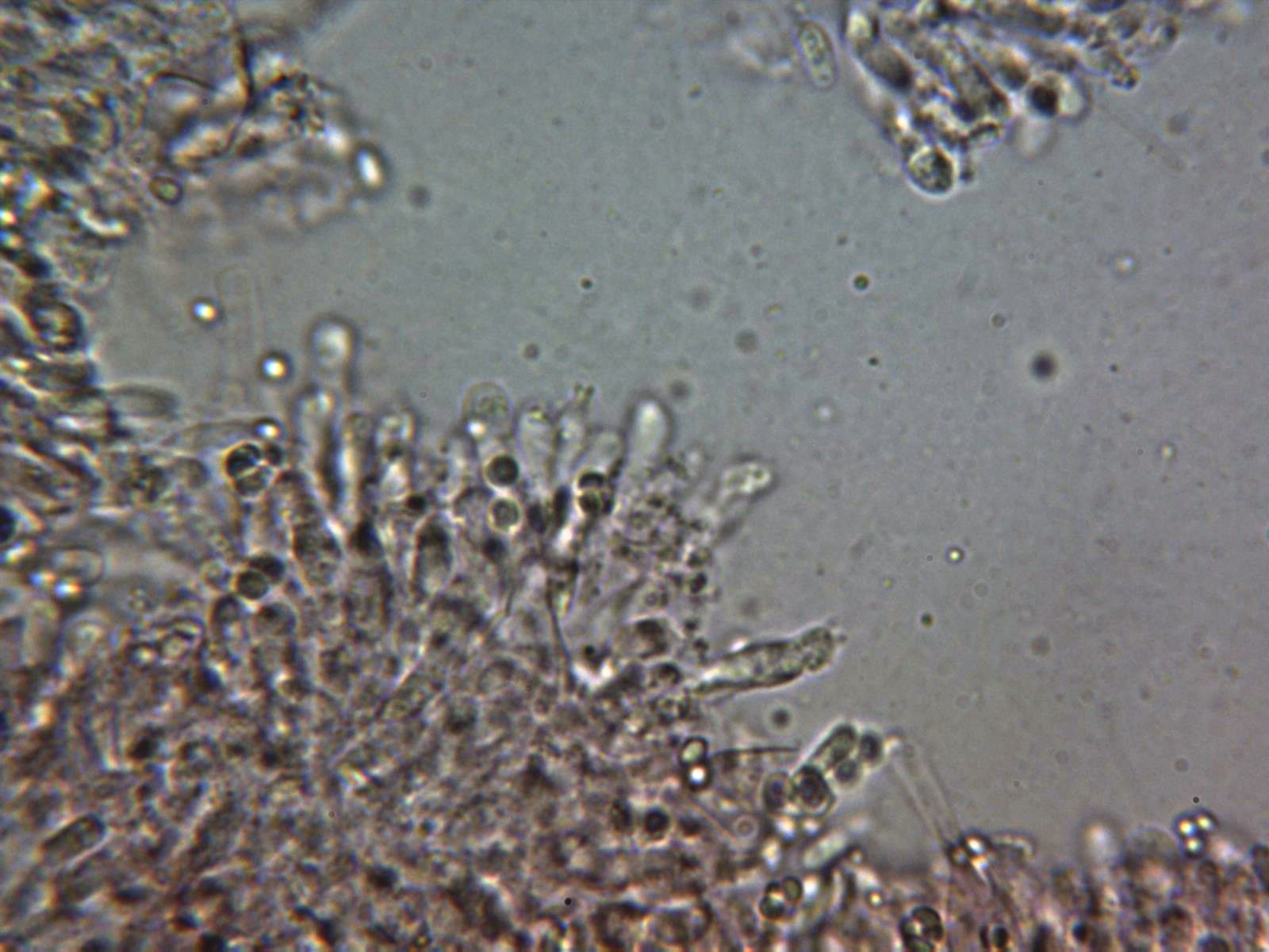 Parte superior del pié con abundantes caulocistidios, los de la imágen a 400 aumentos.