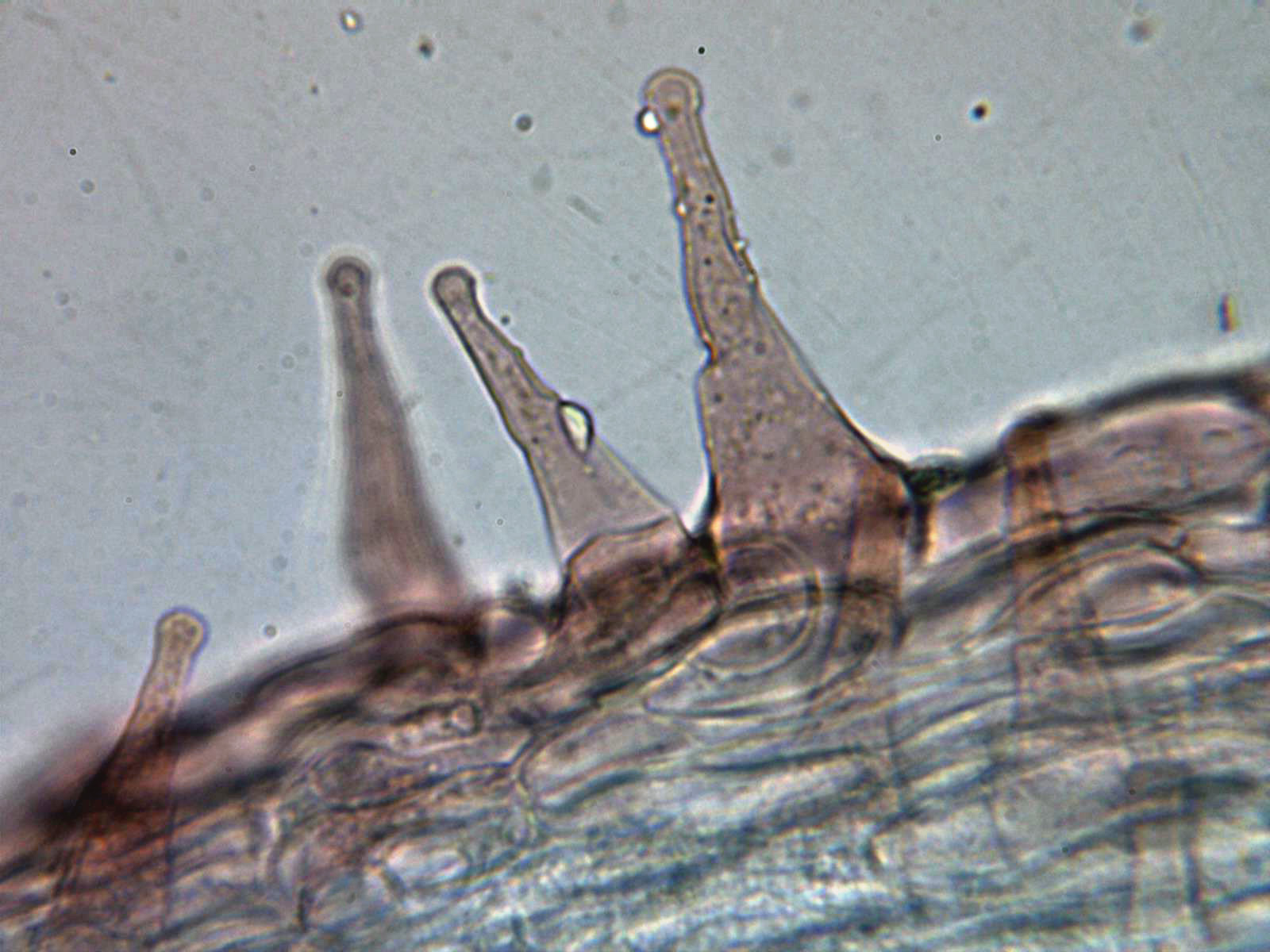 Caulocistidios a 1000 aumentos, ventrudos con un cuello largo y ligeramente capitados.