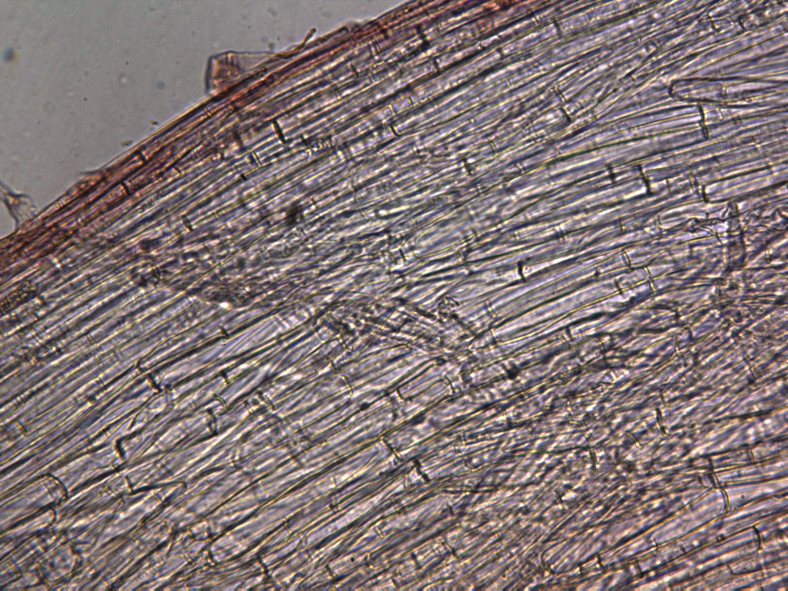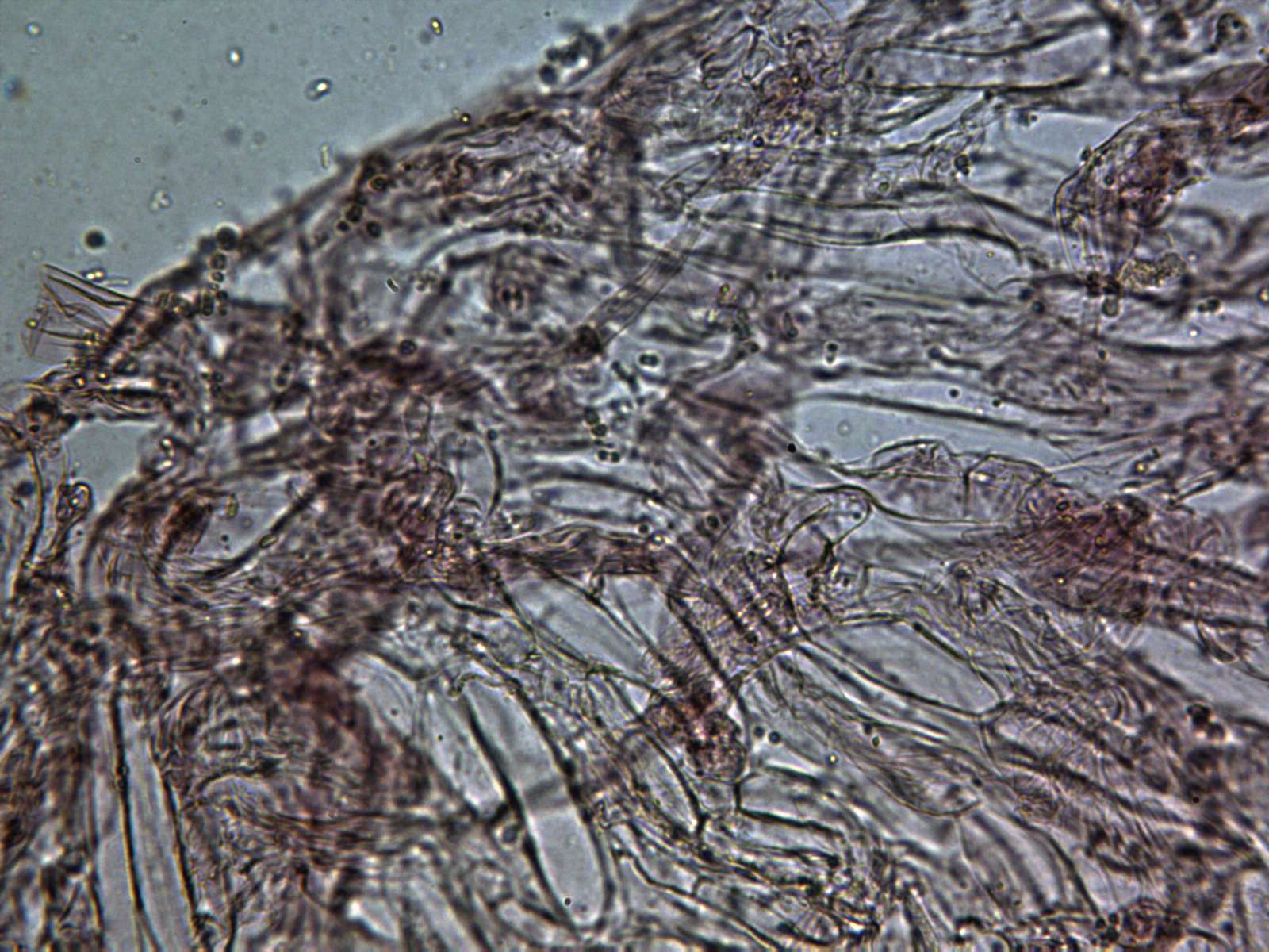 Pileipellis a 400 aumentos, formada por hifas cilíndricas e hialinas con unas pequeñas y abundantes cristalizaciones por encima y en medio de estas.