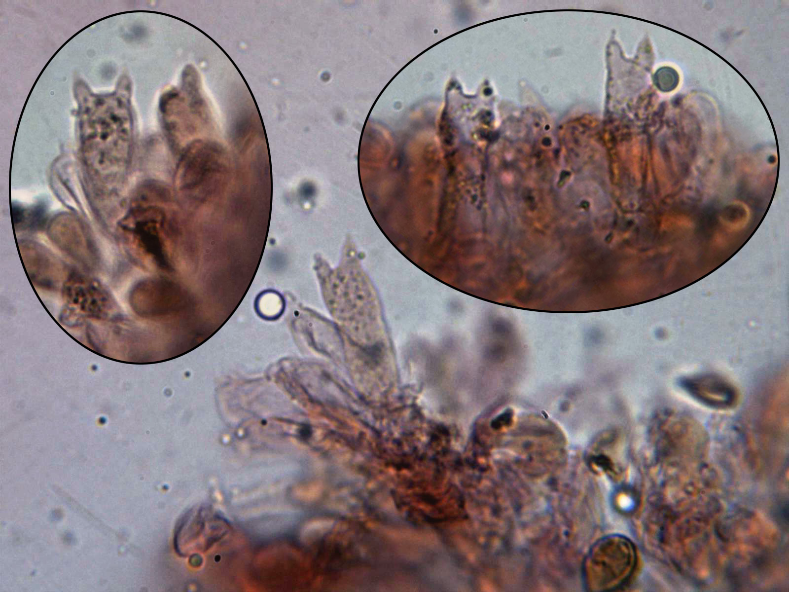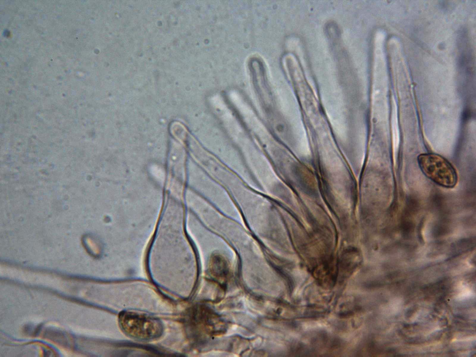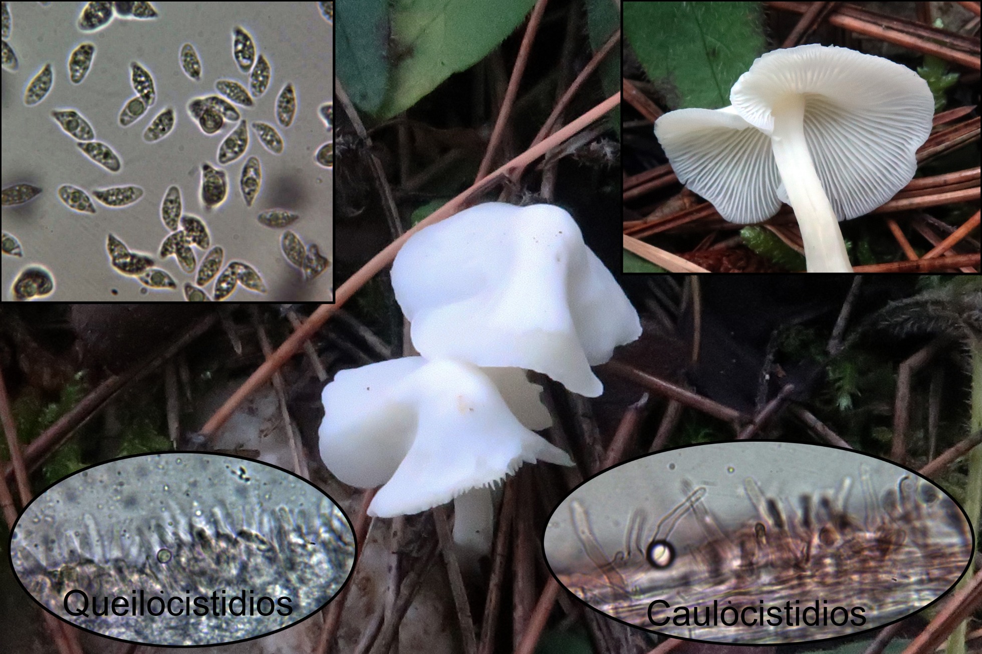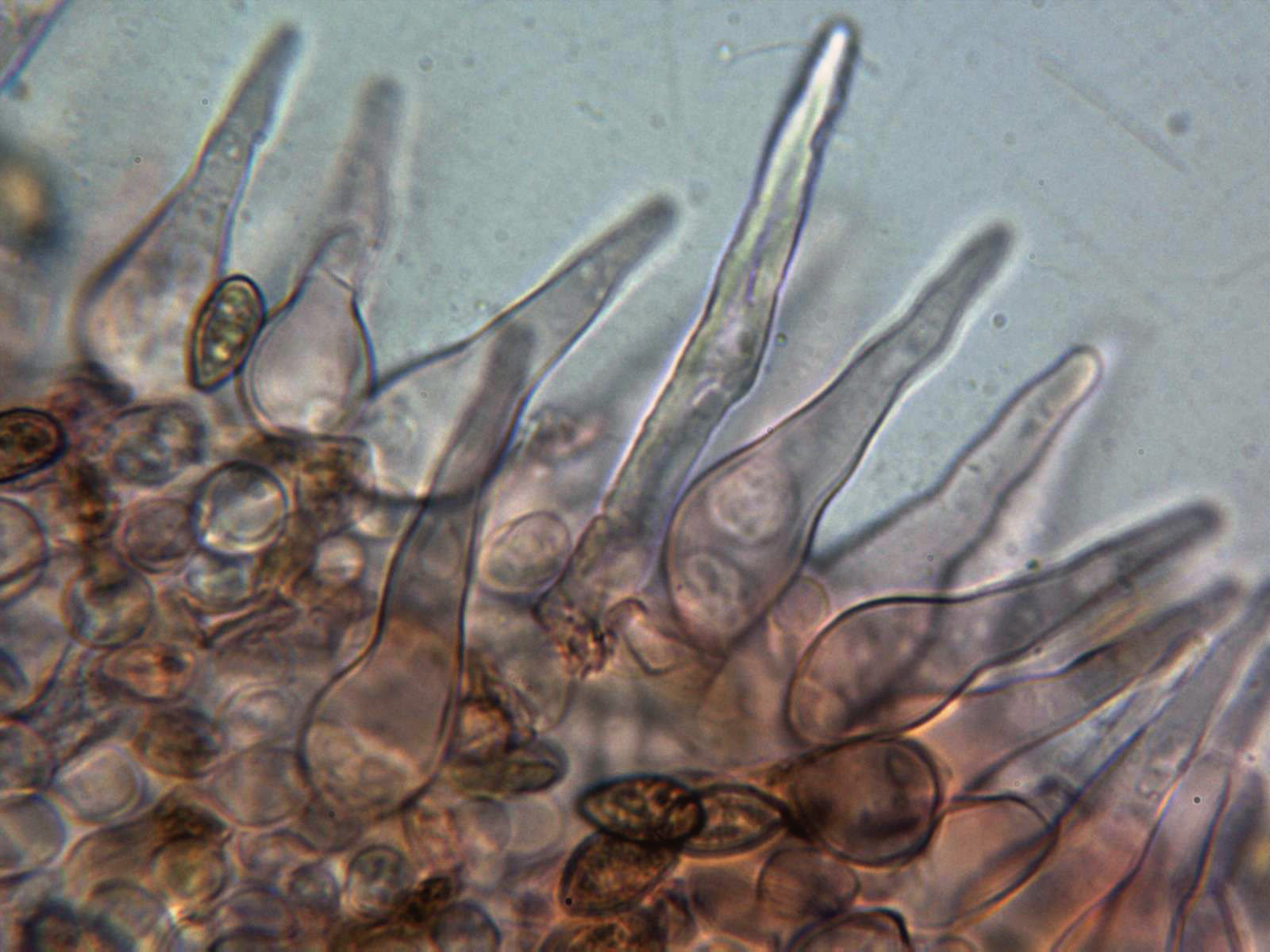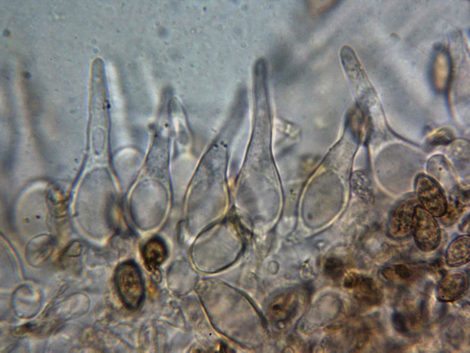 Queilocistidios fusiformes, ensanchados en la base y con un largo cuello sinuoso.