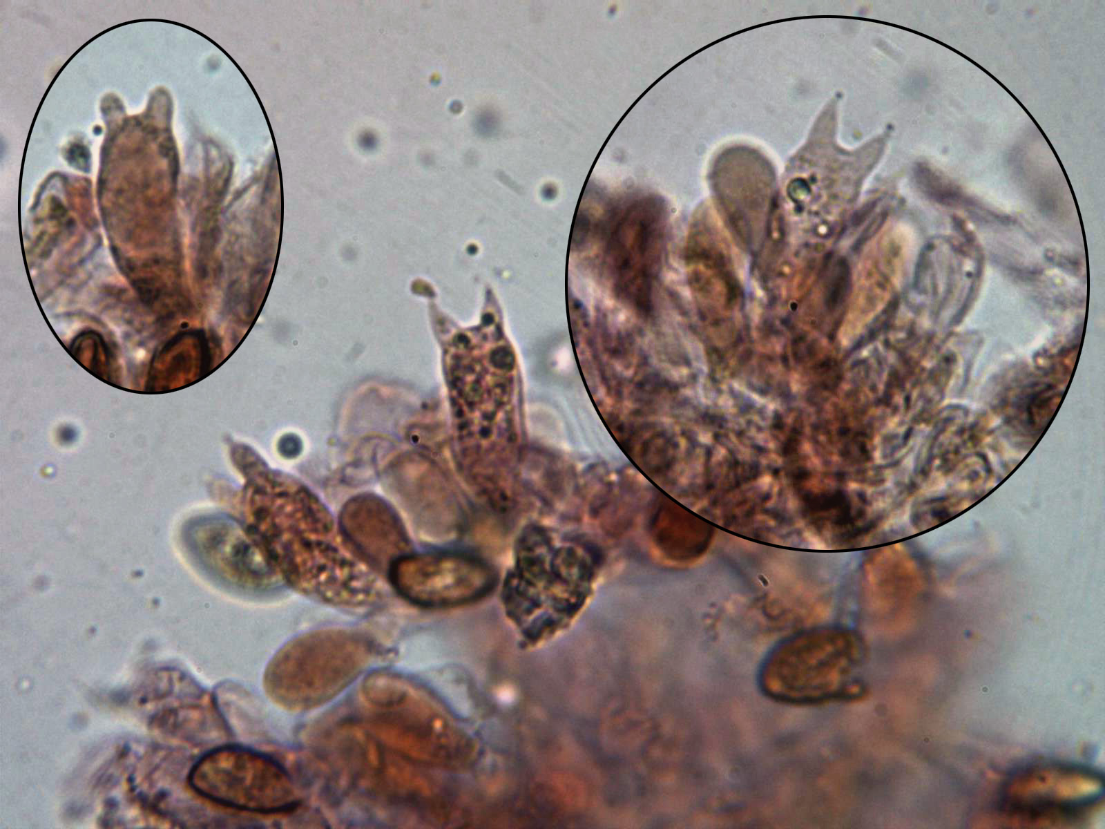 Todos los basidios que pude observar bispóricos. Basidios cilíndricos, solo ligeramente ensanchados en el ápice con dos gruesos esterigmas.