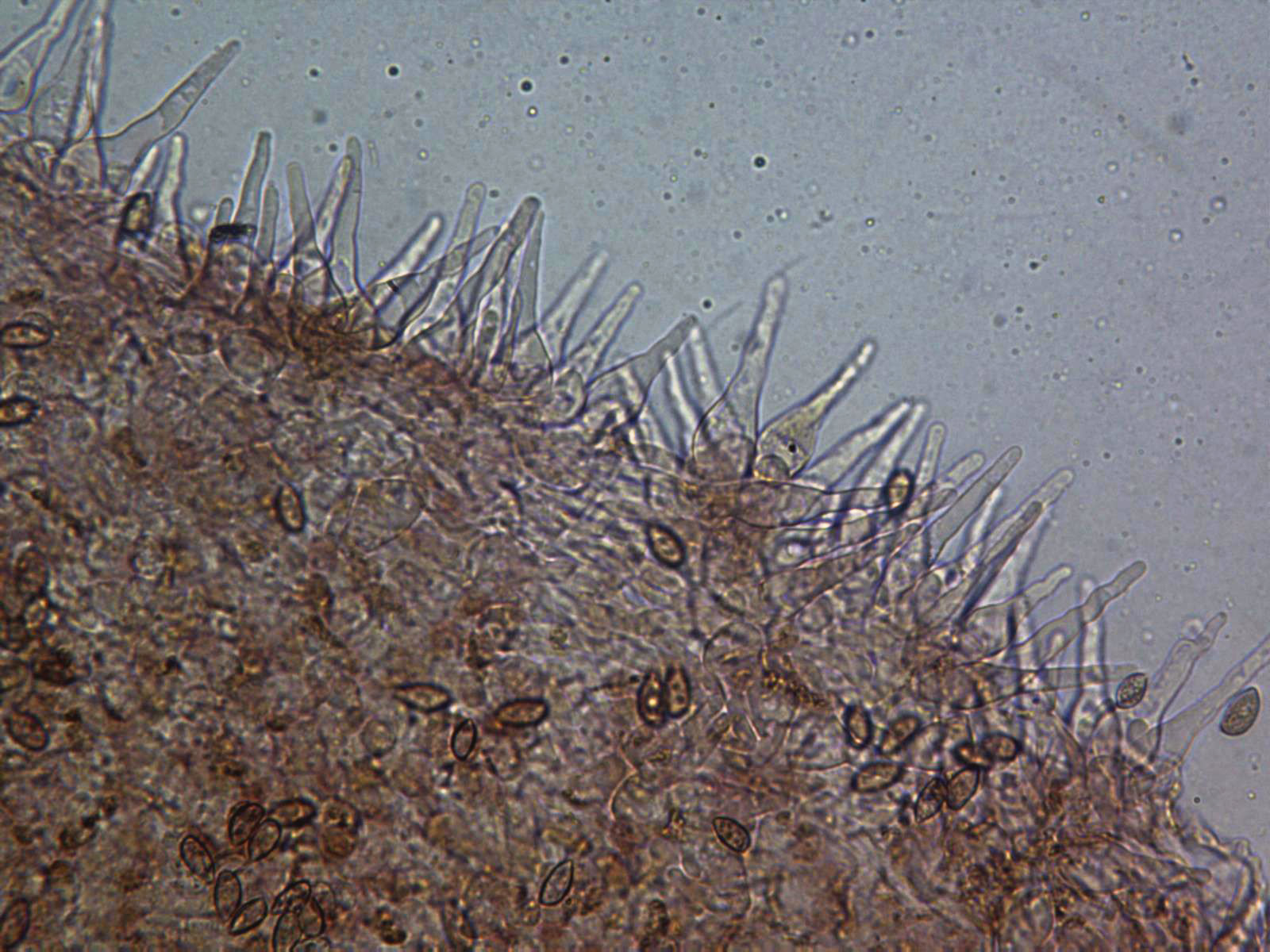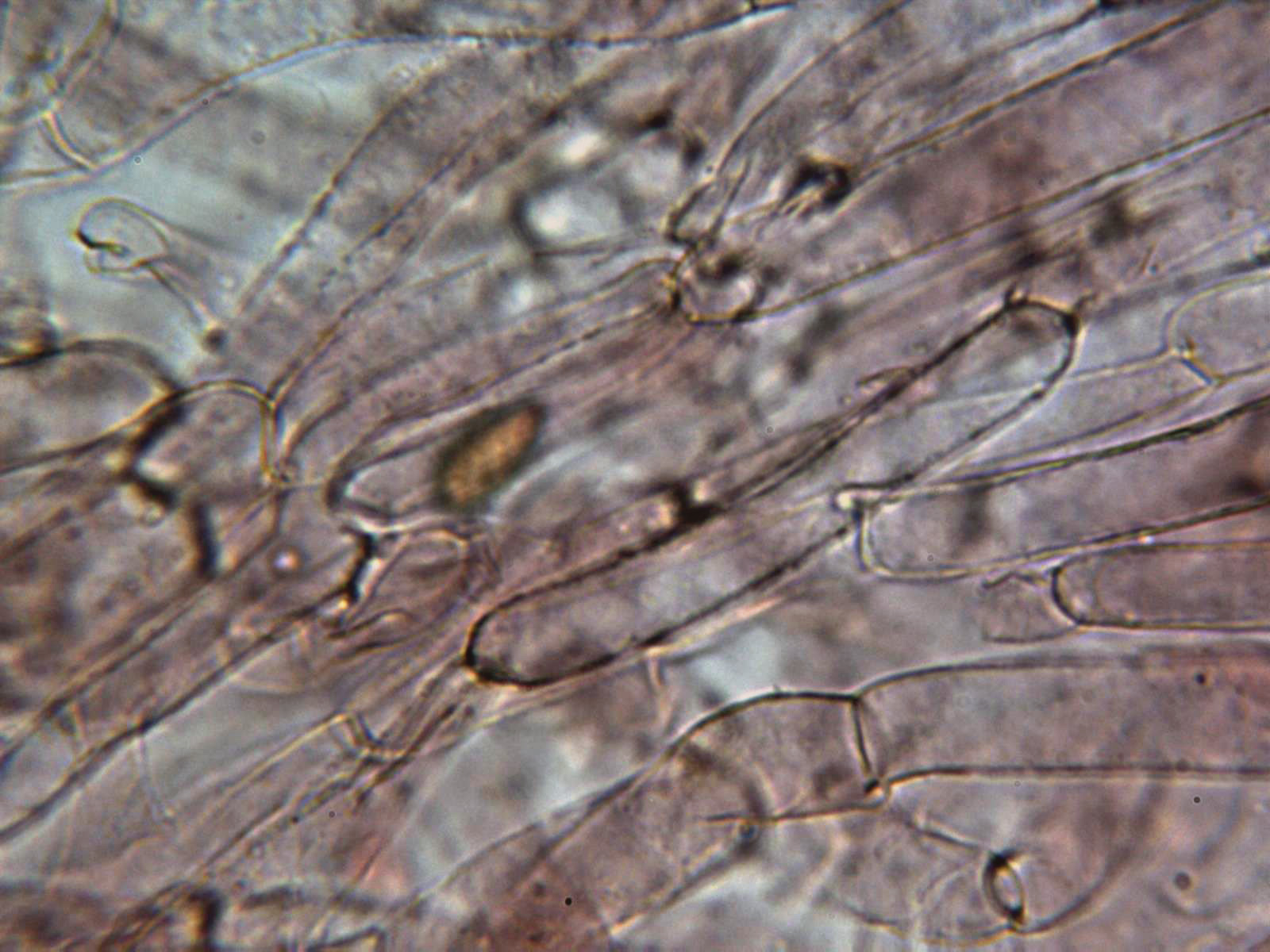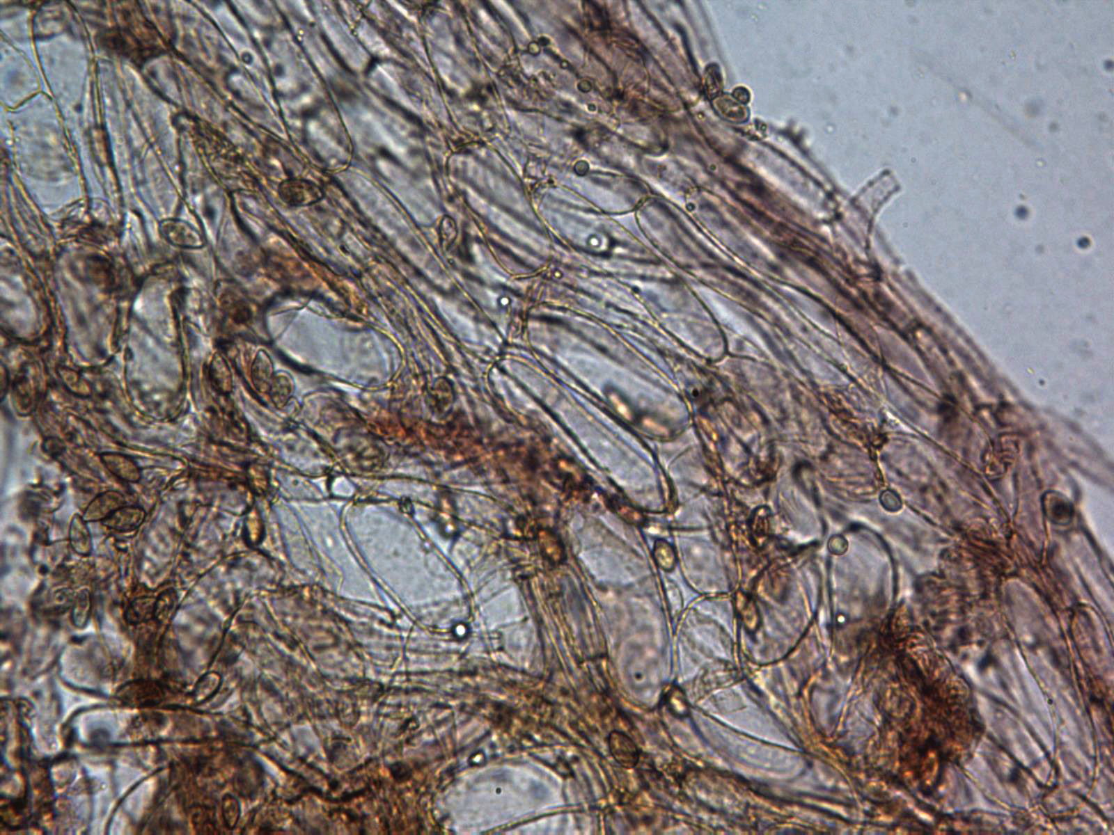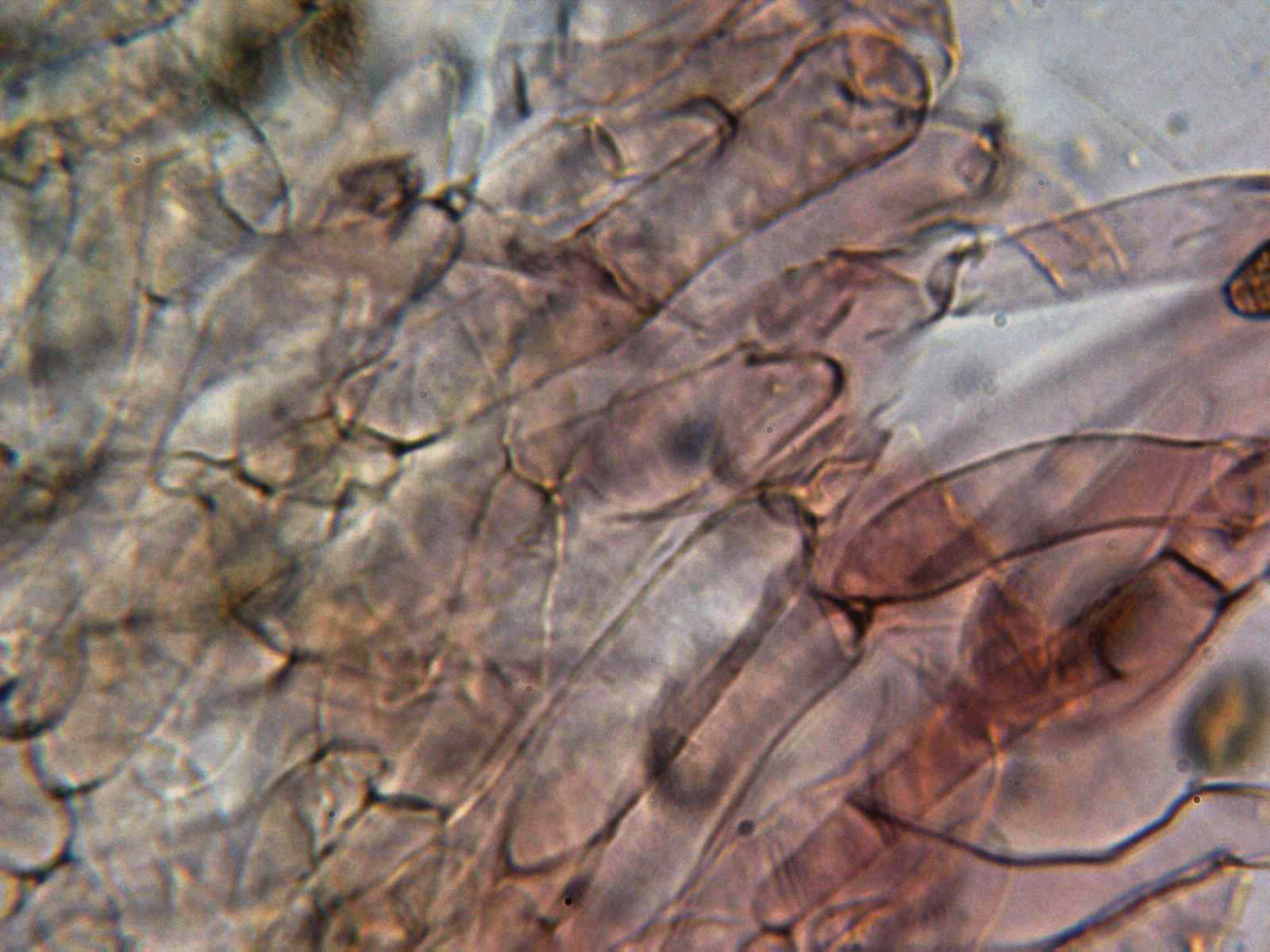 Cutícula formada por hifas entremezcladas, ligeramente pigmentadas y provistas de pequeñas fíbulas (se aprecian bien en la última imágen).