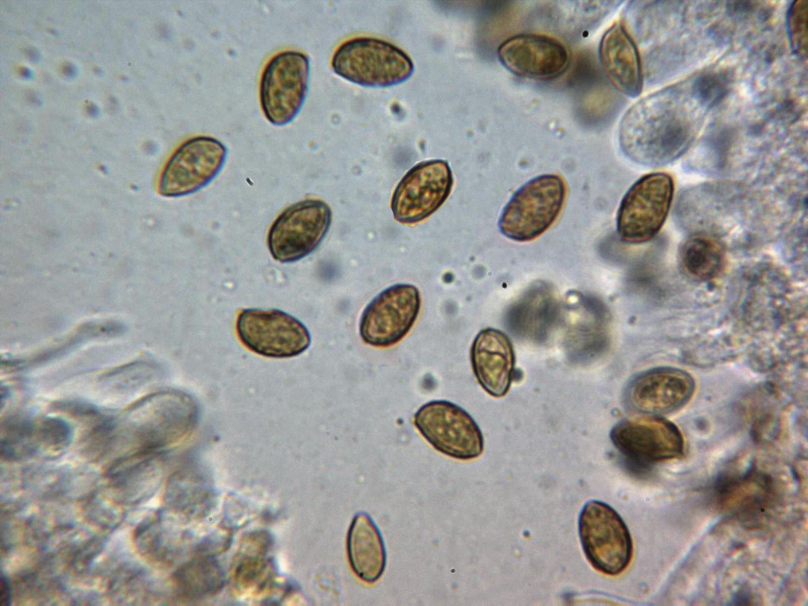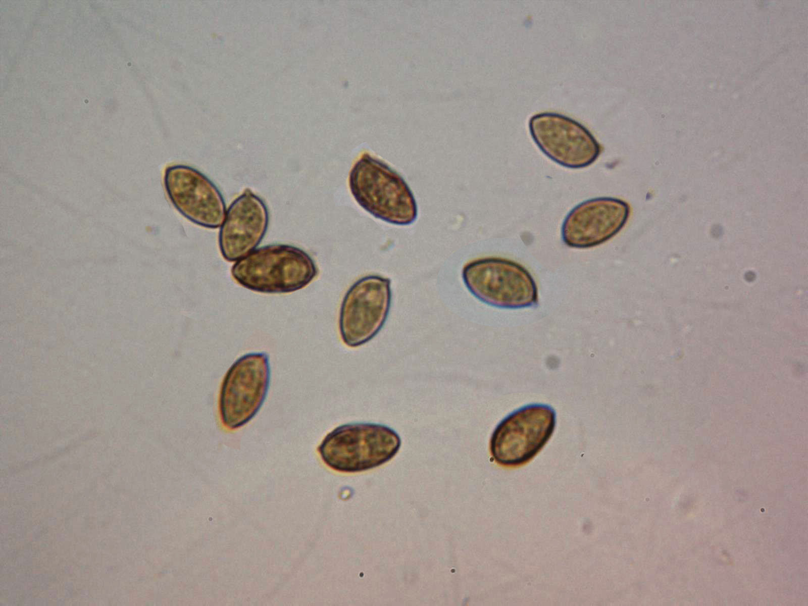 Esporas en Rojo Congo diluido, las medidas de 9,4;11 X 5,7;6,7 micras.