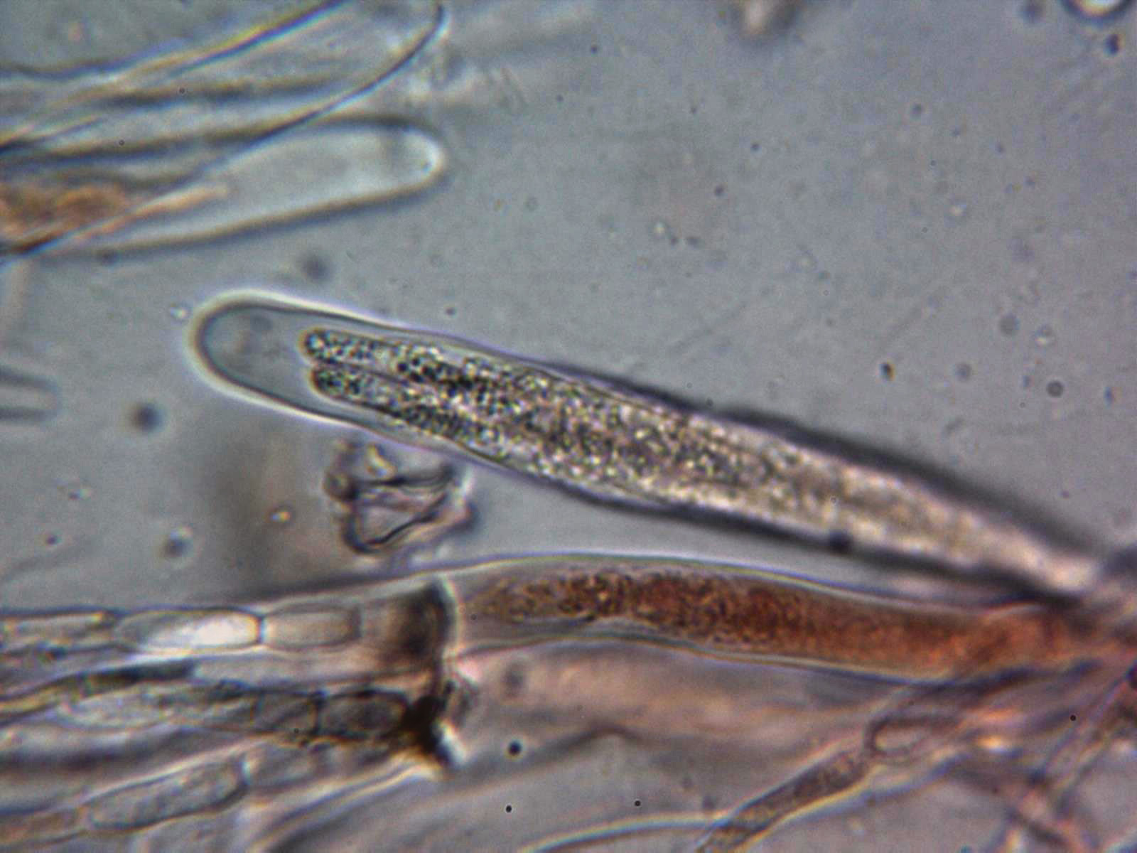 Ascas que según la poca bibliografía existente consultada podrían ser bispóricas, con solo 2 esporas por asca, en mi estudio pude observar ascas con 3 y hasta alguna que al parecer podría contener 4 esporas, aunque de difícil apreciación ya que las esporas están entrelazadas dentro del asca.