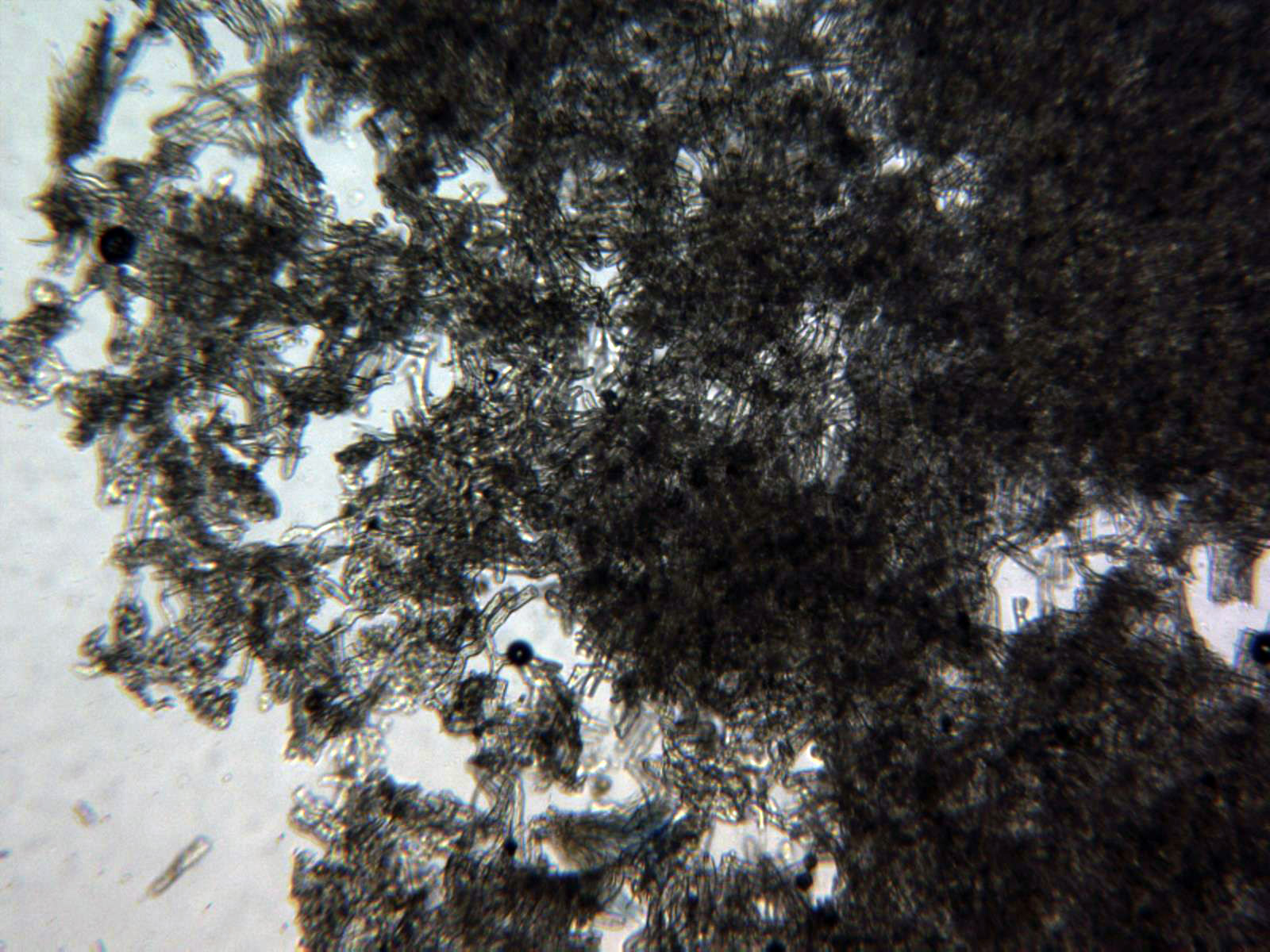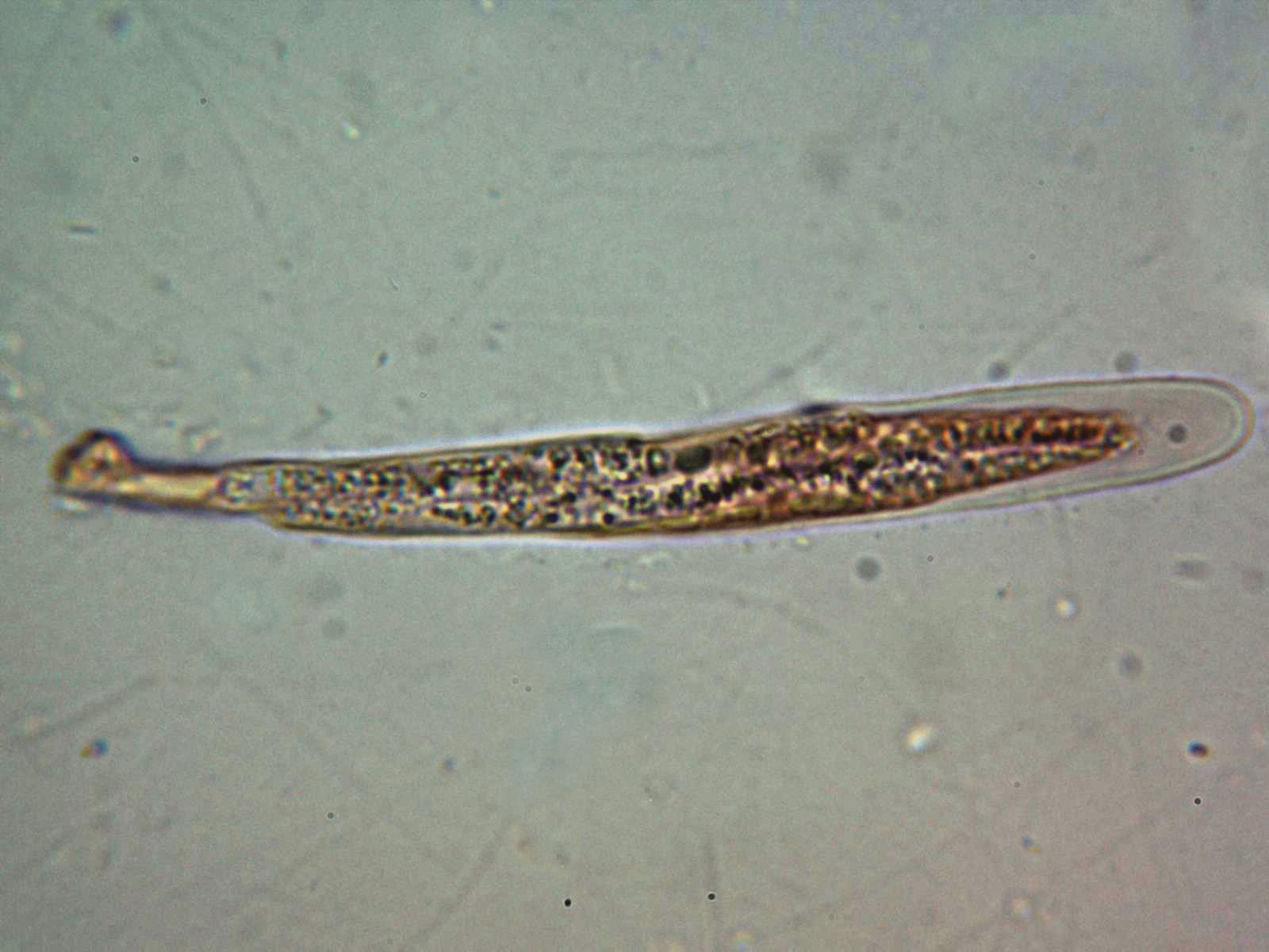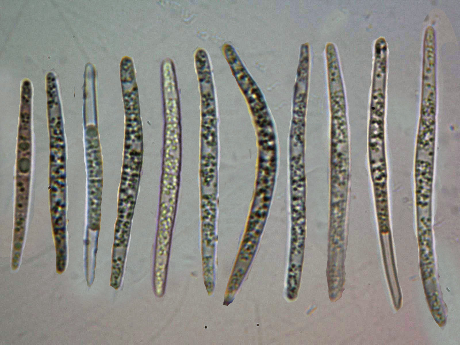 Esporas en Rojo Congo muy diluido, cilíndricas, alargadas y terminando en formas redondeadas, con contenido granuloso en su interior, las medidas de estas de entre 44 y 69 micras de largo por tan solo entre 3,7 a 4,7 micras de ancho.